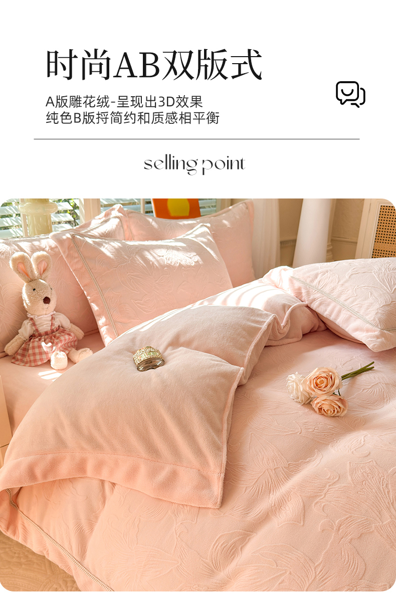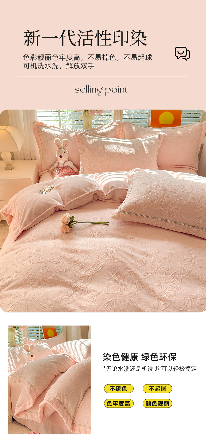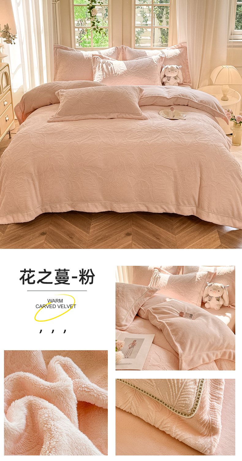 商品名称:艾唯希家纺 2025新款全消光雕花绒织带款四件套牛奶绒-雕花织带系列 百年好合-粉