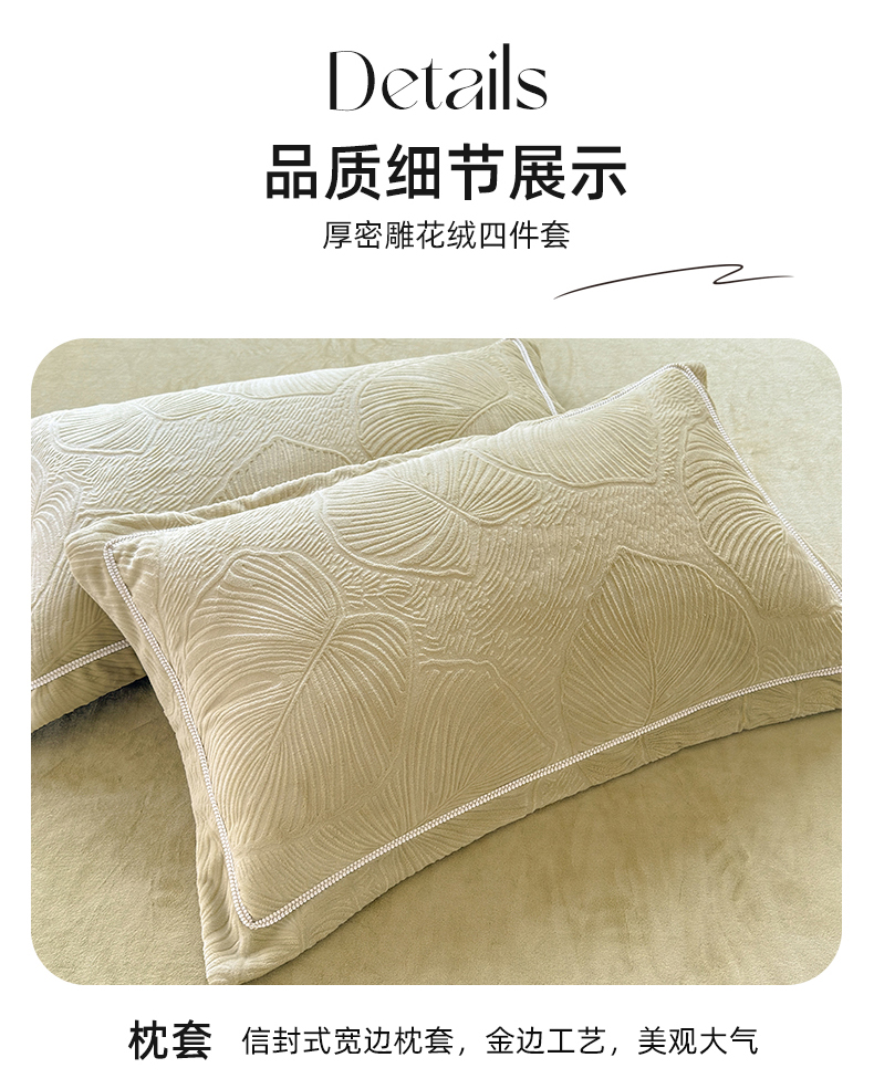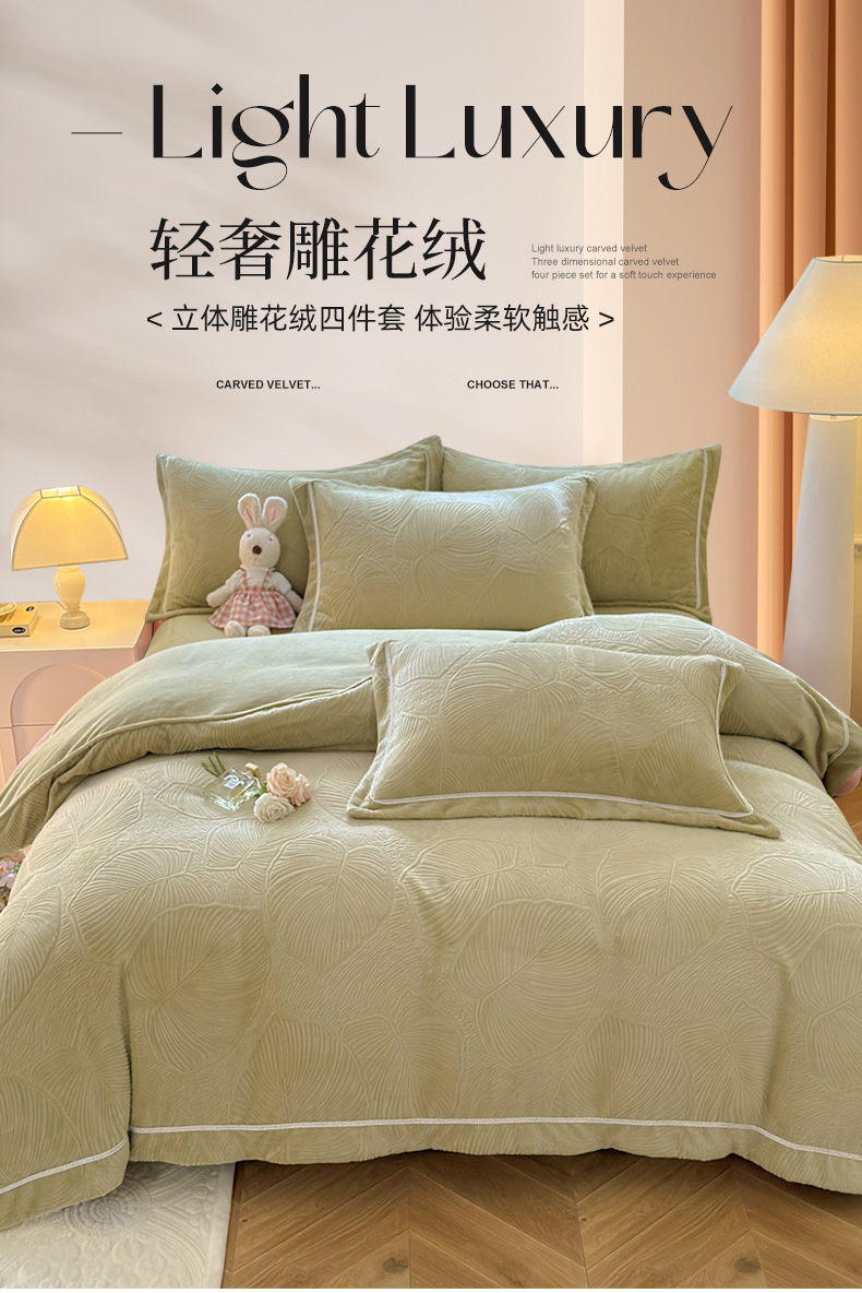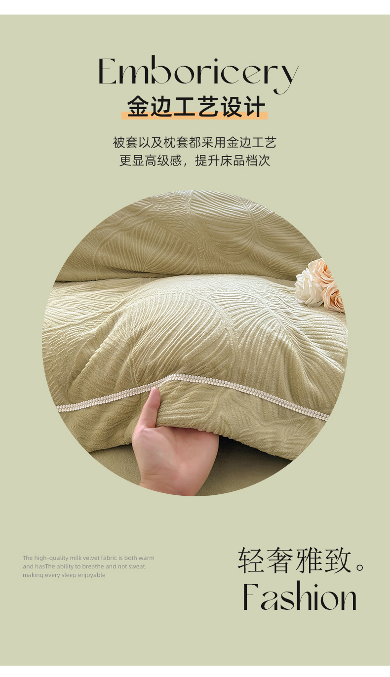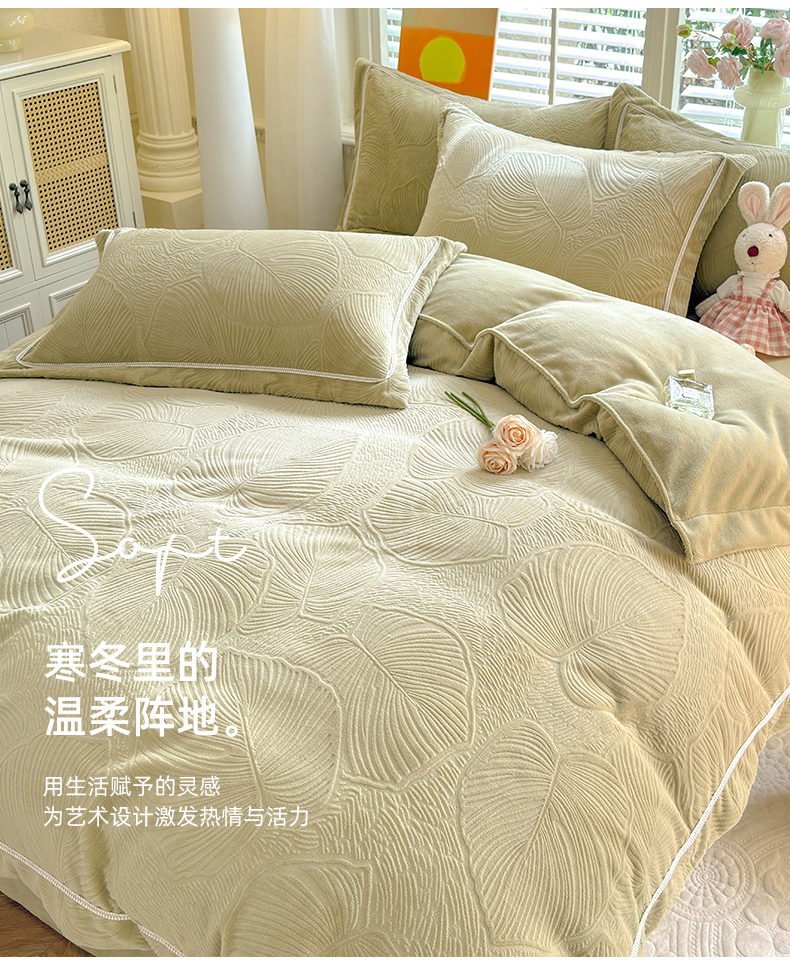 艾唯希家纺 2025新款全消光雕花绒织带款四件套牛奶绒-雕花织带系列 叶舞悠然-绿