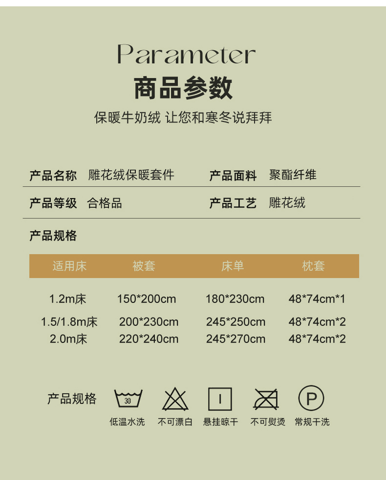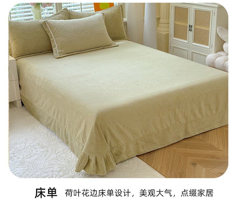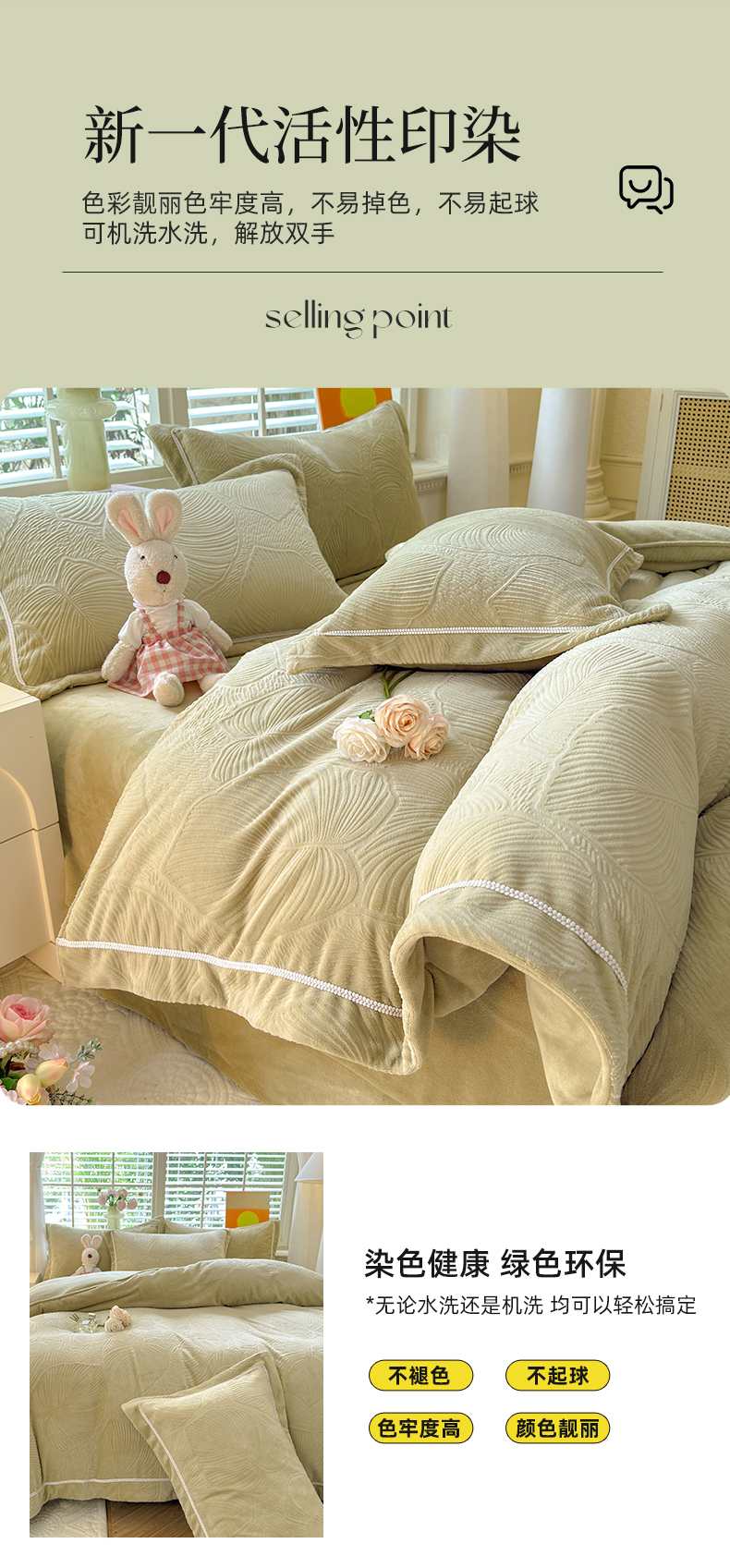 商品名称:艾唯希家纺 2025新款全消光雕花绒织带款四件套牛奶绒-雕花织带系列 叶舞悠然-绿