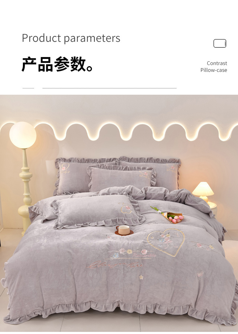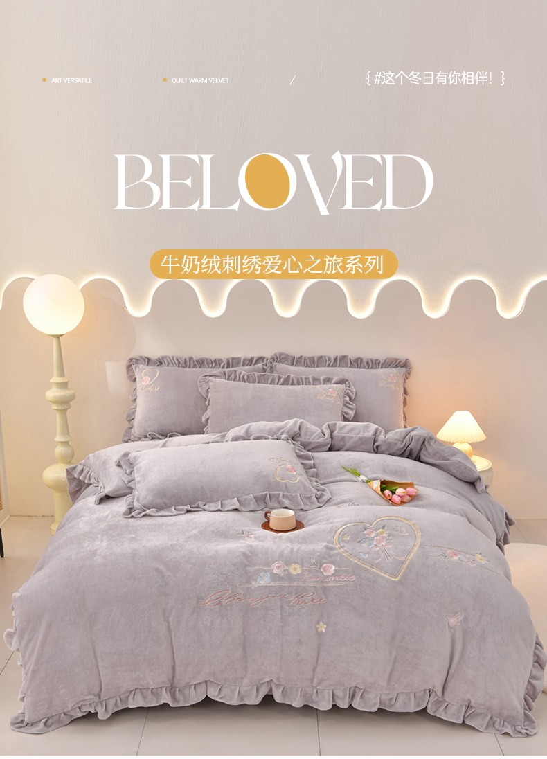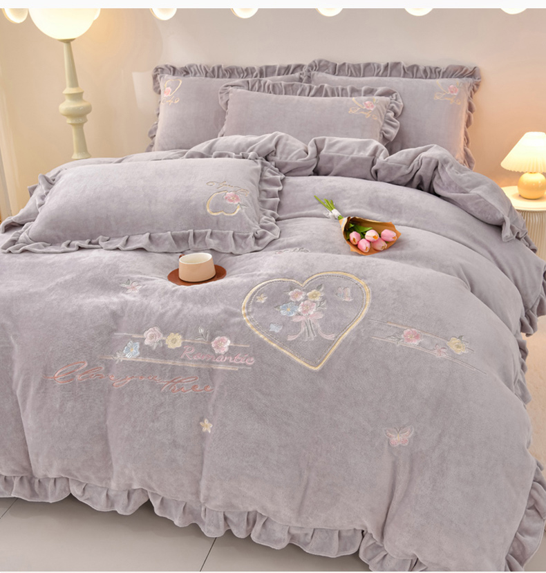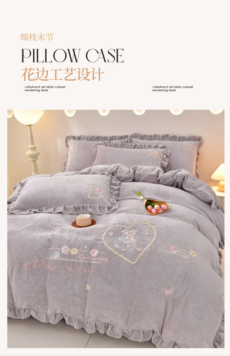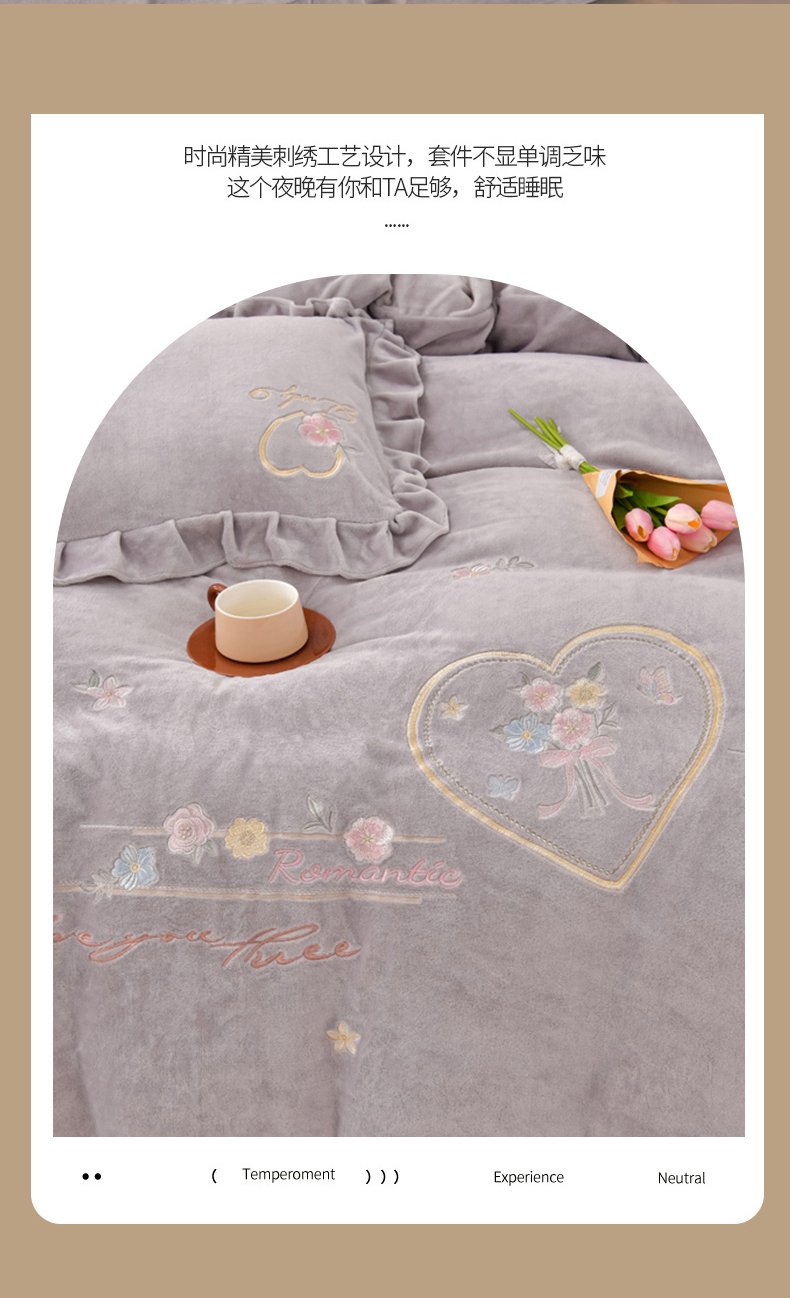 商品名称:畅畅家纺 2025新款亲肤舒适冬季刺绣花边保暖牛奶绒四件套-爱心之旅 爱心之旅-灰