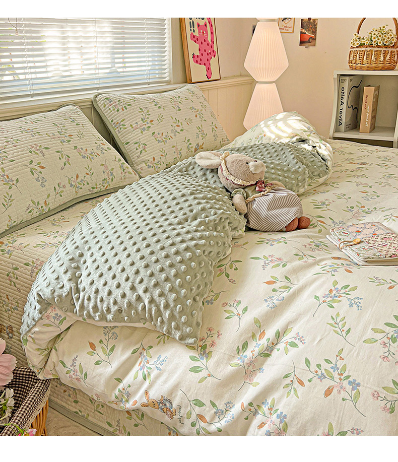 漫时光 2025新款正面纯棉反面宝宝绒印花夹棉砂洗床盖四件套 风铃小兔