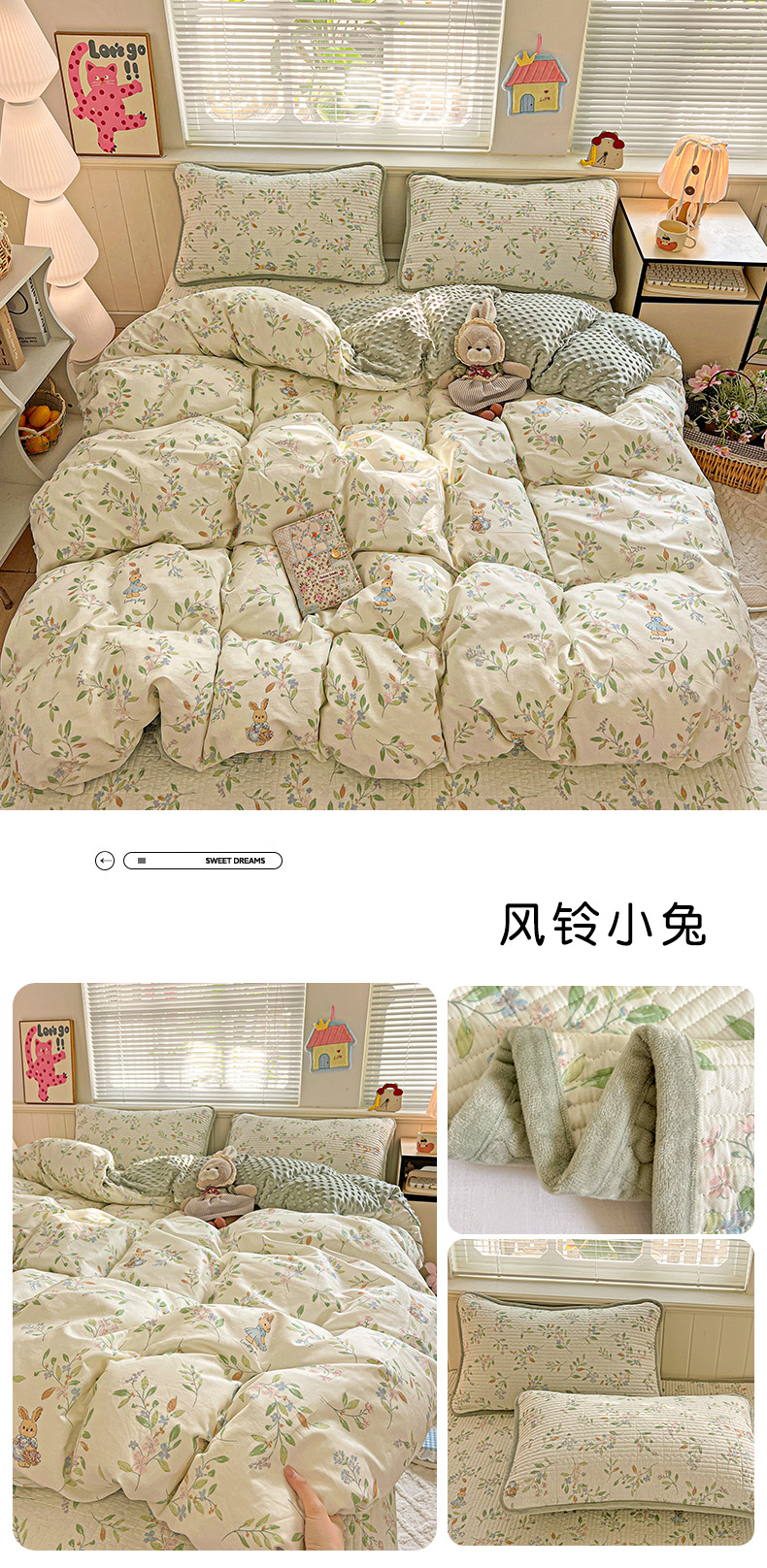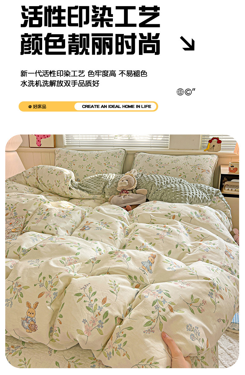 商品名称:漫时光 2025新款正面纯棉反面宝宝绒印花夹棉砂洗床盖四件套 风铃小兔