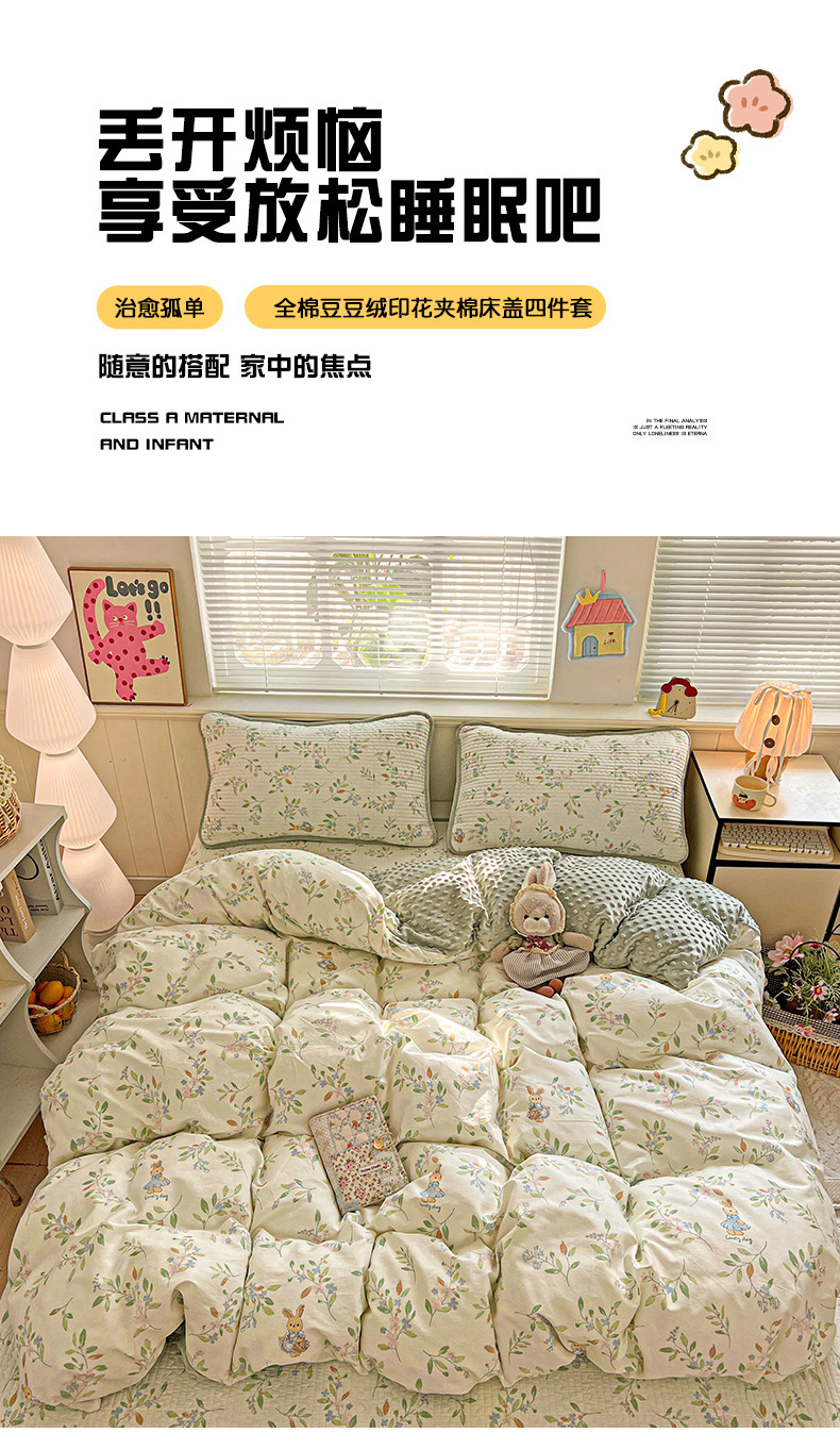 (总)漫时光 2025新款正面纯棉反面宝宝绒印花夹棉砂洗床盖四件套,班尼熊,曲奇小狗,条纹熊,蕾丝小狗,汪汪曲,开心屋,小狗日记,花园兔,小伙伴,花间小兔,小熊猫,风铃小兔,猫咪派对