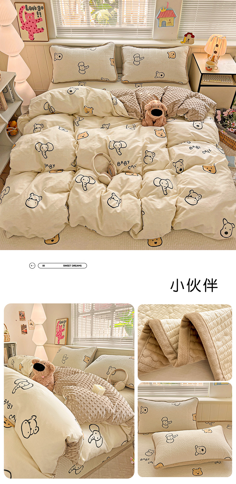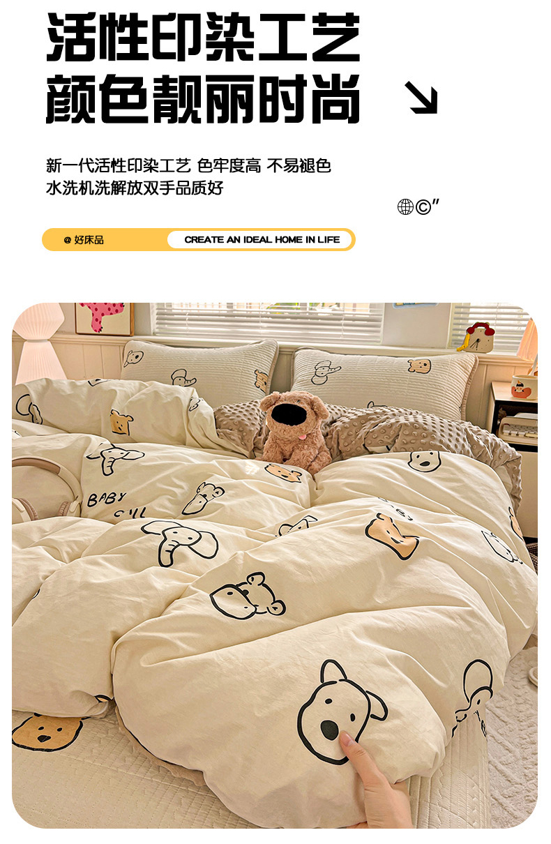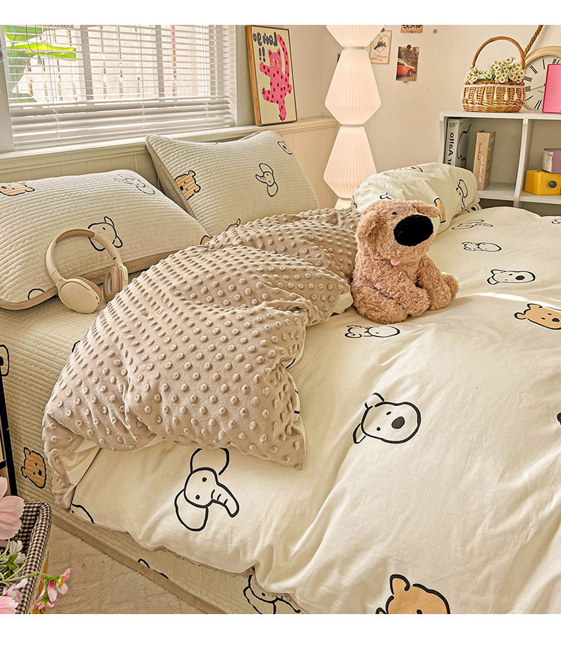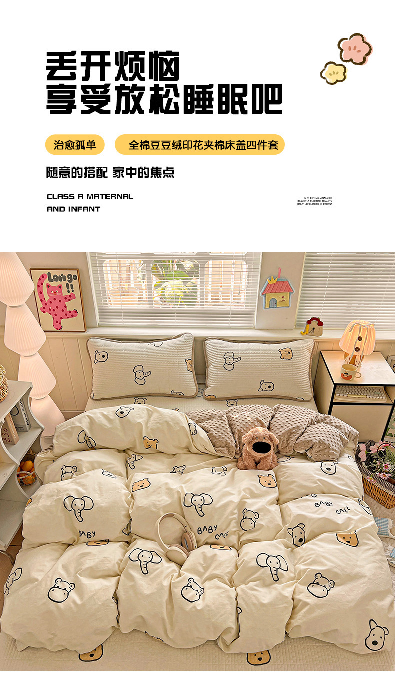 (总)漫时光 2025新款正面纯棉反面宝宝绒印花夹棉砂洗床盖四件套,班尼熊,曲奇小狗,条纹熊,蕾丝小狗,汪汪曲,开心屋,小狗日记,花园兔,小伙伴,花间小兔,小熊猫,风铃小兔,猫咪派对