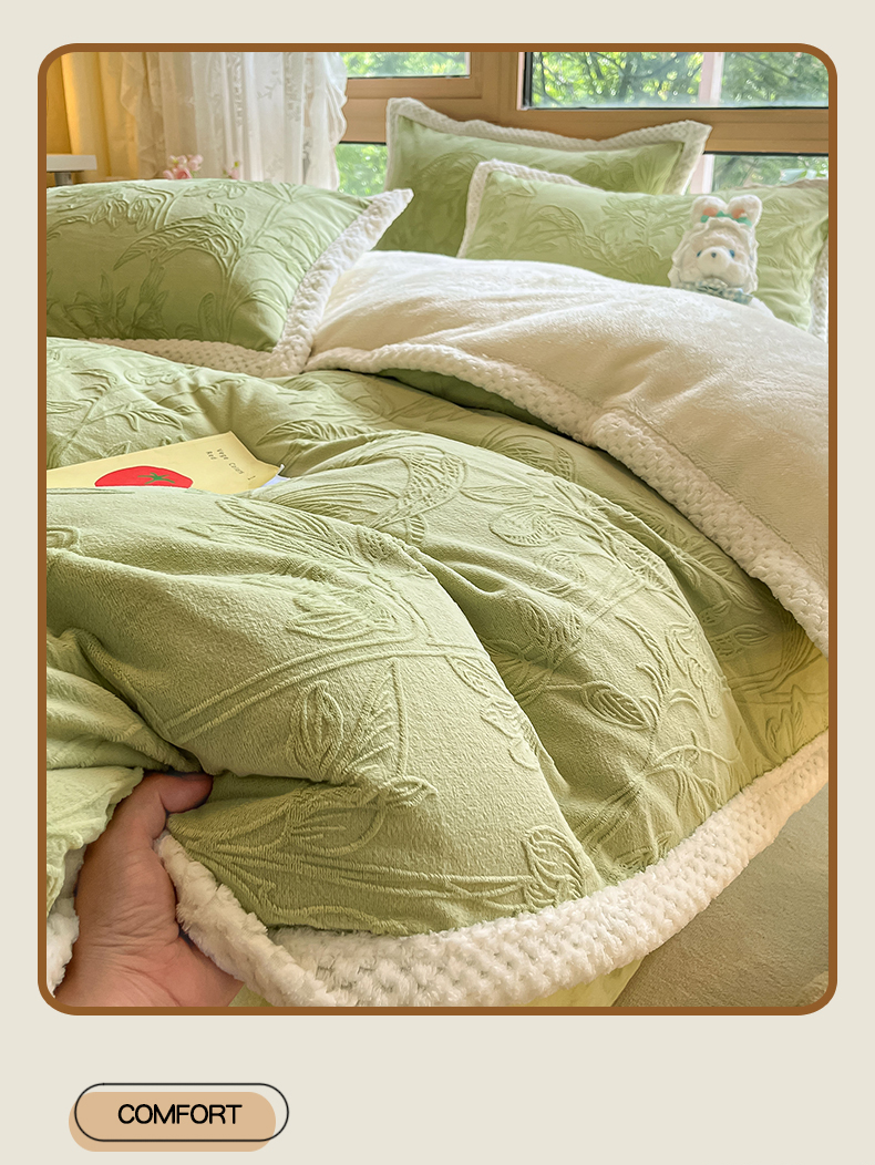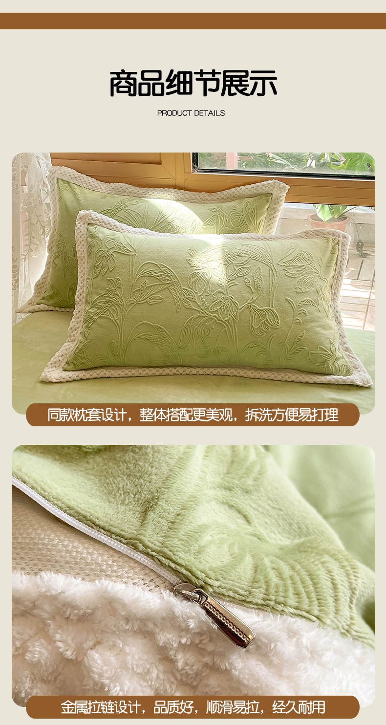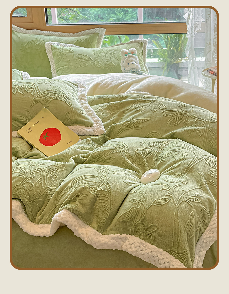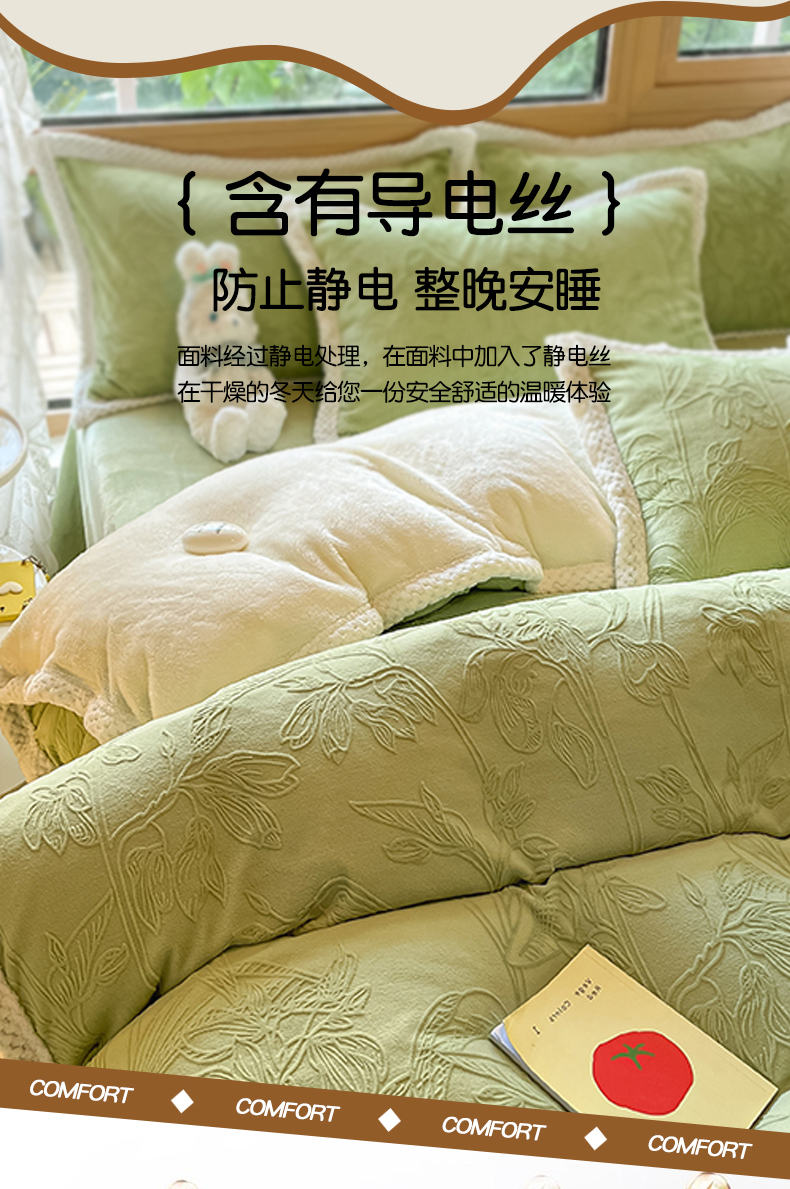 当前位置: 91家纺网 > 商品网购 > 床品套件 > 四件套 > 其它四件套 > 琪格格纺织 2025新款全消光包边立体简约清新雕花绒四件套 雕花包边-枝枝叶叶 浅绿