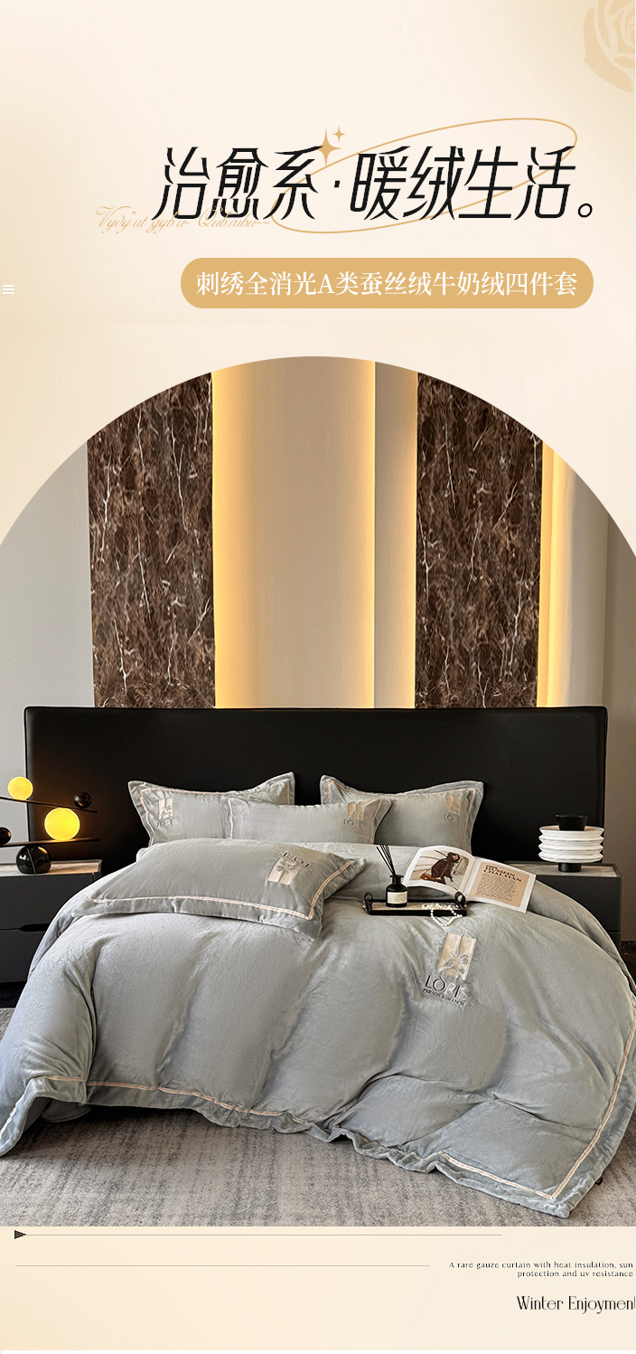 宅家居 2025新款秋冬轻奢小香风刺绣全消光A类高克重牛奶绒四件套-艾菲尔 艾菲尔-深灰