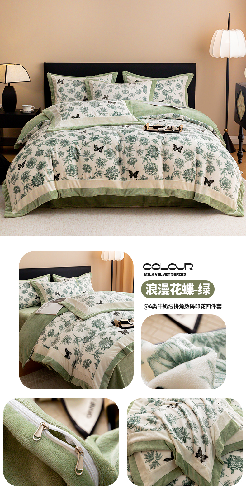 商品名称:懒猫家纺 2025新款牛奶绒拼角印花轻奢风四件套 浪漫花蝶-绿