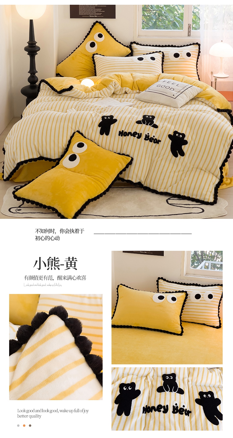 商品名称:(总)炫拼家纺 2025新款大眼萌小熊韩系黑毛球毛巾绣牛奶绒四件套