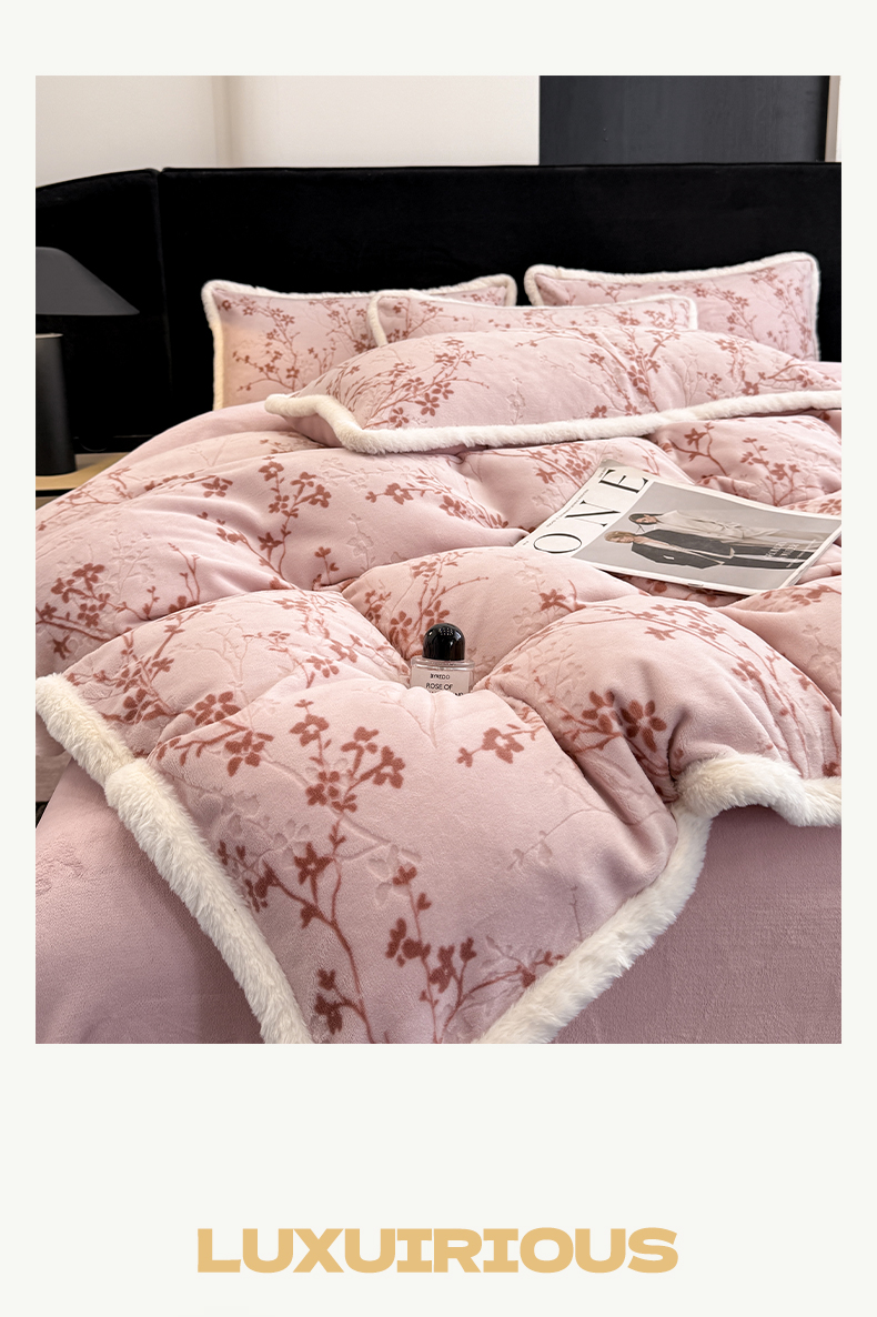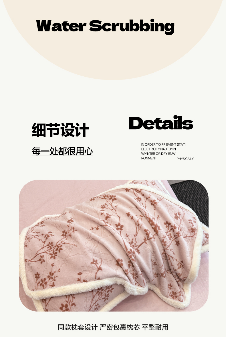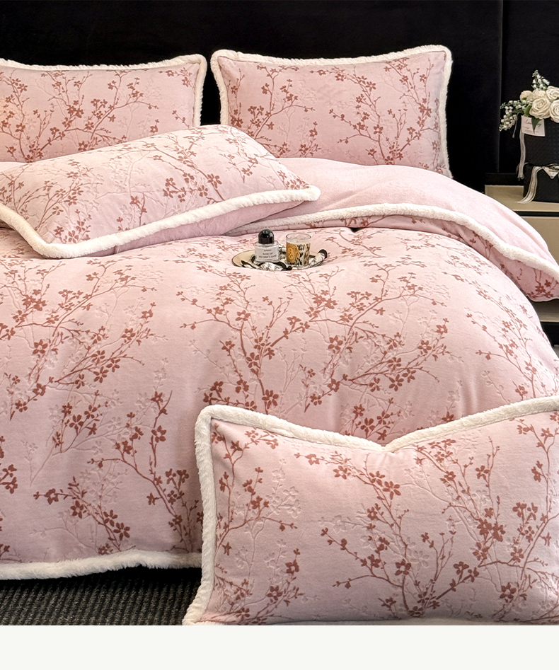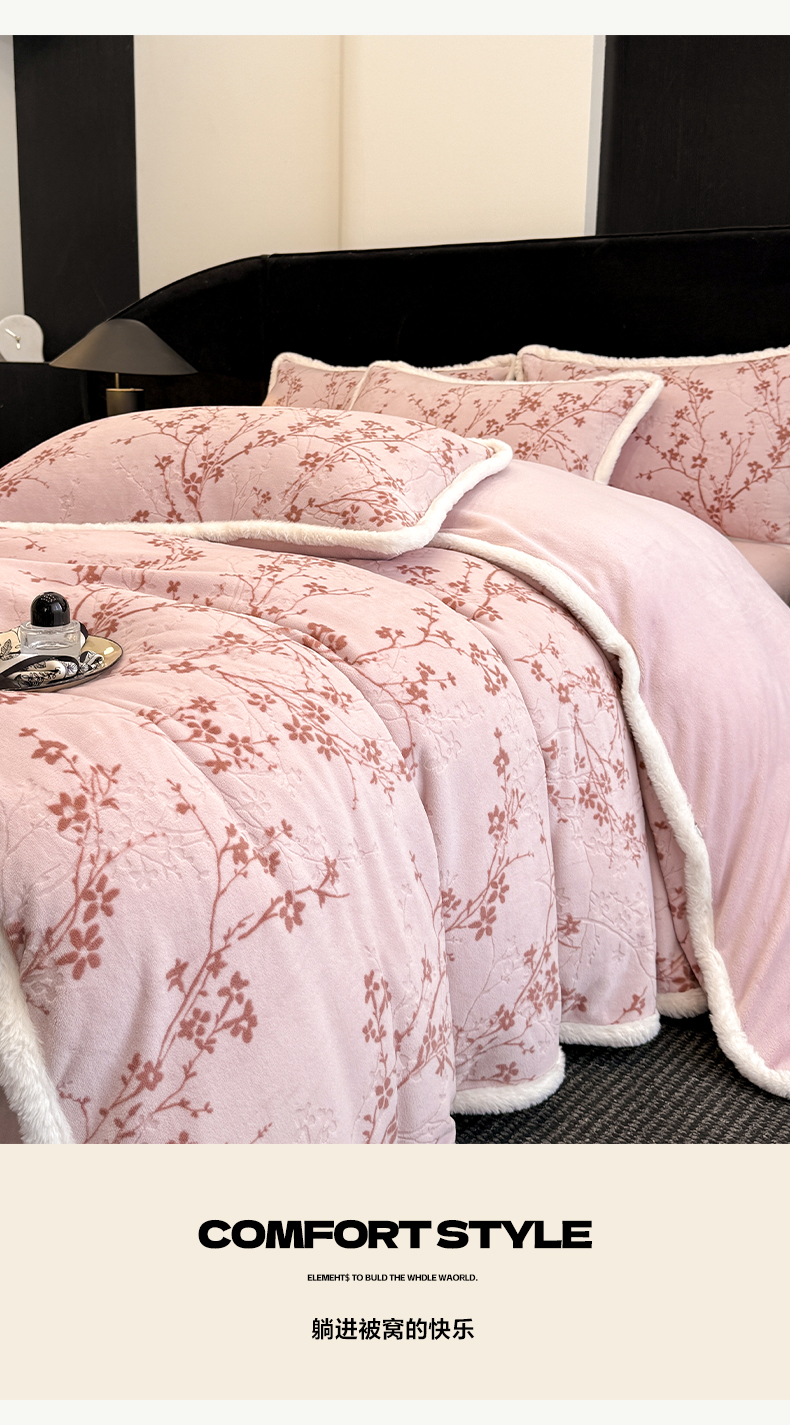 如一 2025新款立体雕花牛奶绒兔毛包边四件套 山茶-粉