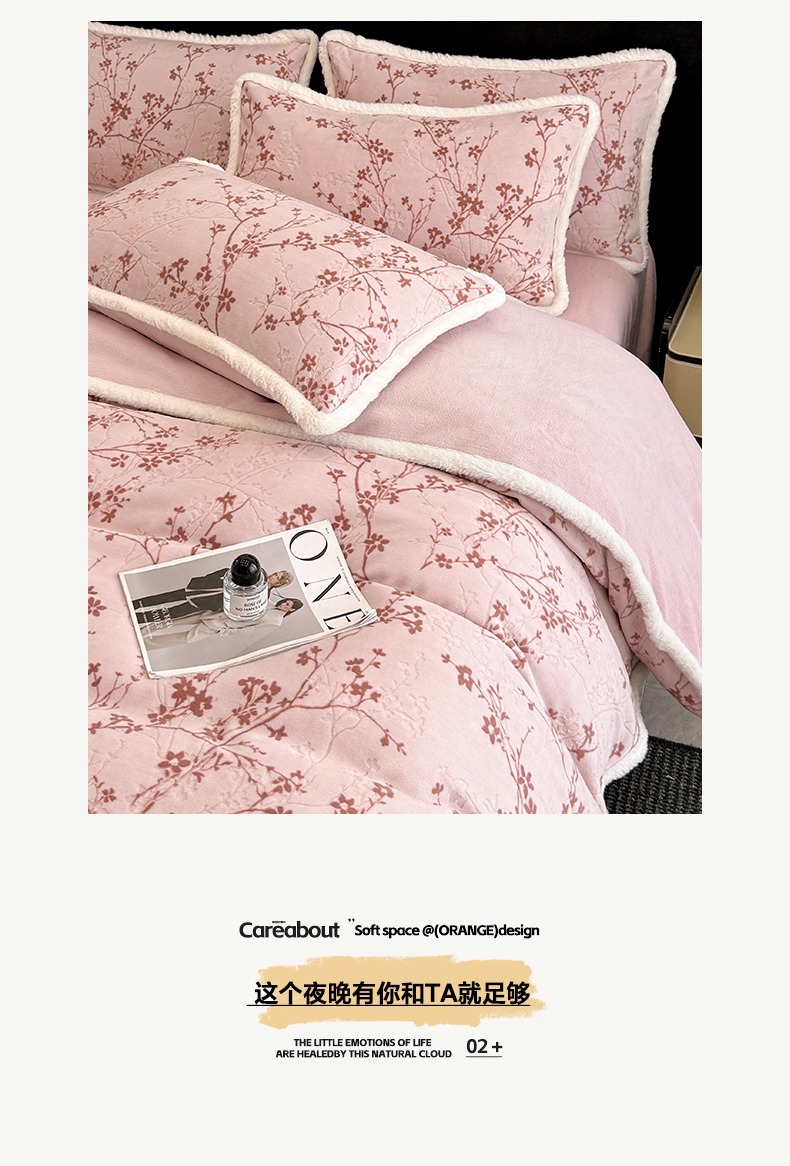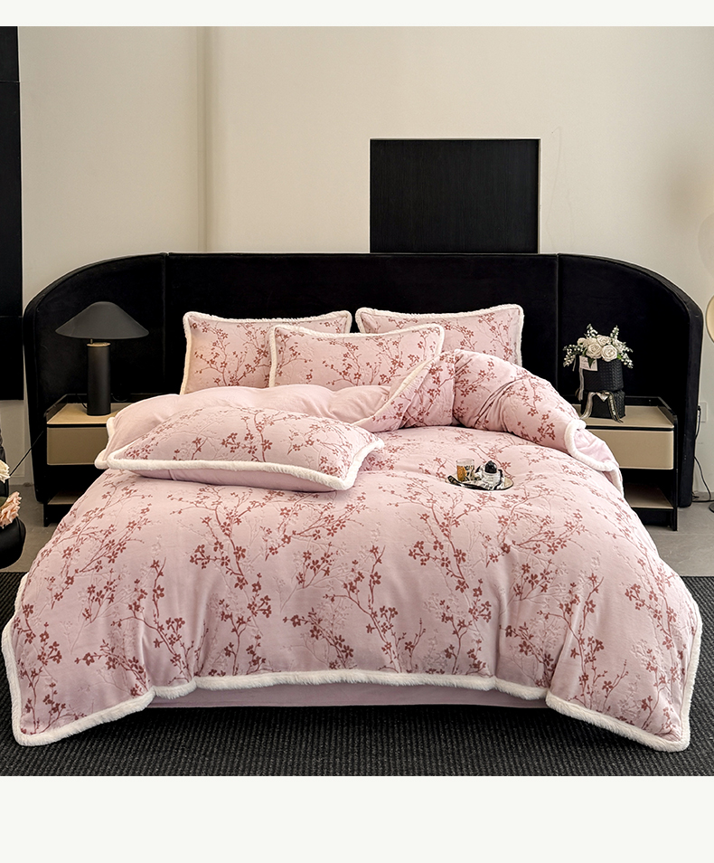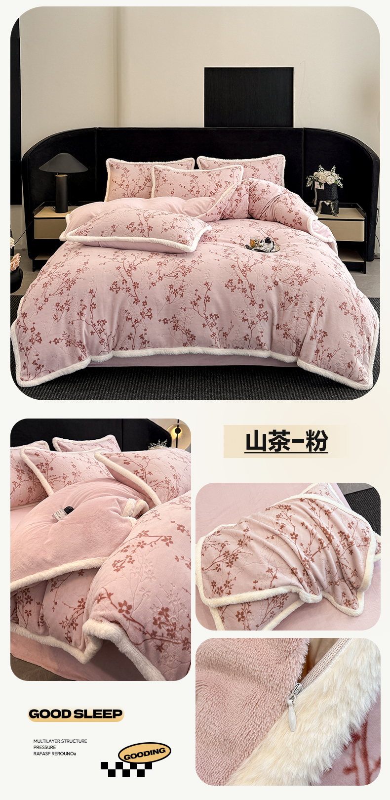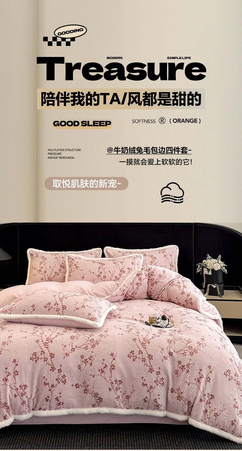商品名称:如一 2025新款立体雕花牛奶绒兔毛包边四件套 山茶-粉