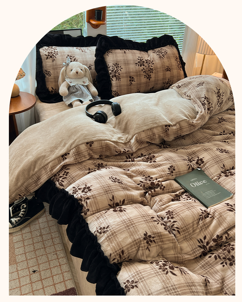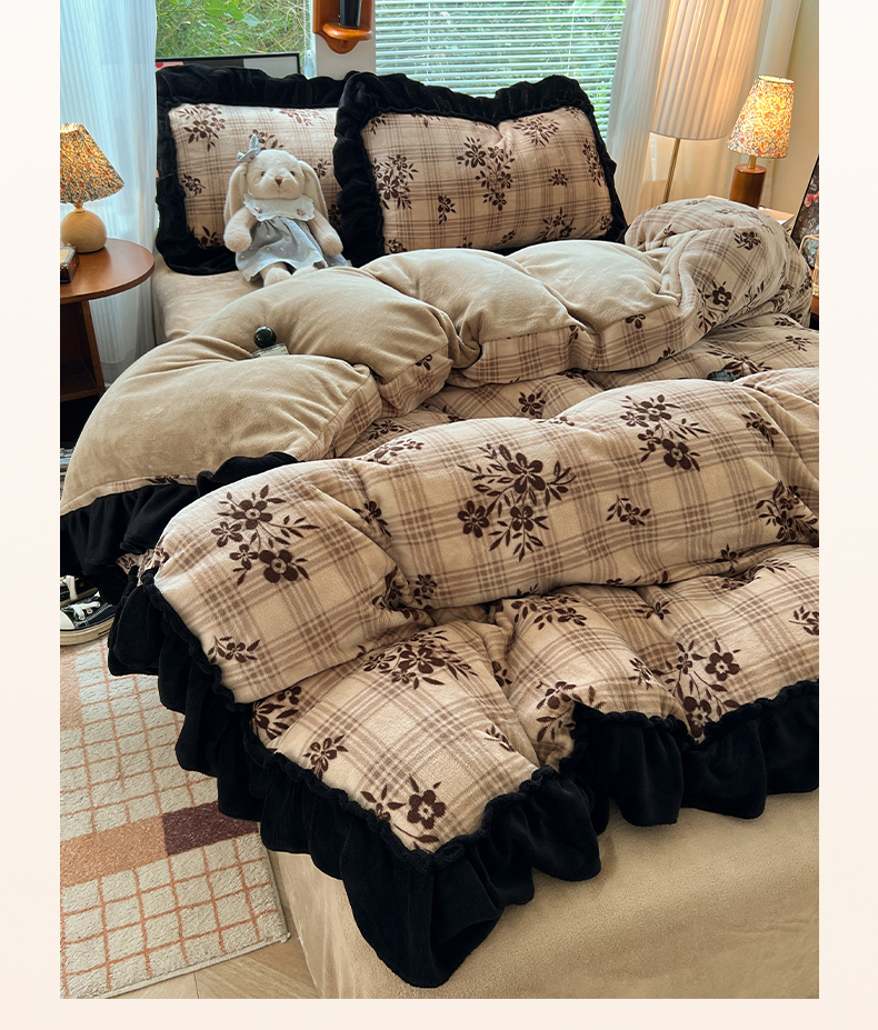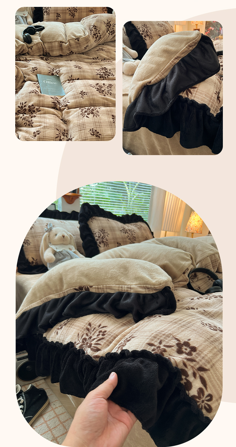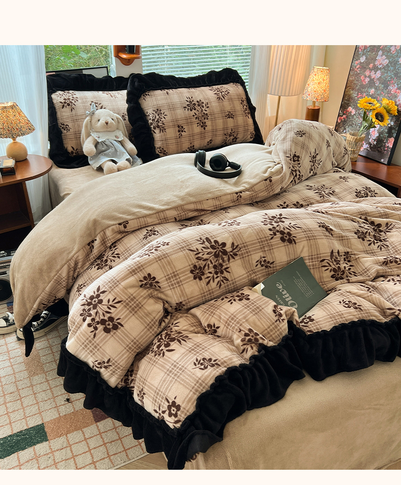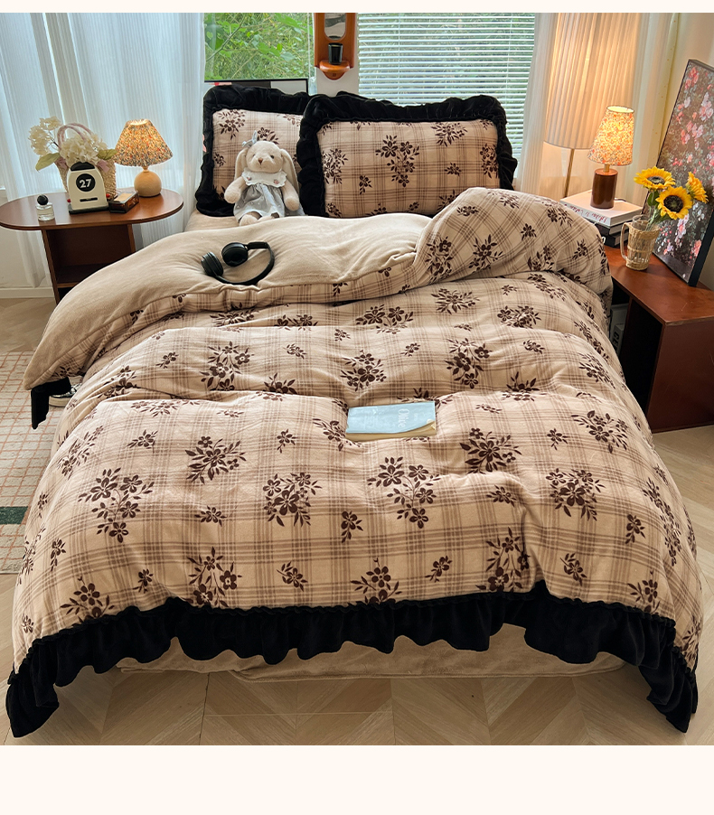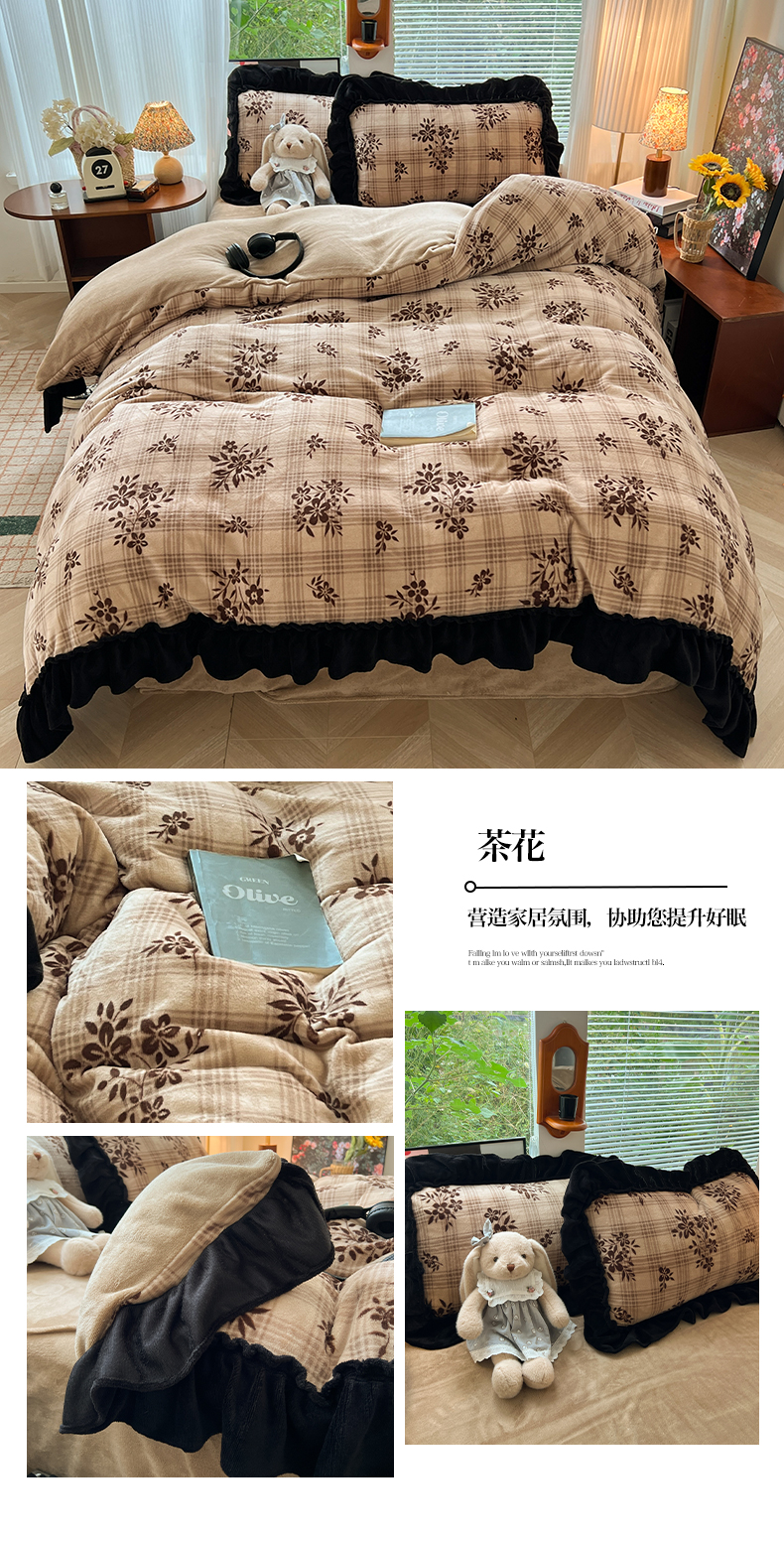 当前位置: 91家纺网 > 商品网购 > 床品套件 > 四件套 > 牛奶绒四件套 > 韩都家居 2025新款法式花边印花牛奶绒四件套 茶花