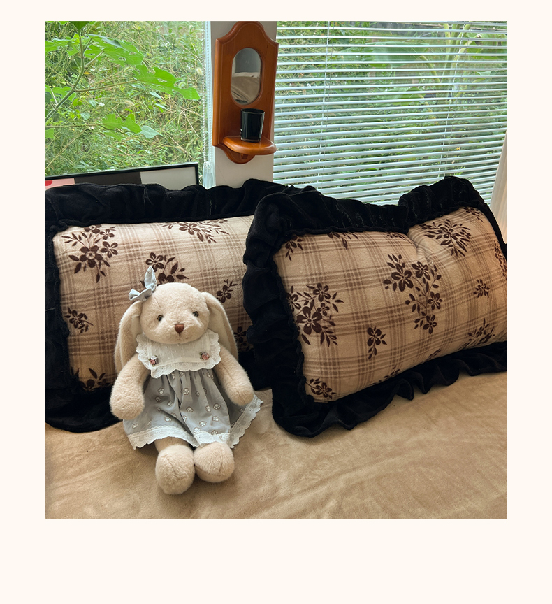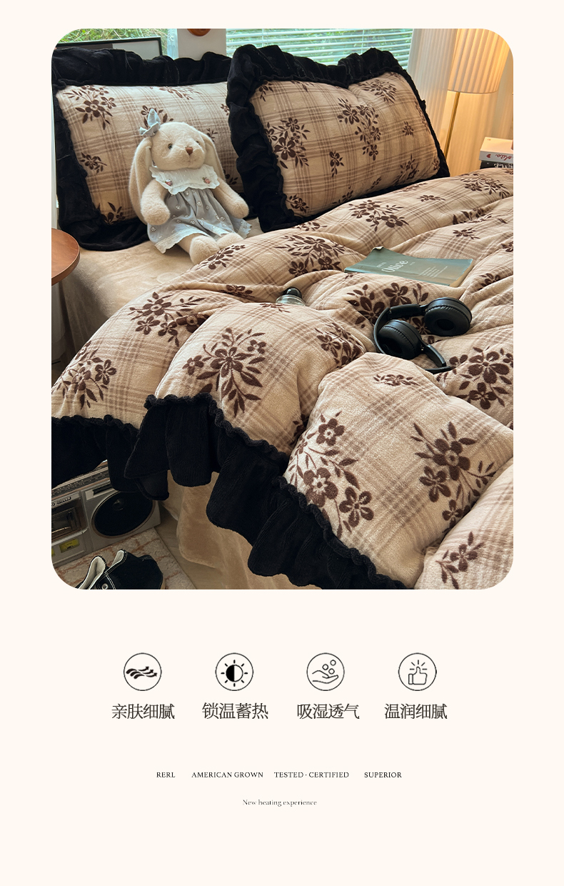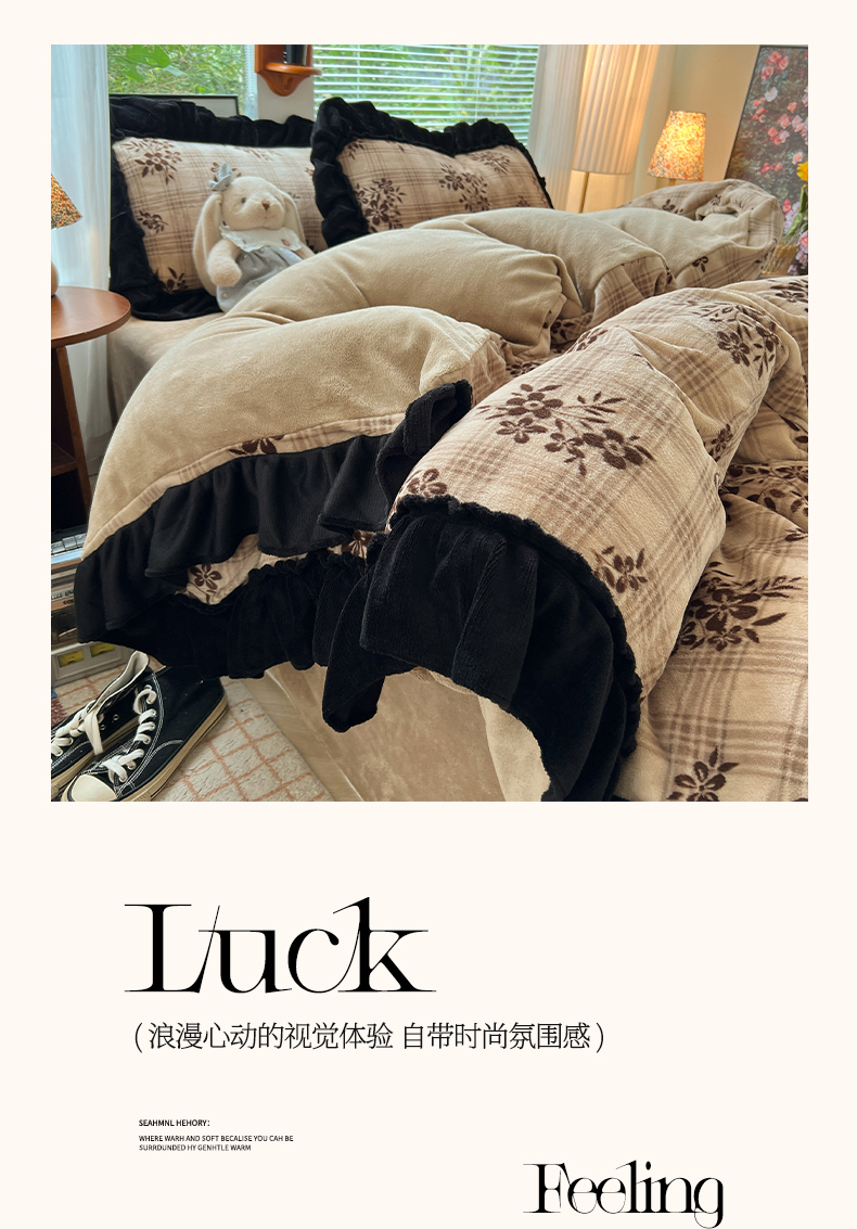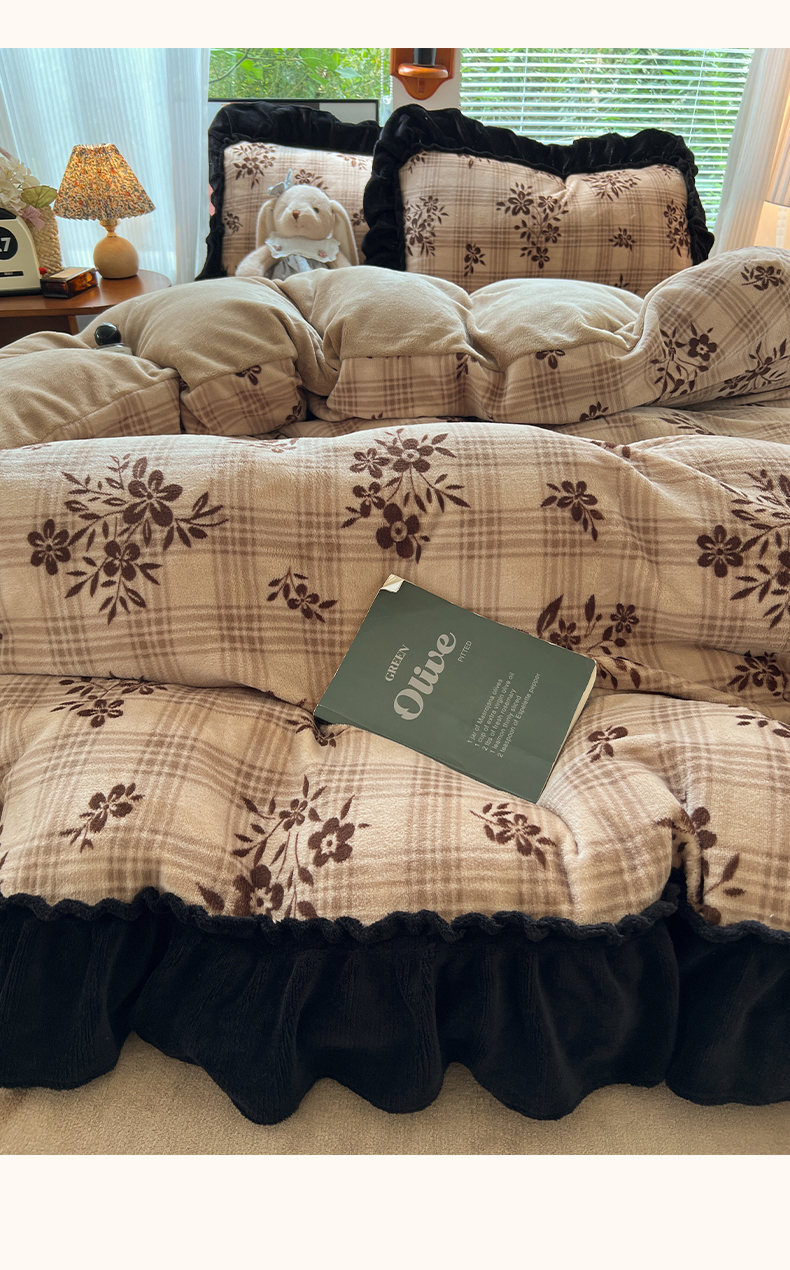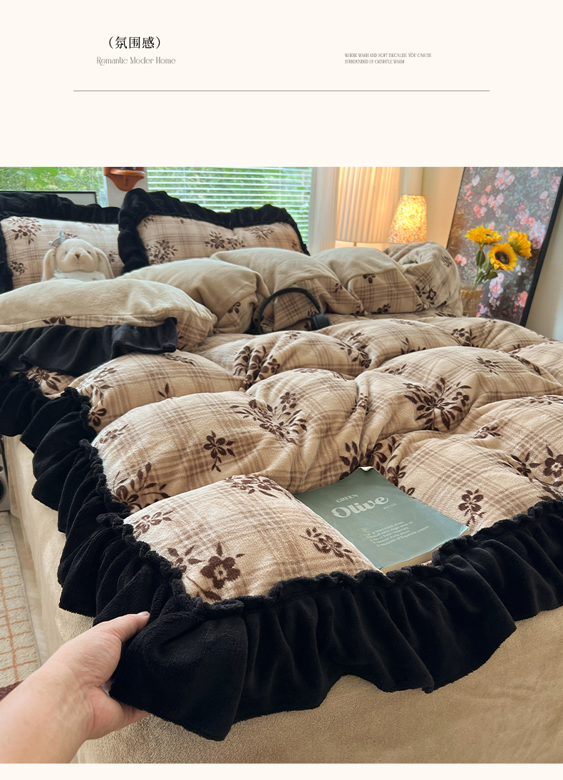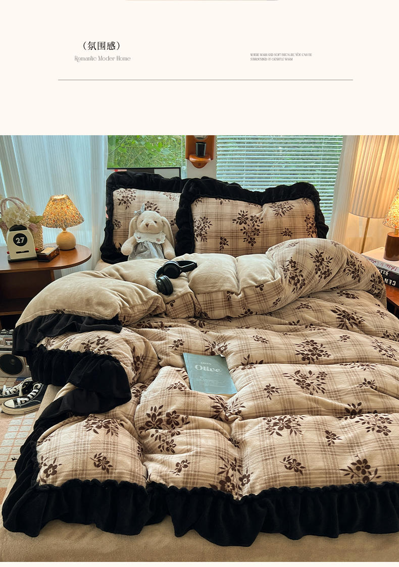 当前位置: 91家纺网 > 商品网购 > 床品套件 > 四件套 > 牛奶绒四件套 > 韩都家居 2025新款法式花边印花牛奶绒四件套 茶花