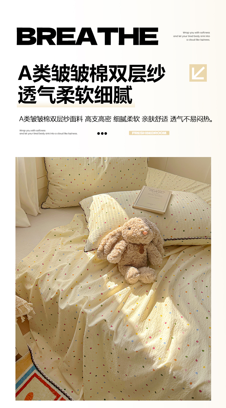 (总)优卡迪家纺馆 2025新款A类全棉镂空花边皱皱棉双层纱四件套,相见欢,花园小兔,蝶舞,繁花,好伙伴,花香浮梦,可比熊,蓝玫之约,流苏,奶油波点,沁园春,盛夏,晚晴,小精灵,长相思,紫薇