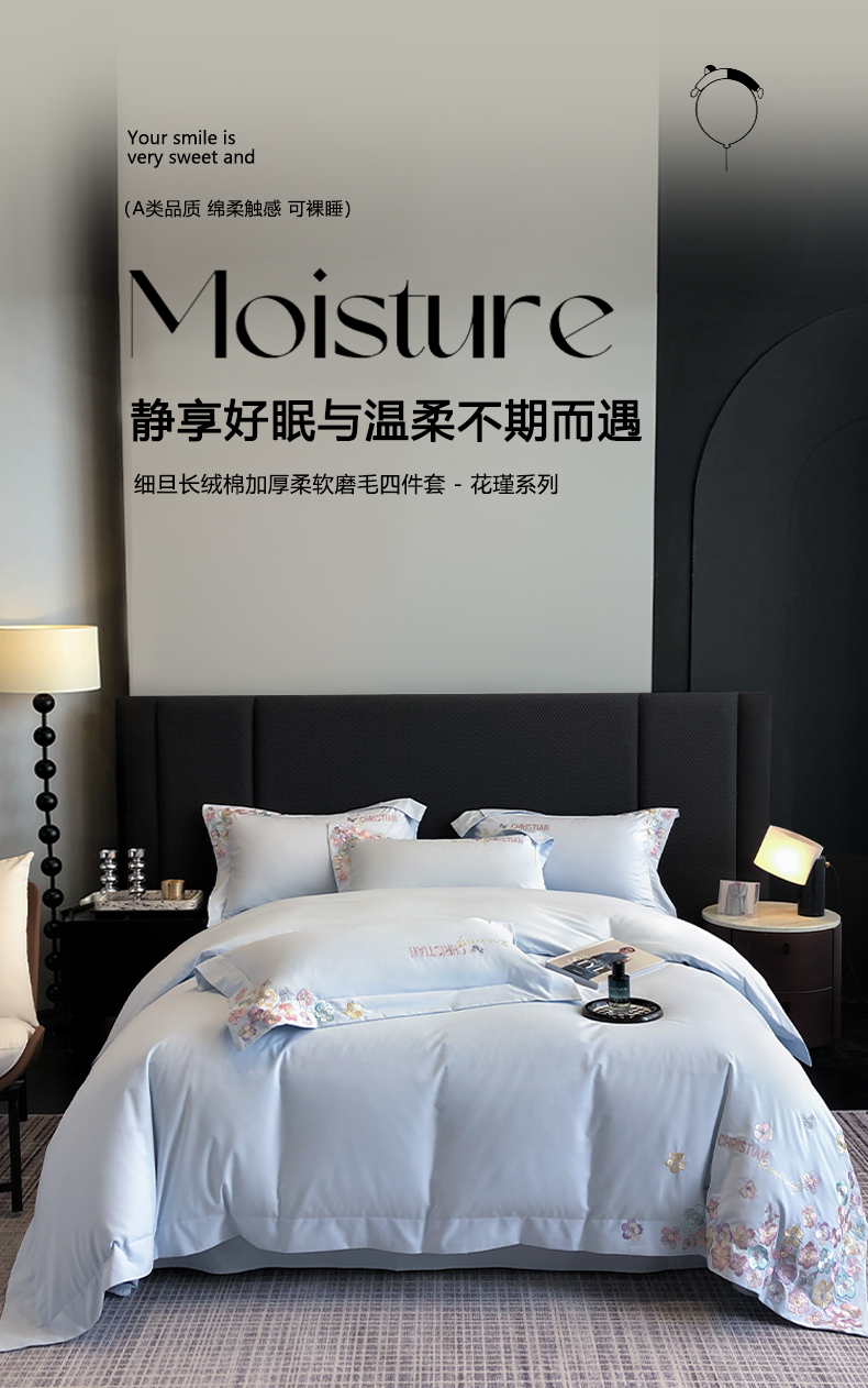 丞音家纺 【特价新品】A类100支超柔超细旦长绒棉磨毛保暖绣花四件套纯棉加厚刺绣全棉床单被套-花瑾系列 花瑾-祖玛蓝