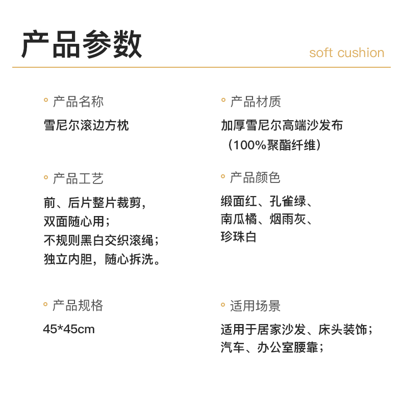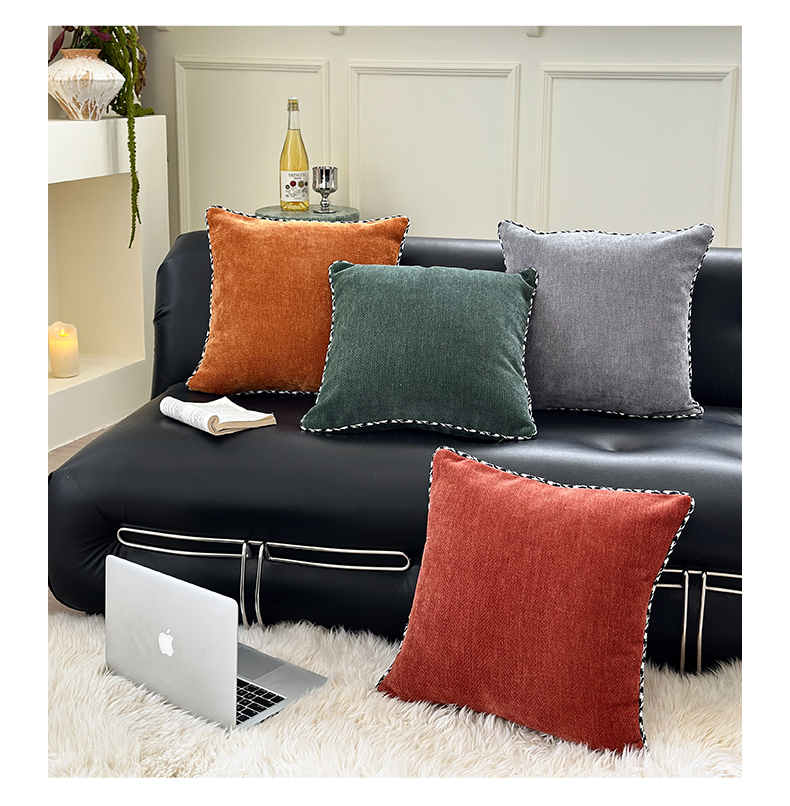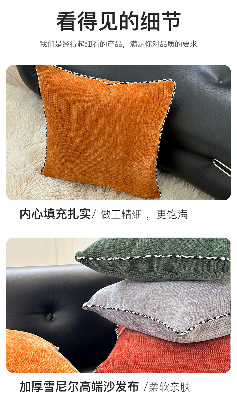 (总)美茉家居 2025新款加厚高端沙发布雪尼尔滚边方枕抱枕,缎面红,孔雀绿,南瓜橘,烟雨灰,珍珠白