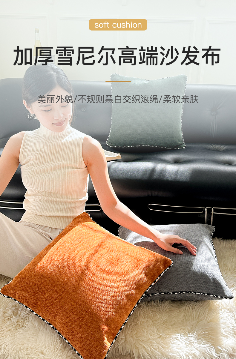 商品名称:美茉家居 2025新款加厚高端沙发布雪尼尔滚边方枕抱枕 南瓜橘