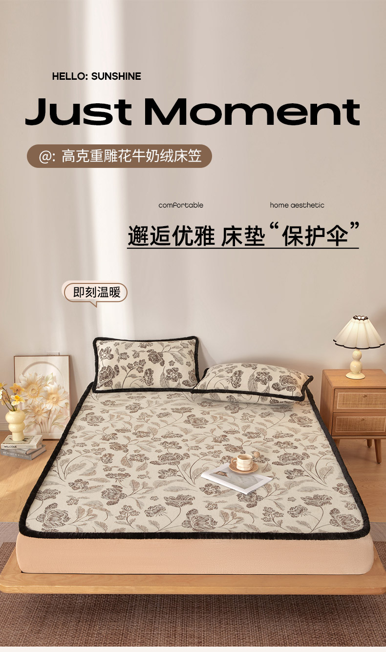 • 91家纺网 家纺一手货源 找家纺 吾诺家居 2025新款高克重雕花牛奶绒单品床笠 叶繁