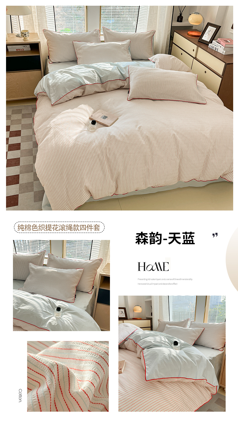 商品名称:宜代光年 2025新款全棉纯棉色织提花滚绳款四件套-森韵 森韵-天蓝