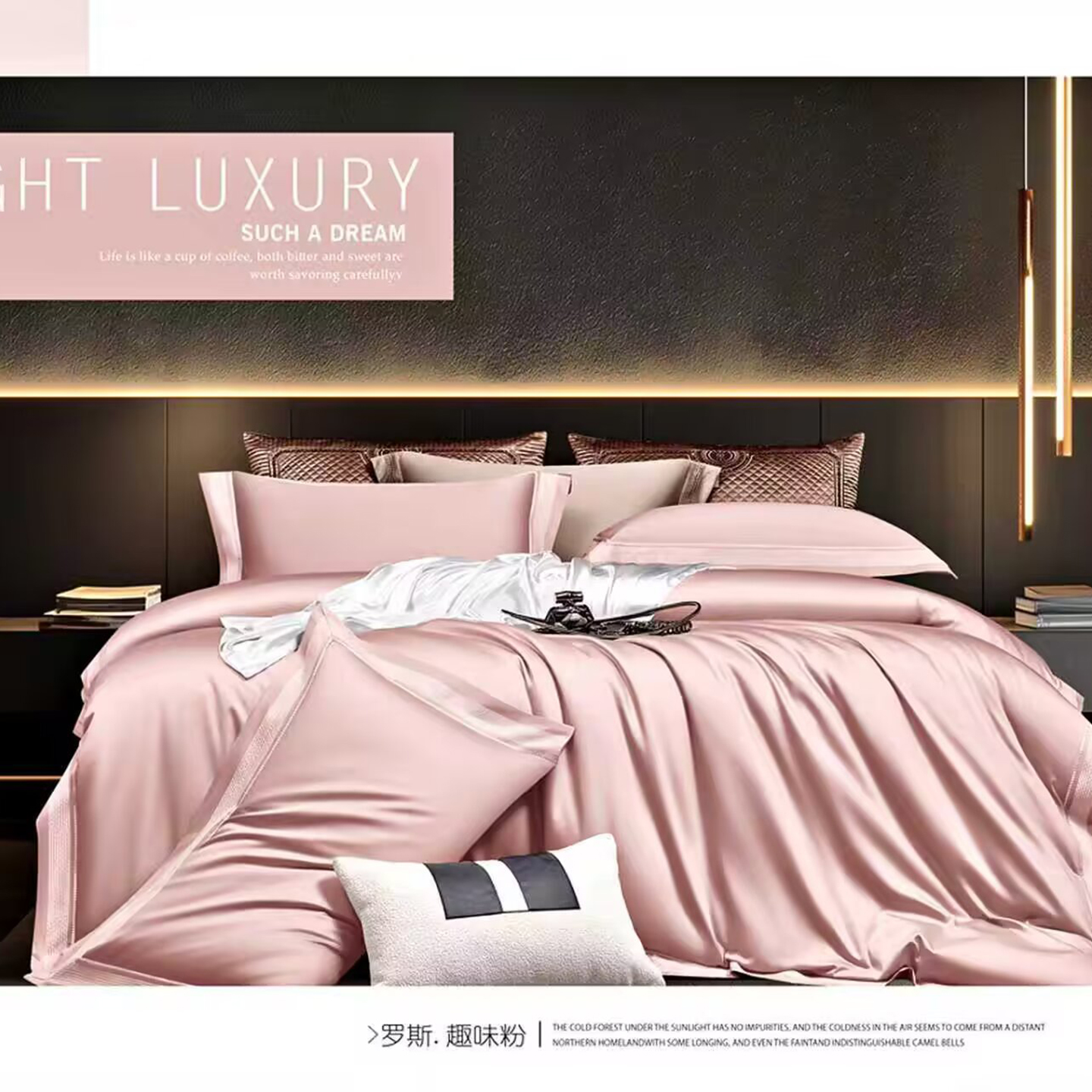 (总)玖玖爱家纺 2023新款100支贡缎长绒棉四件套,粉色,灰,金色,橘色,绿色,水蓝