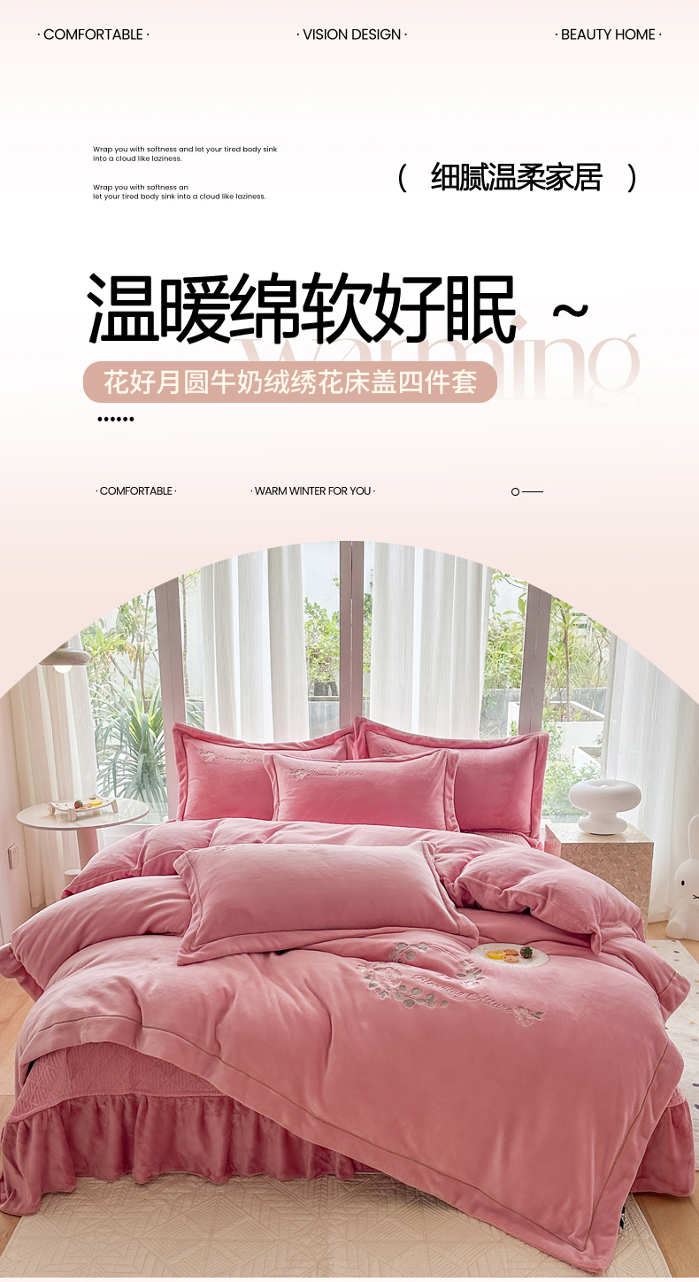 (总)美伦美焕 2025新款高克重牛奶绒绣花床盖四件套-花好月圆,花好月圆-豆沙,花好月圆-大红,花好月圆-粉玉,花好月圆-湖绿,花好月圆-桔,花好月圆-蔚蓝,花好月圆-香槟,花好月圆-烟灰,花好月圆-银灰