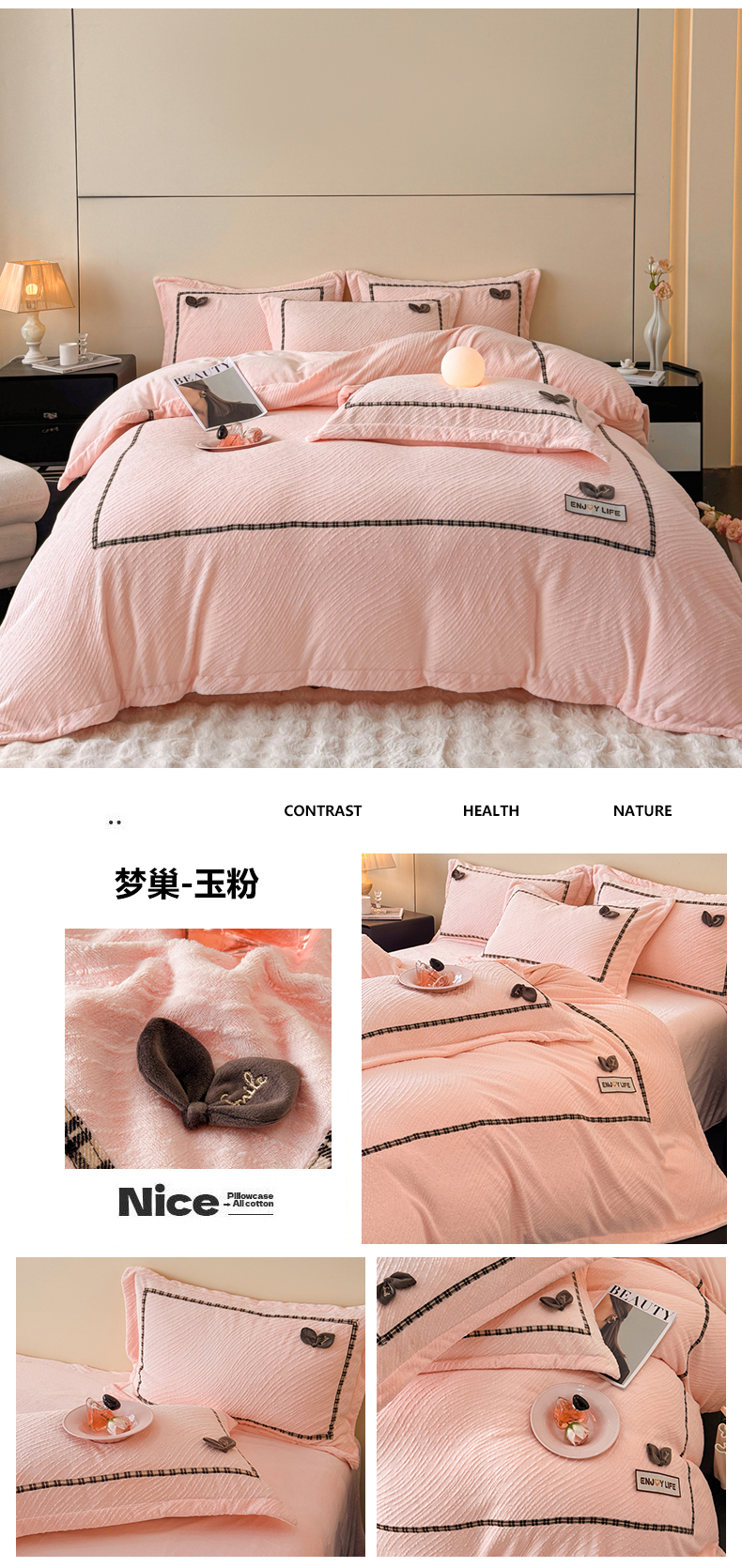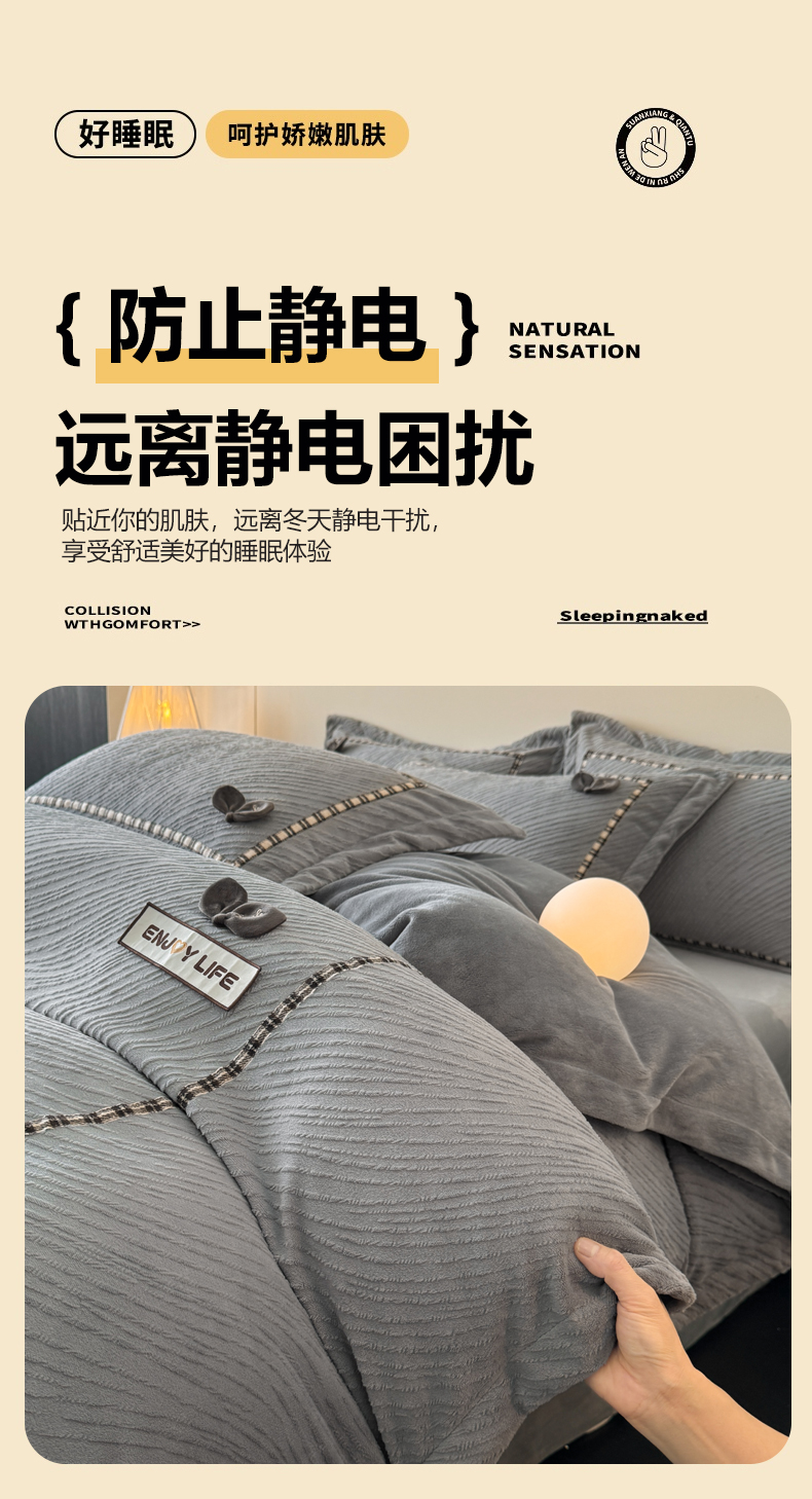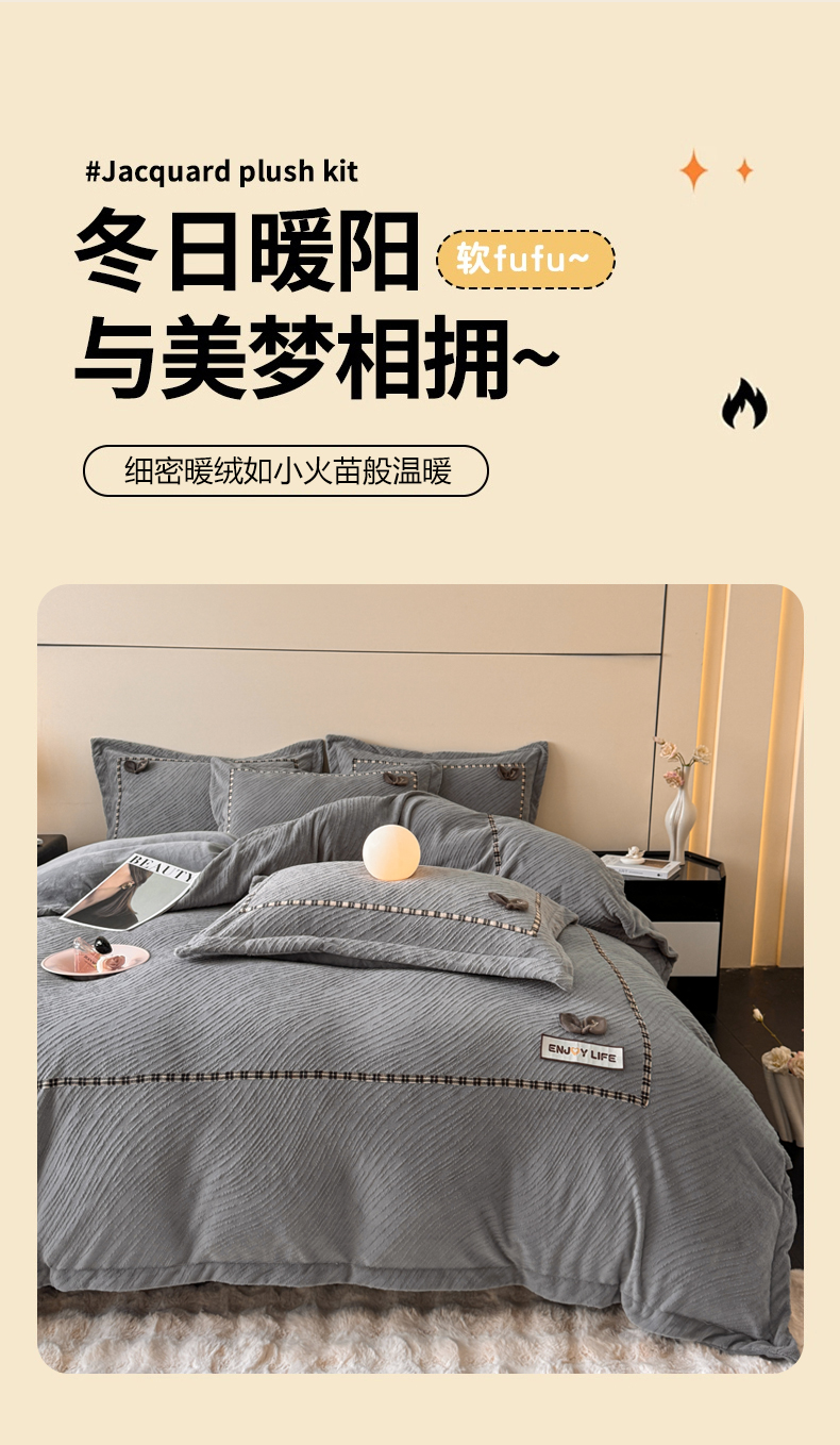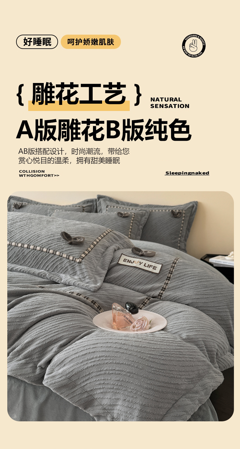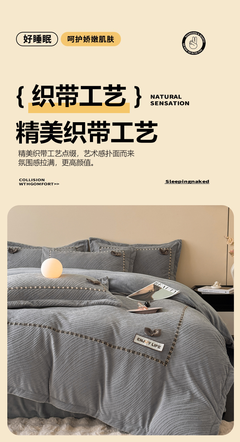 慕木家纺 2025新款牛奶绒雕花织带款梦巢系列四件套 梦巢-金典灰