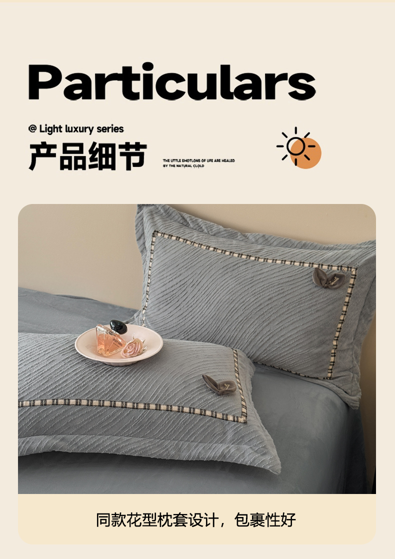 商品名称:慕木家纺 2025新款牛奶绒雕花织带款梦巢系列四件套 梦巢-金典灰