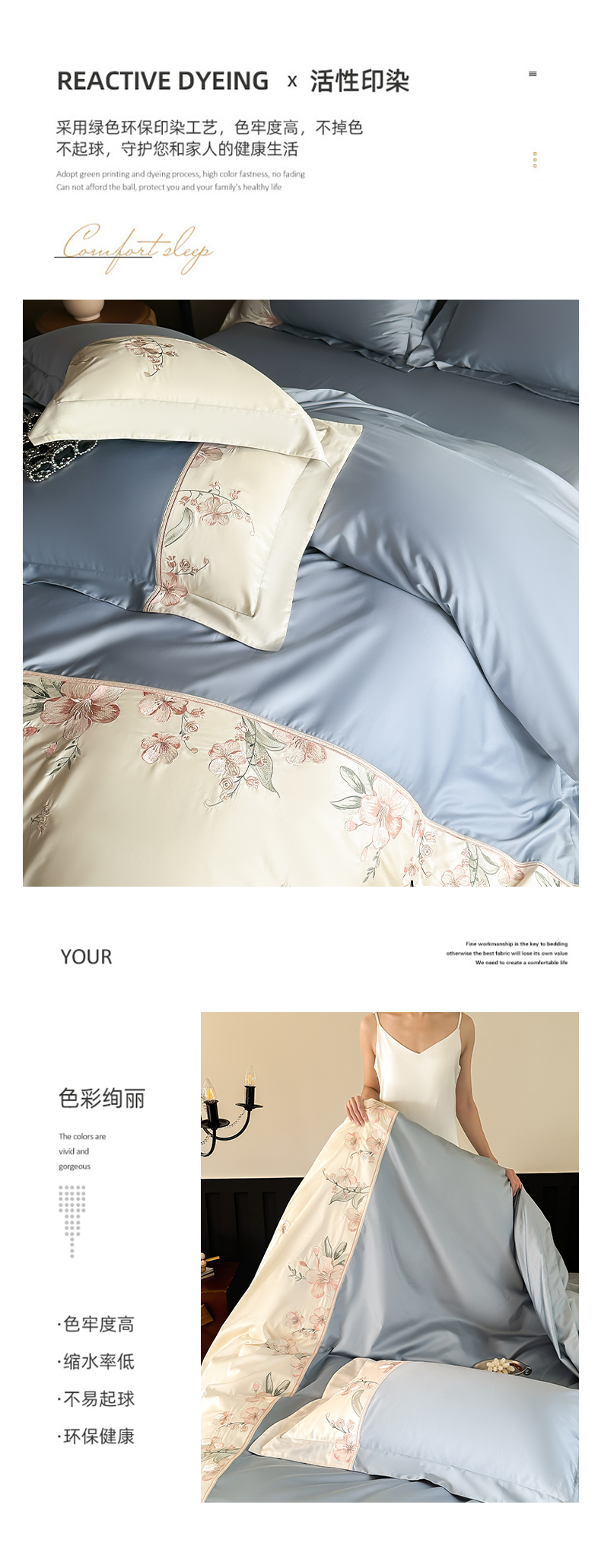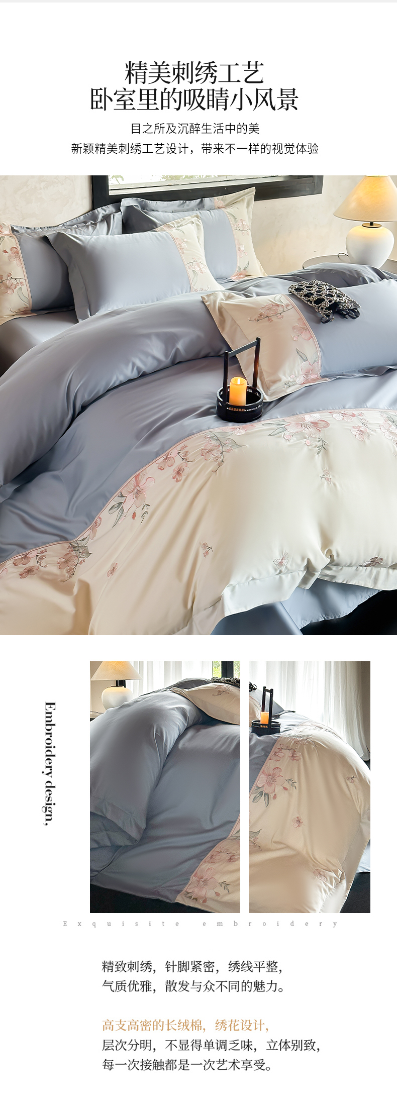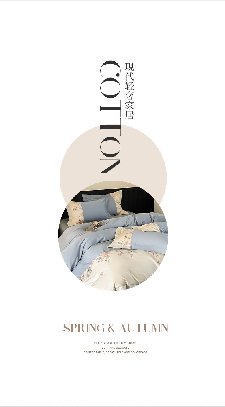 (总)宅家居 2025新款樱花恋系列-轻奢法式小香风双面100%纯棉刺绣拼接款全棉长绒棉四件套,樱花粉,繁星蓝,松石绿,香槟金