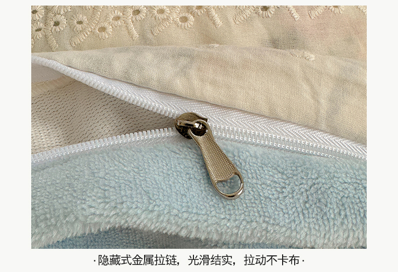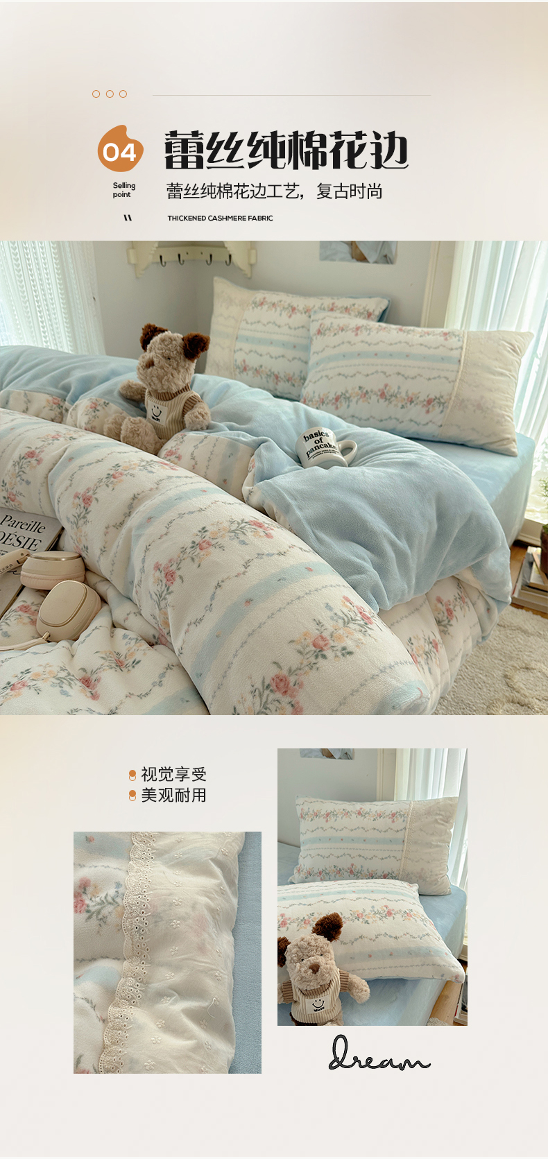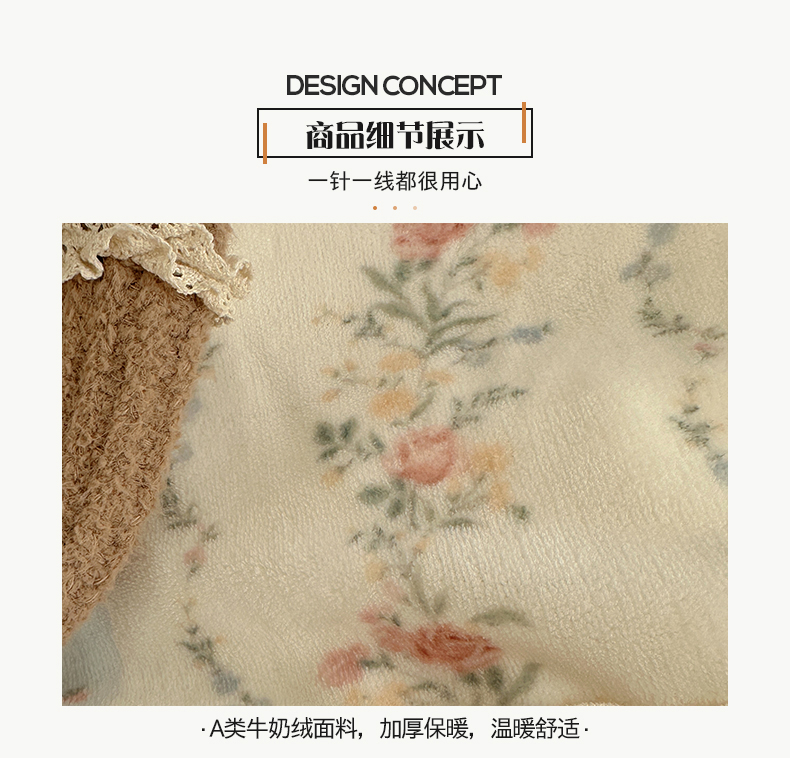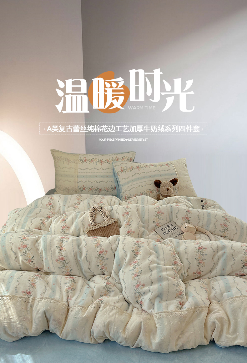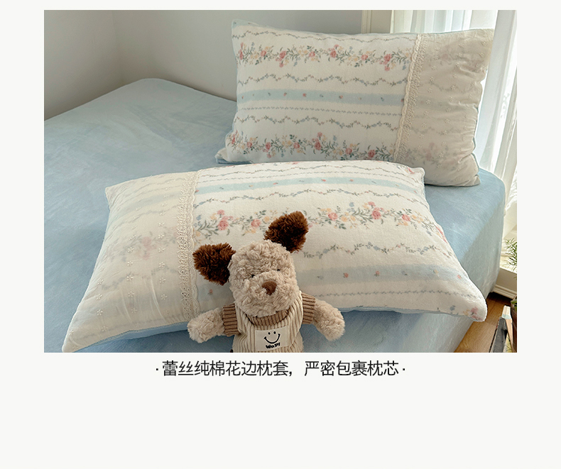 商品名称:桃子家居 2025新款A类蕾丝纯棉花边工艺花卉复古碎花加厚花边牛奶绒系列四件套 绒-蕾丝蓝田花