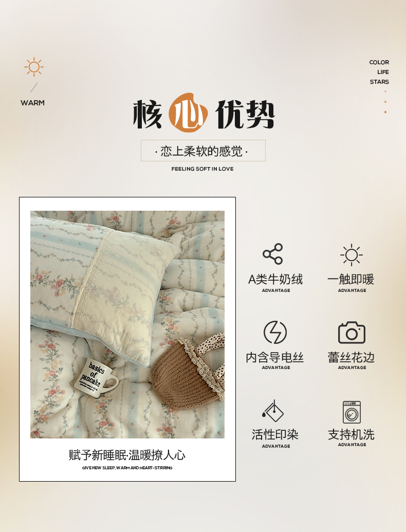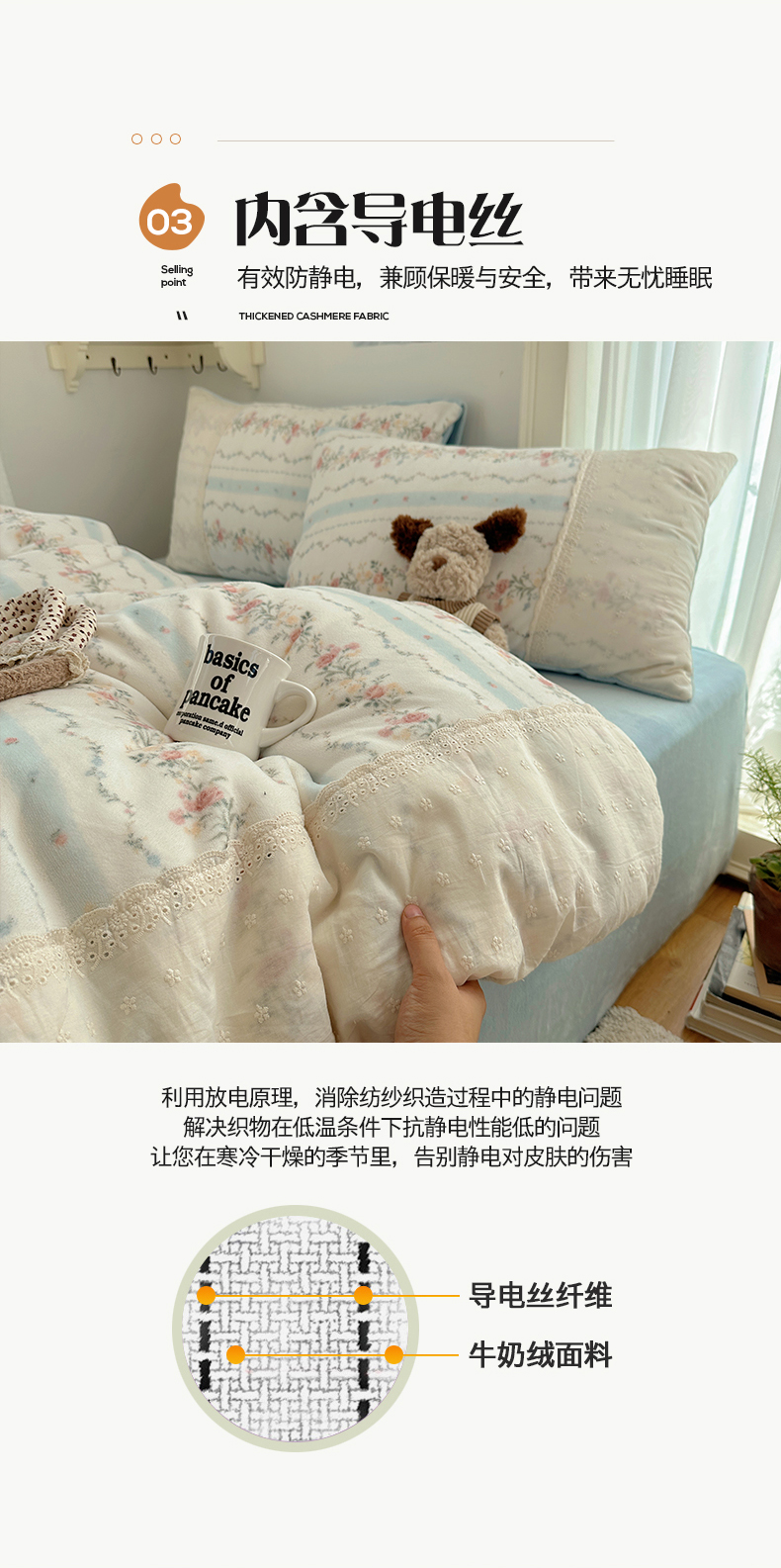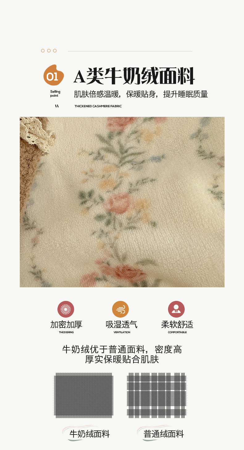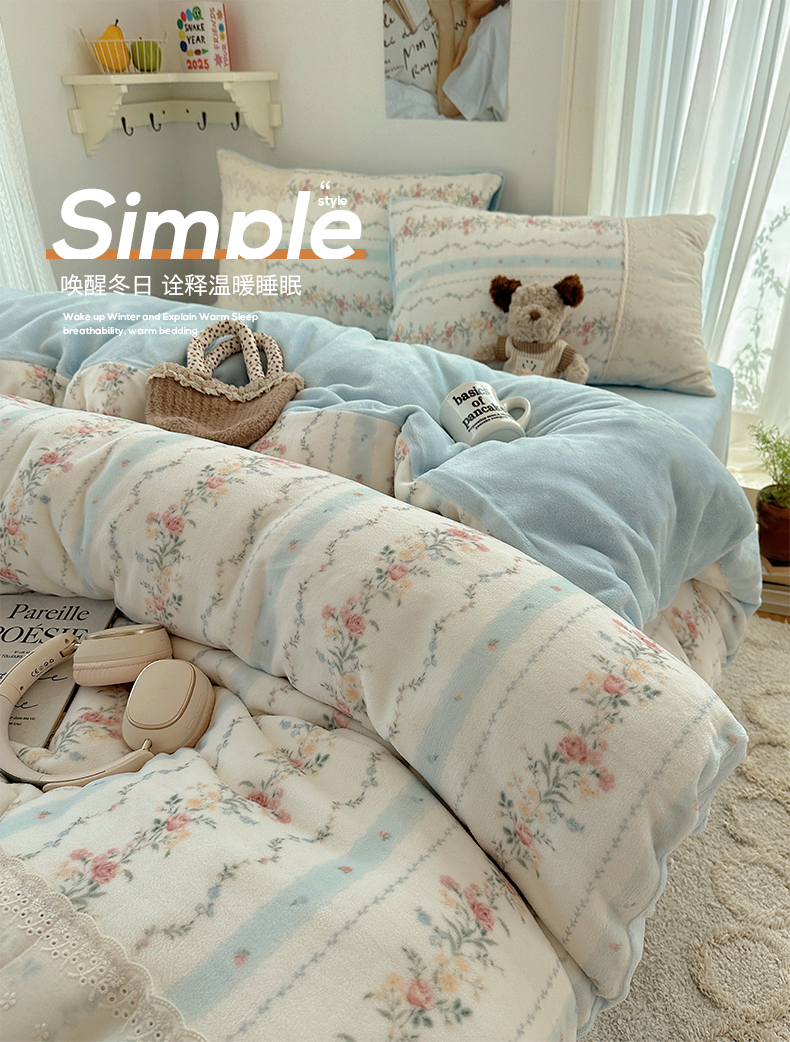 商品名称:桃子家居 2025新款A类蕾丝纯棉花边工艺花卉复古碎花加厚花边牛奶绒系列四件套 绒-蕾丝蓝田花