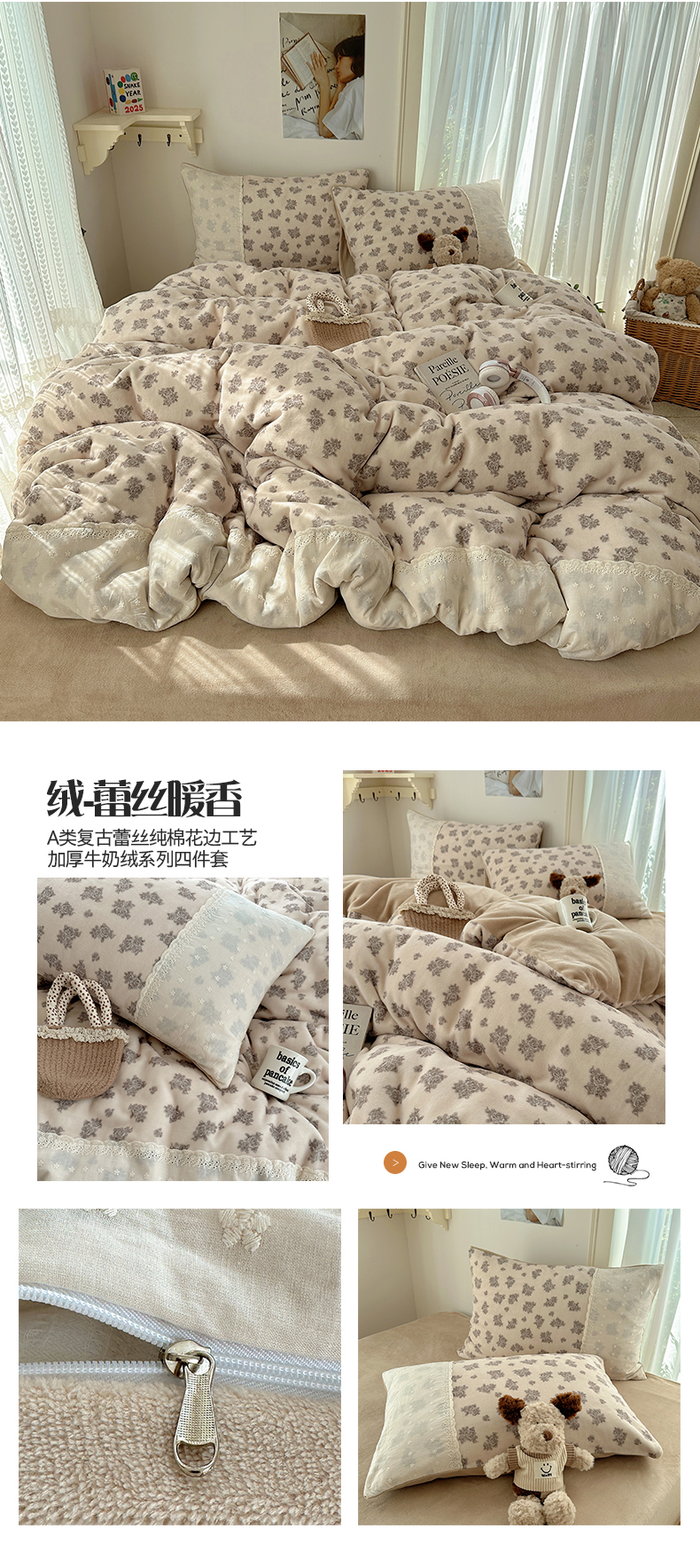 桃子家居 2025新款A类蕾丝纯棉花边工艺花卉复古碎花加厚花边牛奶绒系列四件套 绒-蕾丝蓝田花