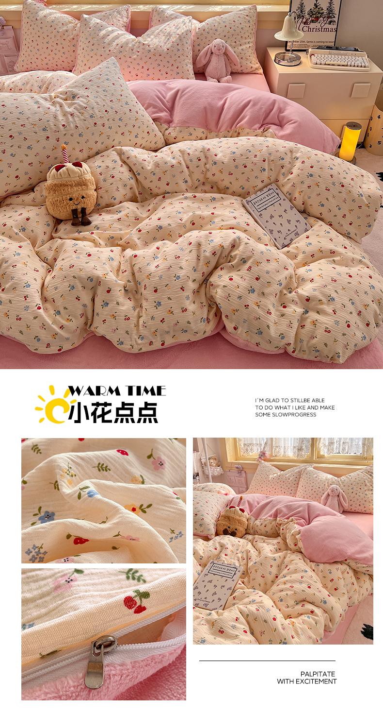 商品名称:瑞钰 2025新款A版三层纱B版牛奶绒四件套系列 花丛点点猫
