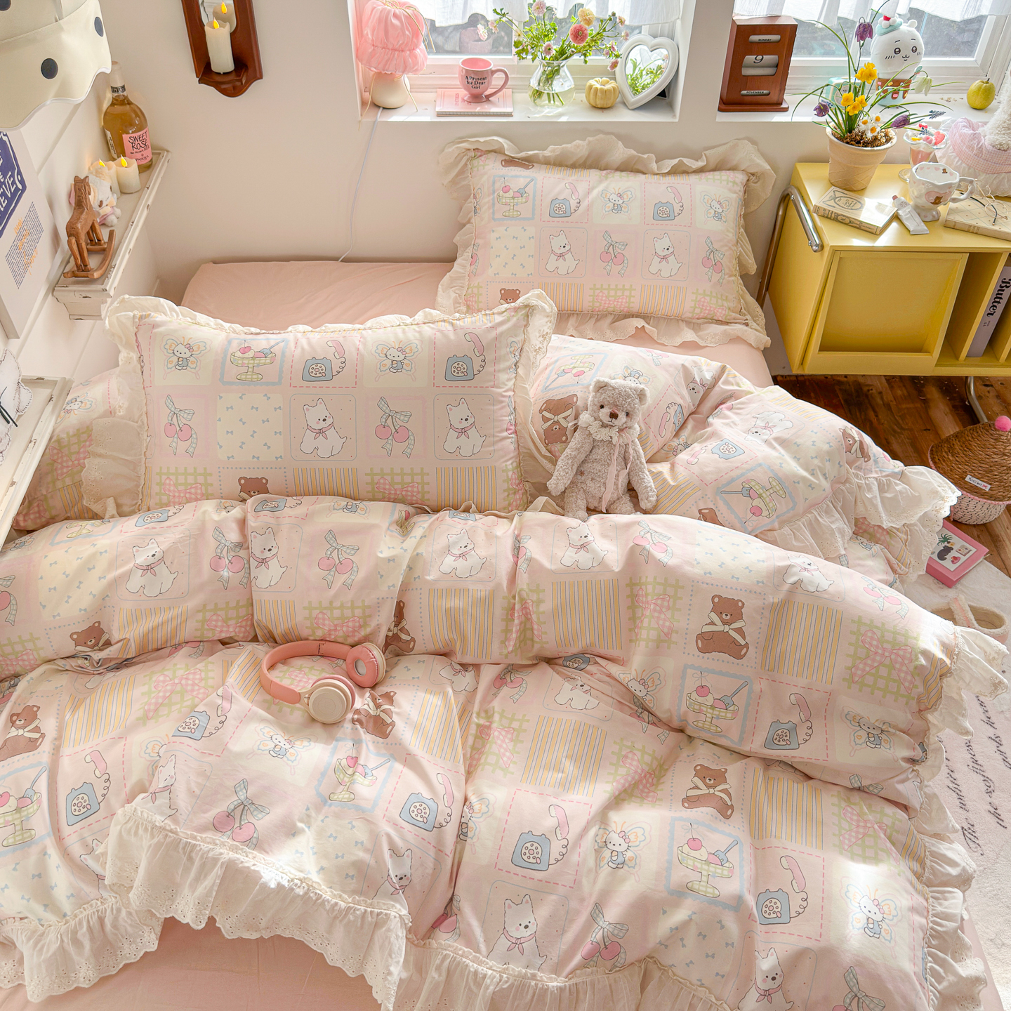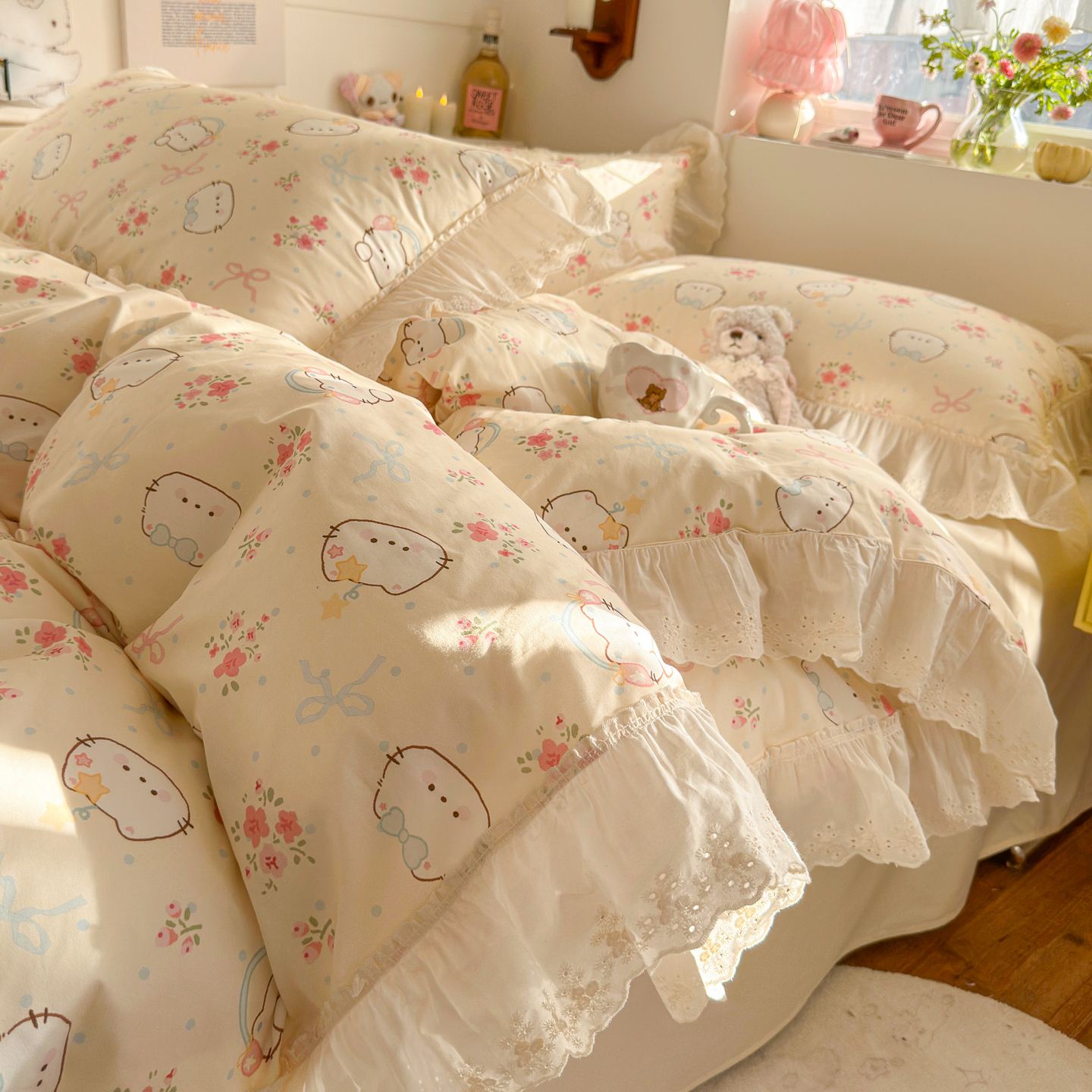 锦彩家居 2026新款全棉数码印花卡通花边款三件套四件套INS小红书博主风(提供买家秀) 云朵小熊