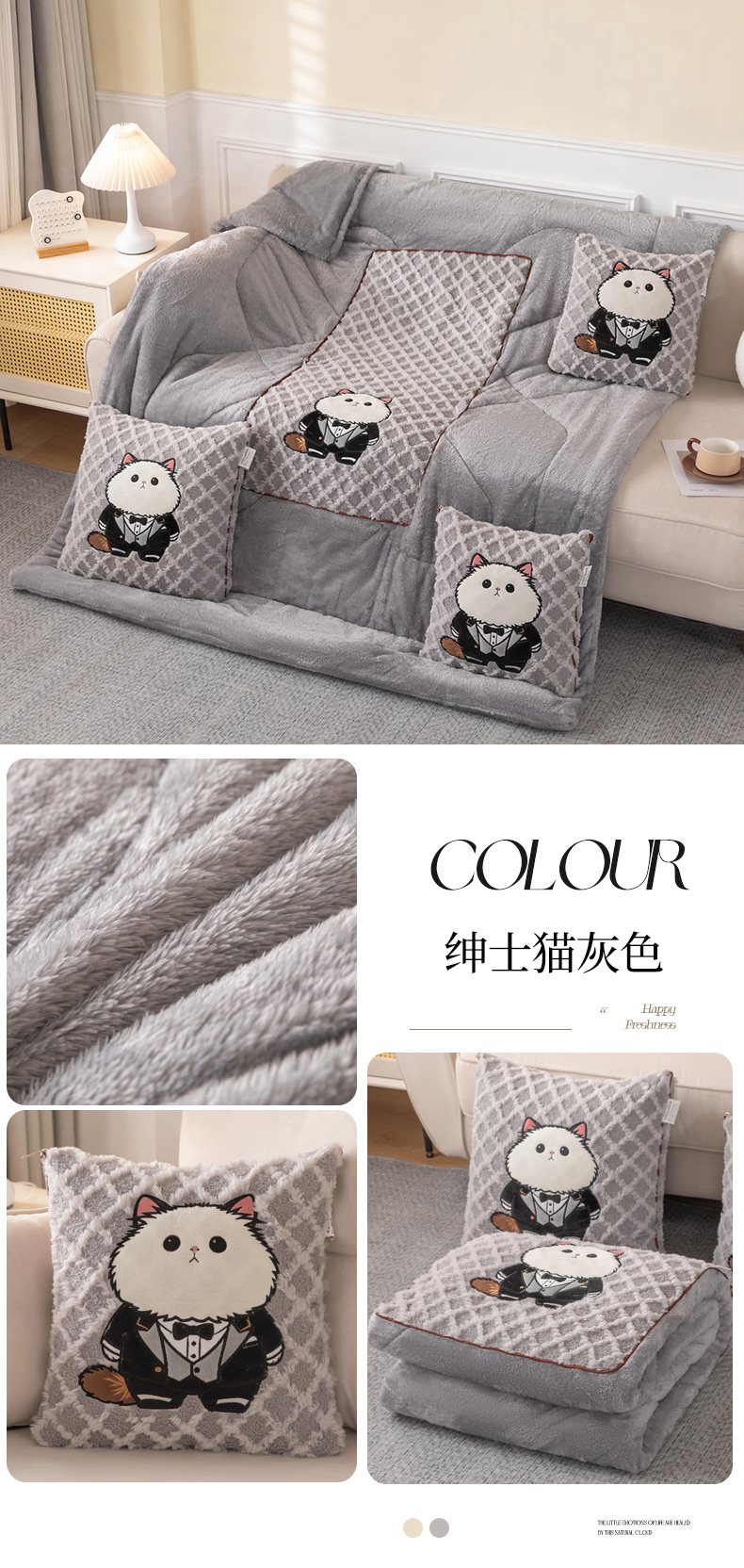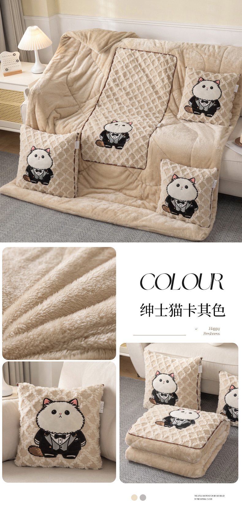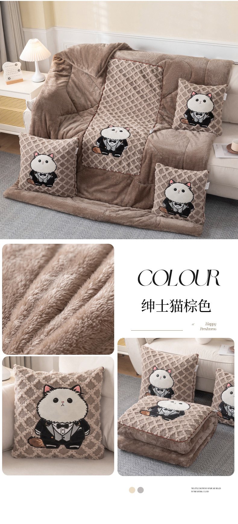 (总)宝马家纺(原梦童画) 2025新款加厚抱枕被绅士猫,绅士猫棕色,绅士猫灰色,绅士猫卡其色