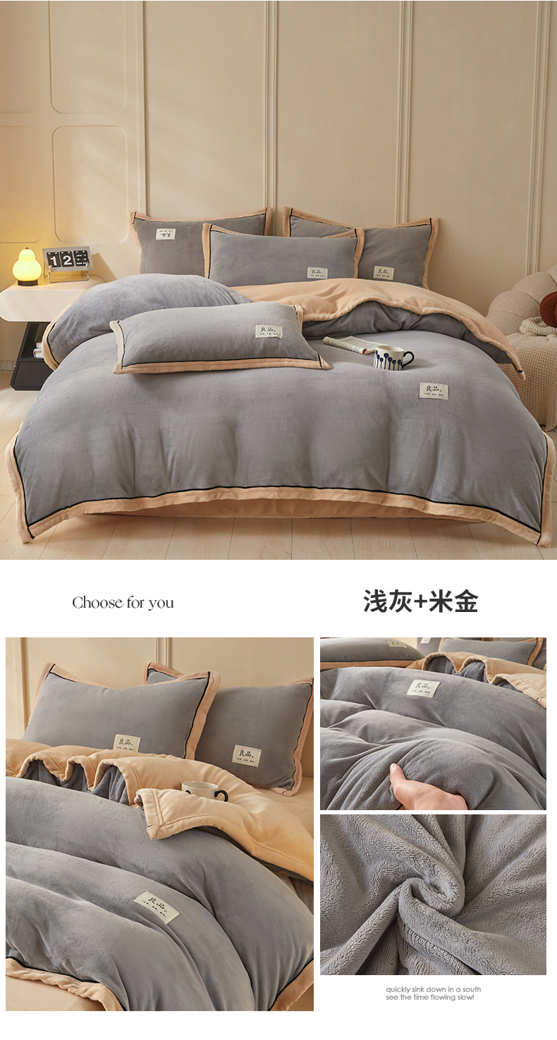 (总)慕木家纺 2025新款高克重简约无印风牛奶绒双拼四件套,宾利蓝+浅灰,米驼+奶茶咖,浅灰+米金,双拼套件-豆沙+灰