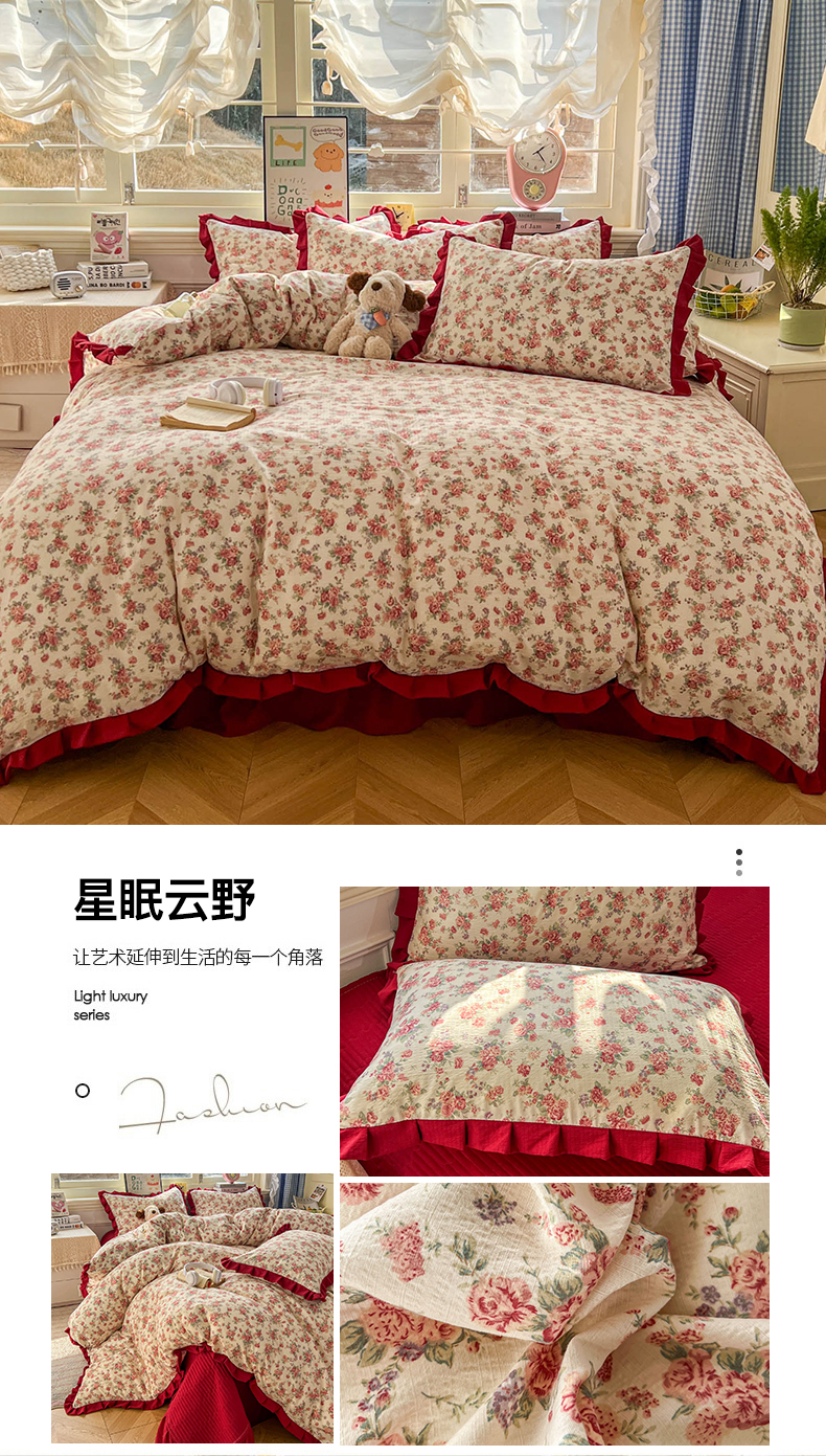 (总)美梦家纺 2026春夏新款云感皱皱纱床盖四件套,玫瑰园,芭比兔,波点咖,椿庭序,见花则喜,蜡笔画,葡萄多多,俏皮狗,苏槿,星眠云野,枝语花繁,竹歆花语