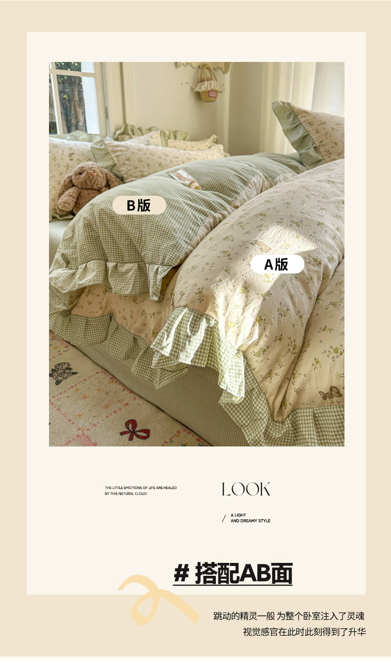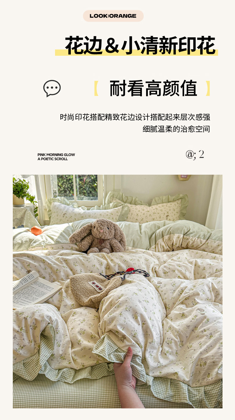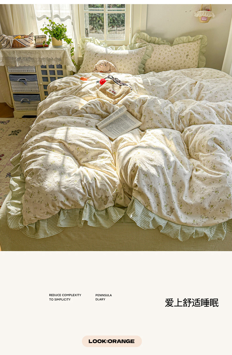 商品名称:柒月家居 2026新款韩系仿棉小格花边四件套 叶初开