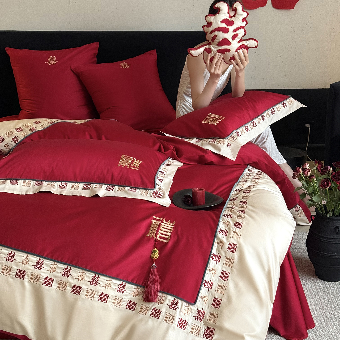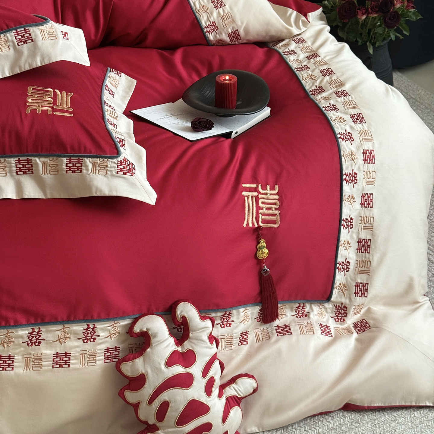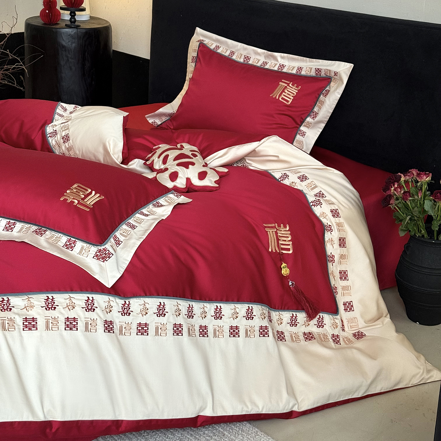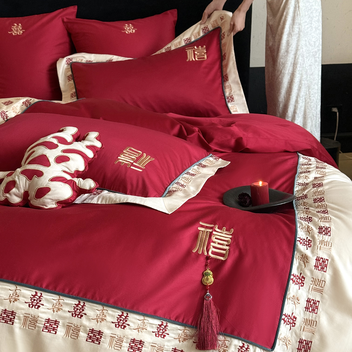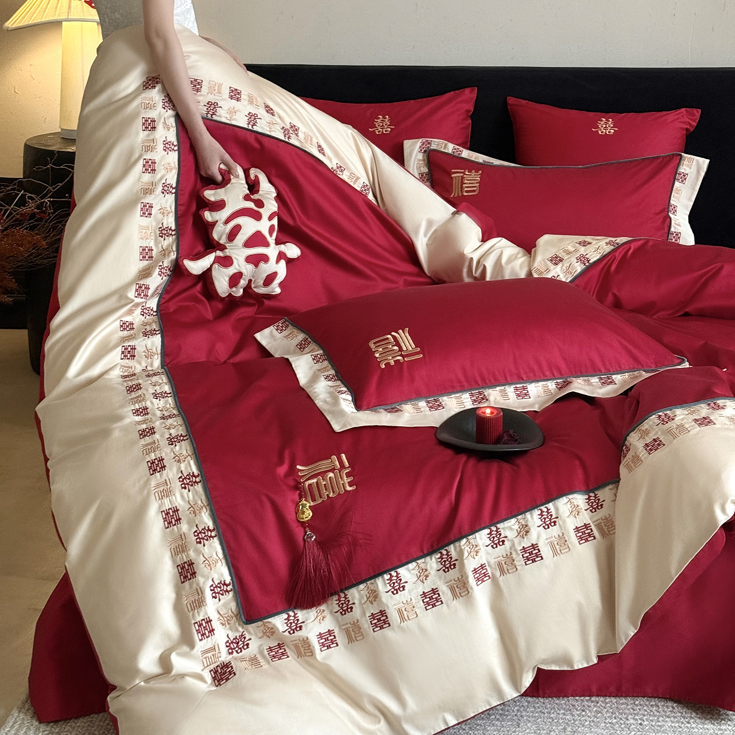 (总)江涞 2026新款100支长绒棉进口高端刺绣可摘卸流苏四件套-迎喜(淘宝券后不低于 418/438)