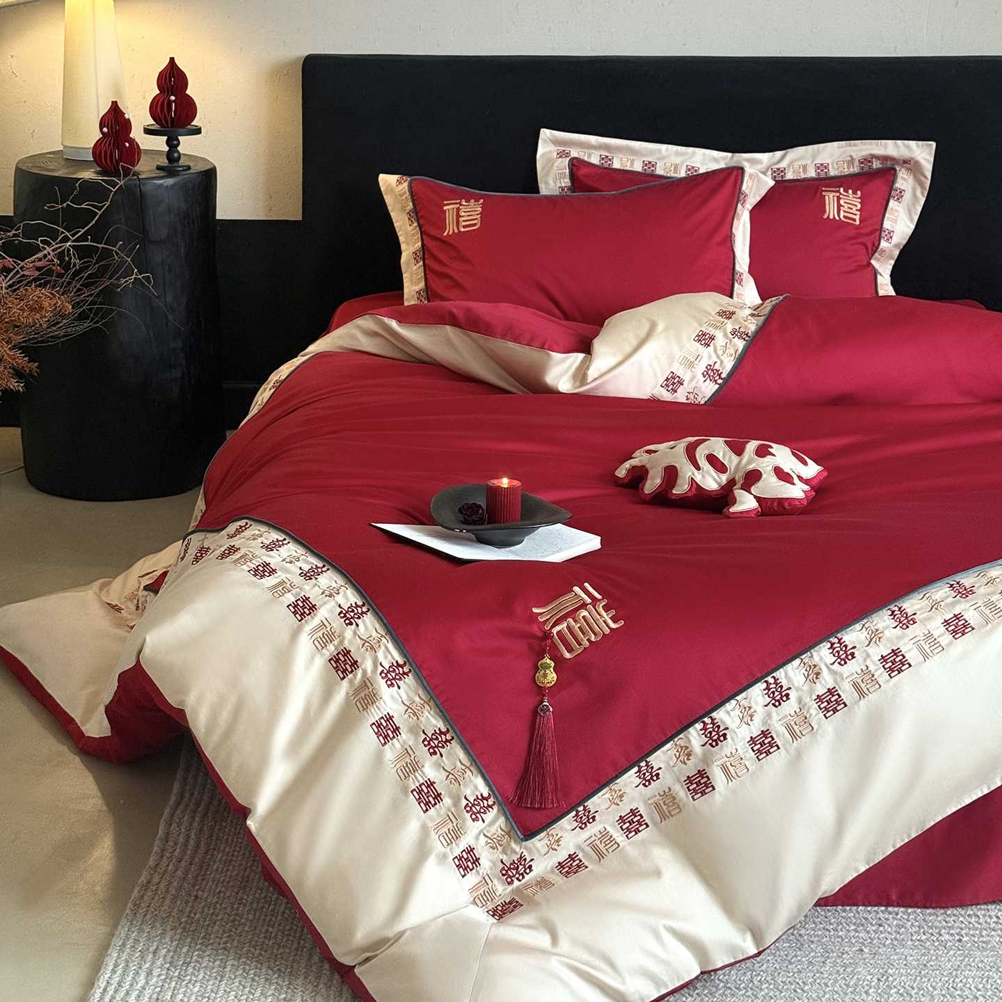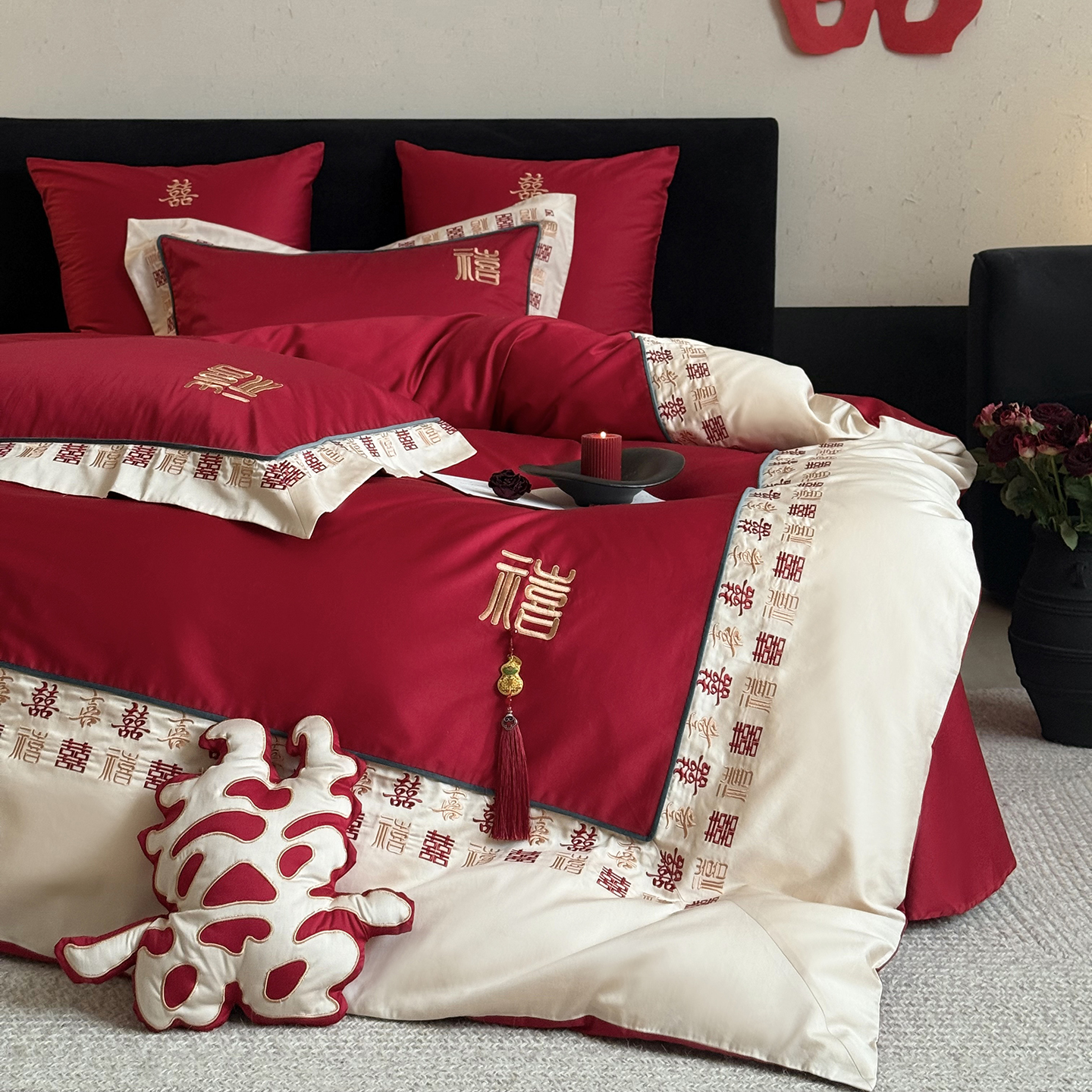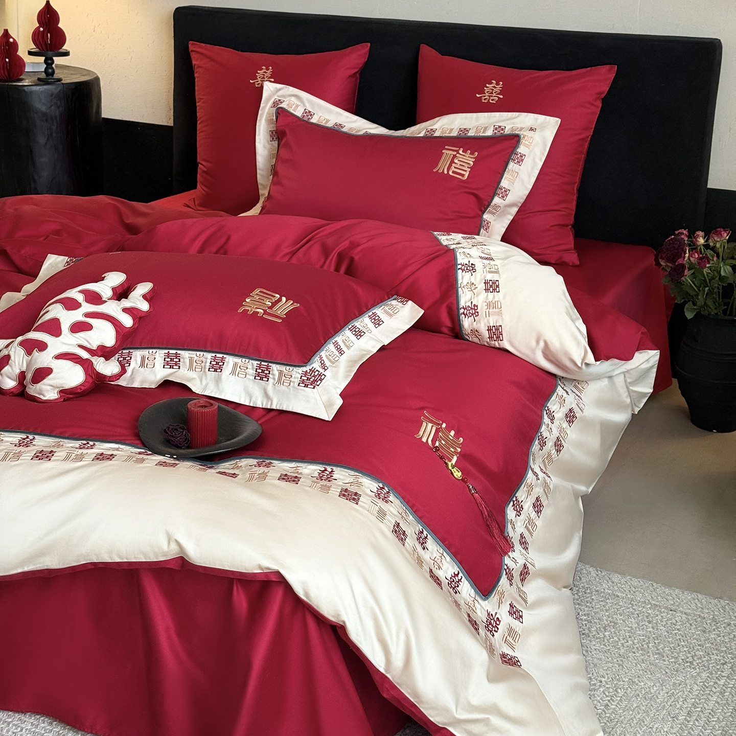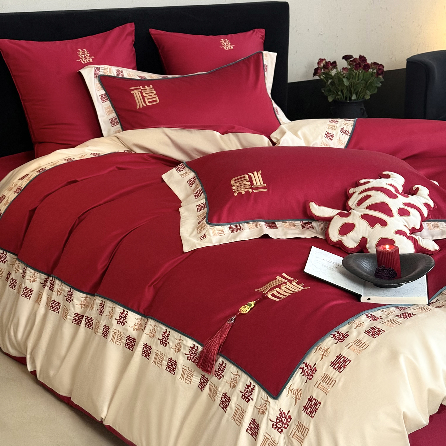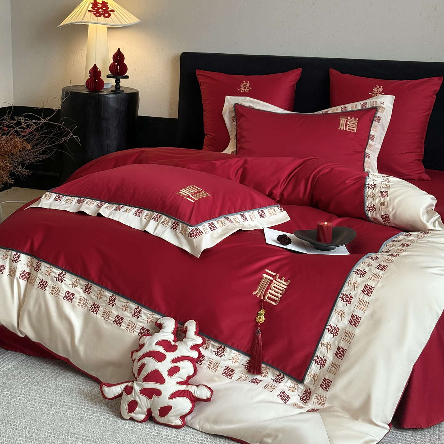 (总)江涞 2026新款100支长绒棉进口高端刺绣可摘卸流苏四件套-迎喜(淘宝券后不低于 418/438)