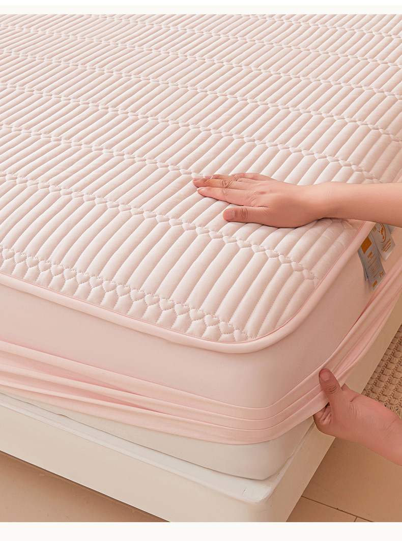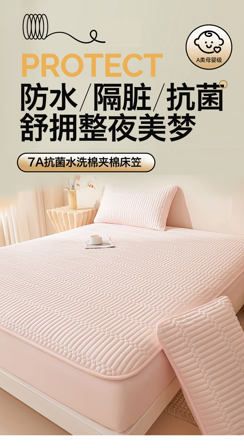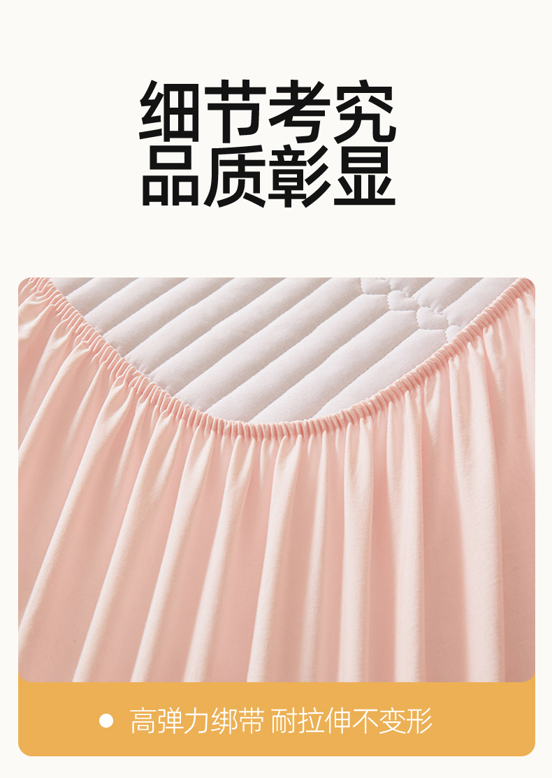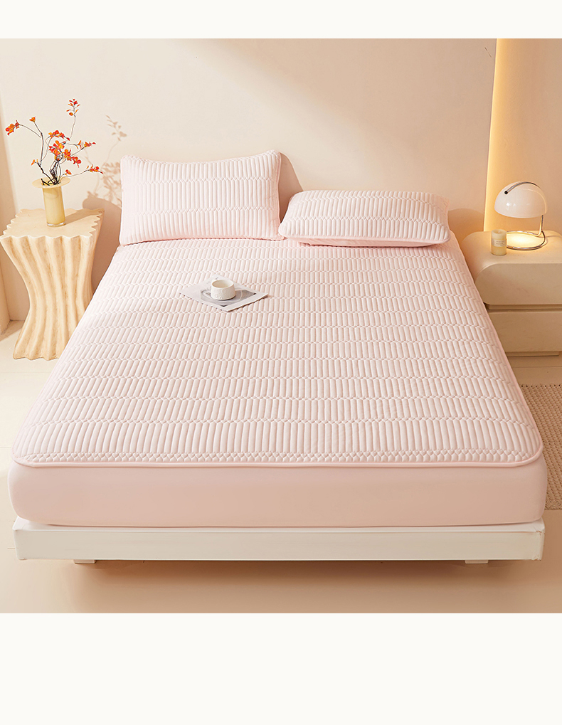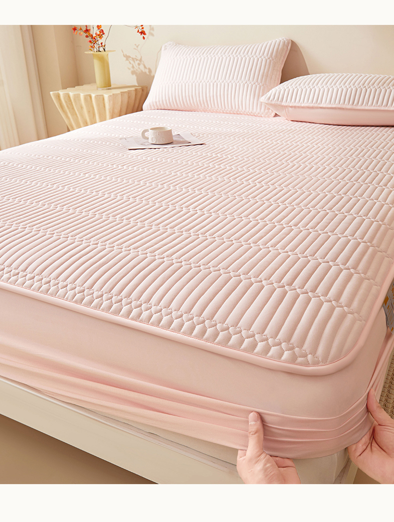 • 91家纺网 家纺一手货源 找家纺 女子家纺 2026春夏新款简爱A类夹棉防水床笠三件套水洗棉7A抗菌磨毛床单保护套 简爱-密合粉