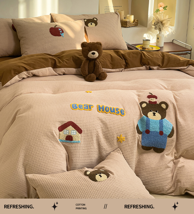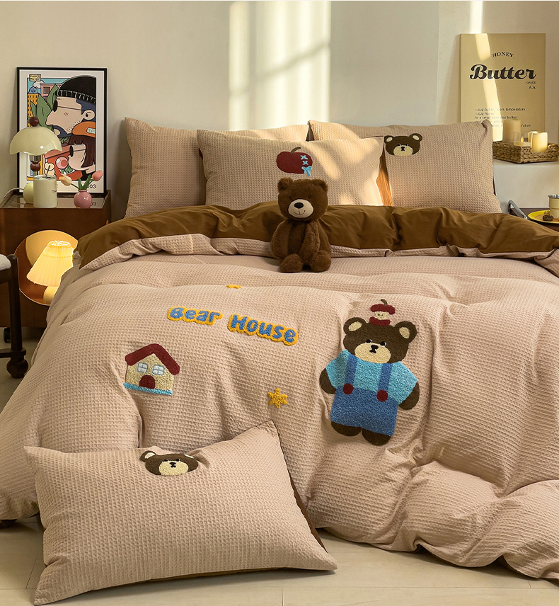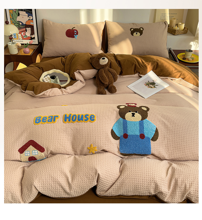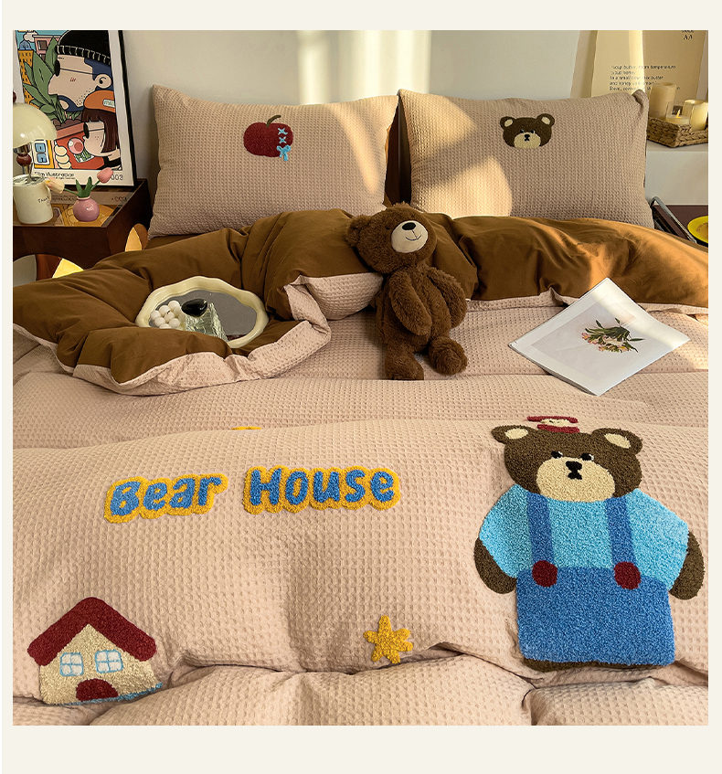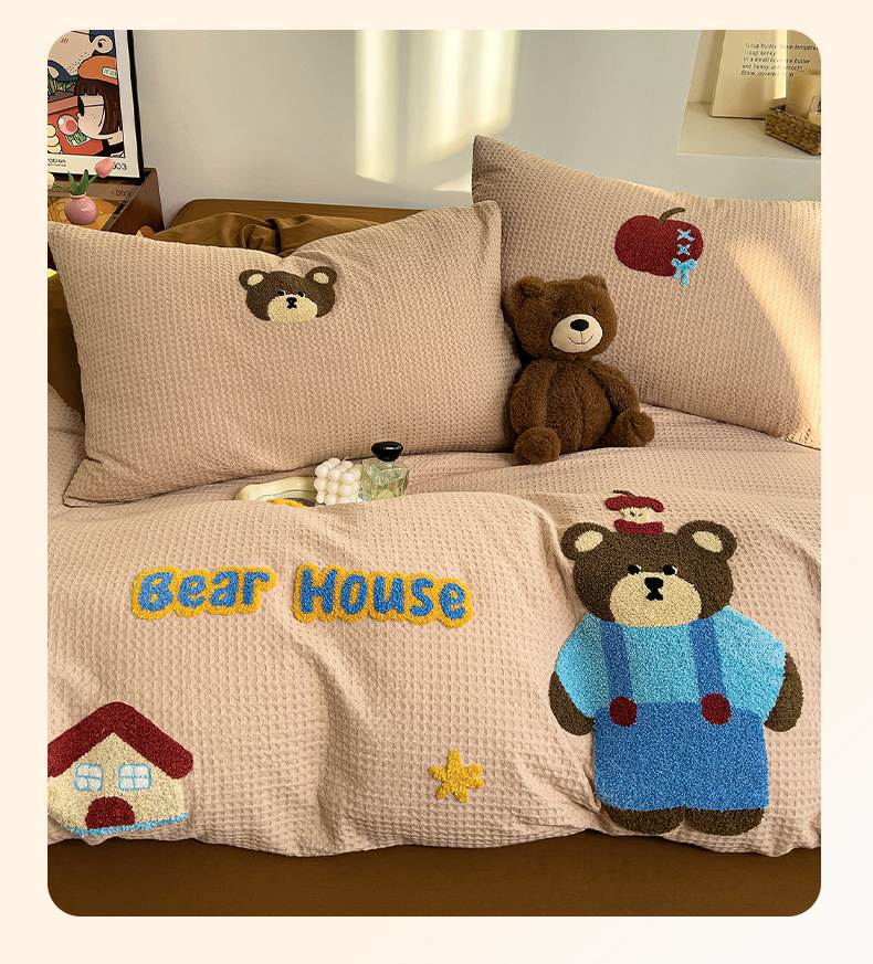 炫拼家纺 2026新款A类全棉色织华夫格卡通毛巾绣B版40支纯棉水洗棉四件套-乐邦系列 乐邦-苹果熊