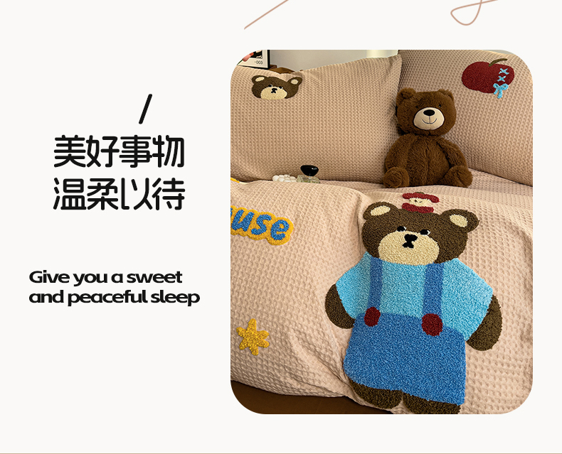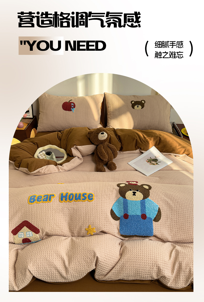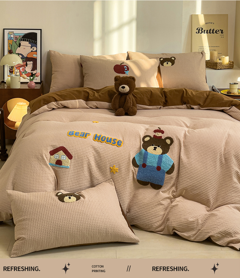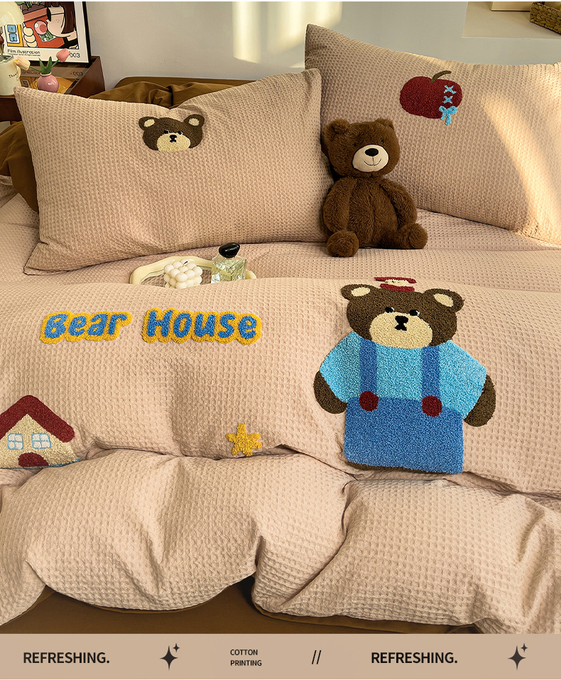 炫拼家纺 2026新款A类全棉色织华夫格卡通毛巾绣B版40支纯棉水洗棉四件套-乐邦系列 乐邦-苹果熊