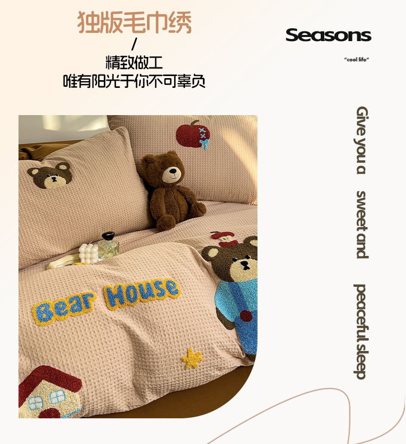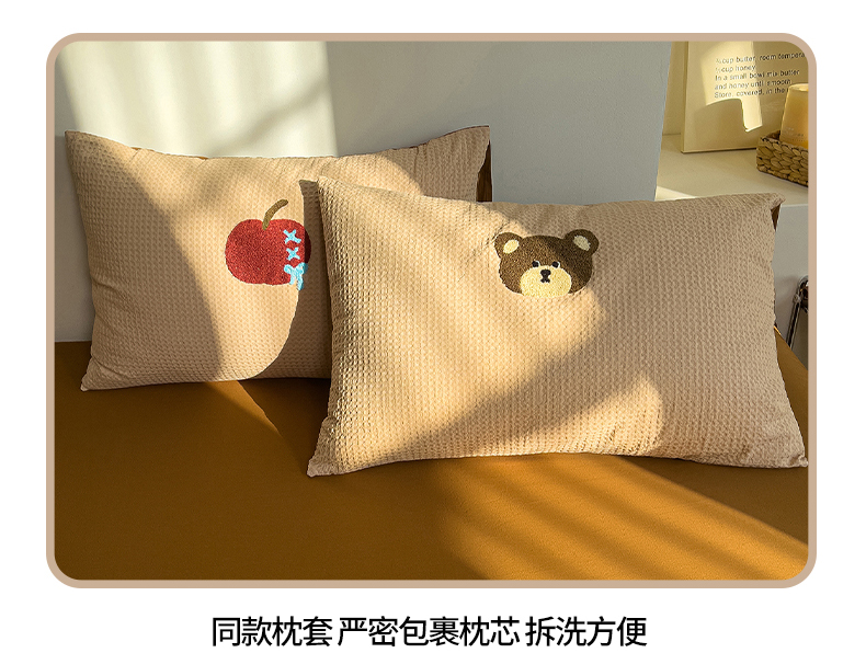 商品名称:炫拼家纺 2026新款A类全棉色织华夫格卡通毛巾绣B版40支纯棉水洗棉四件套-乐邦系列 乐邦-苹果熊