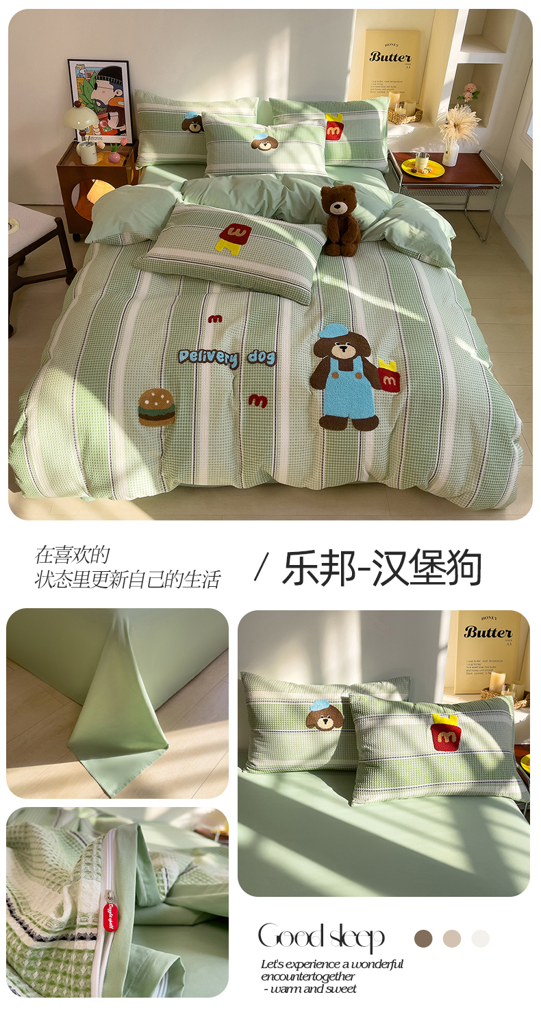 (总)炫拼家纺 2026新款A类全棉色织华夫格卡通毛巾绣B版40支纯棉水洗棉四件套-乐邦系列,乐邦-休闲熊猫,乐邦-汉堡狗,乐邦-梦想猫,乐邦-米乐兔,乐邦-苹果熊,乐邦-甜筒象
