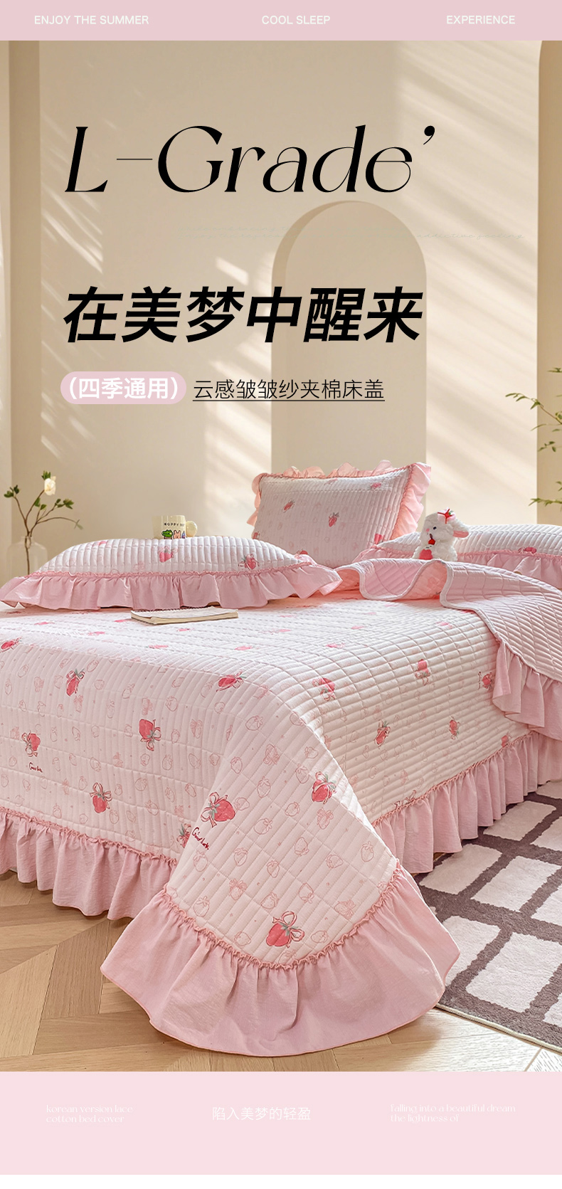眠势力 2026新款双层纱加厚夹棉云感皱皱纱大花边床单床盖三件套四季通用 花漾草莓【皱皱纱花边床盖】
