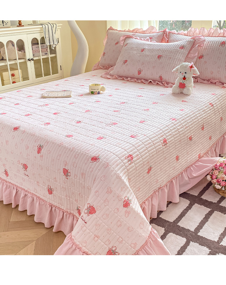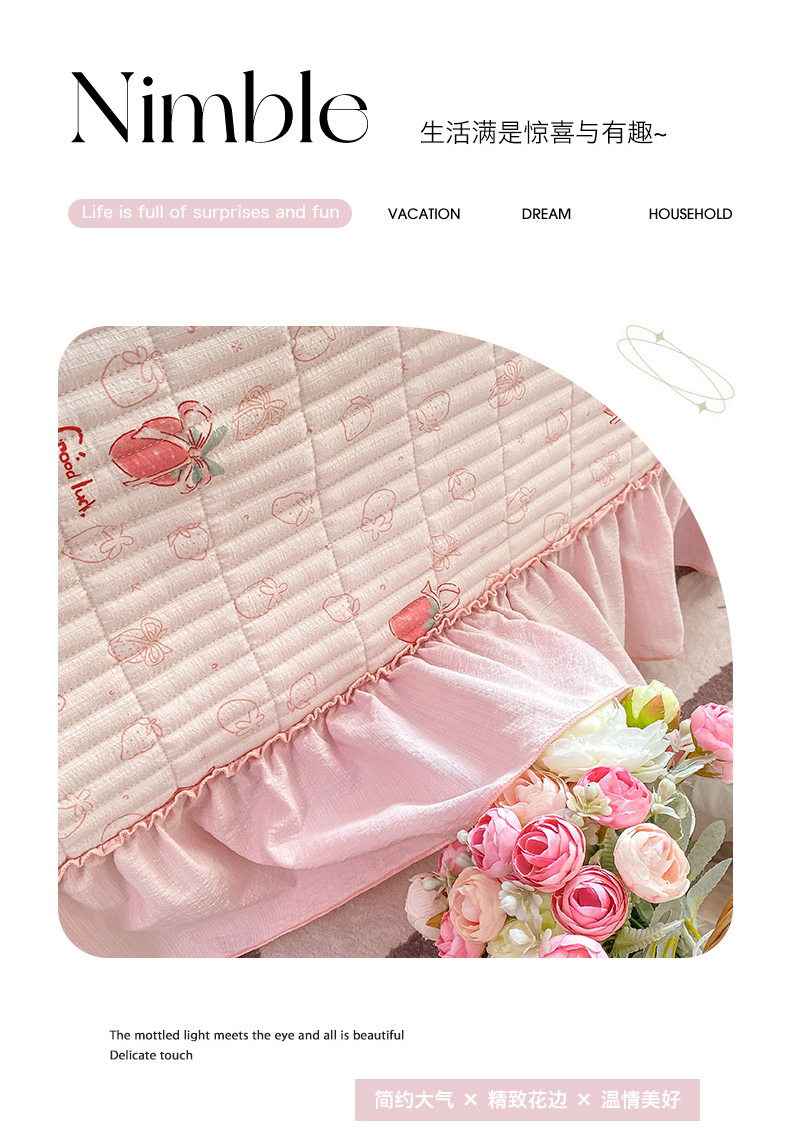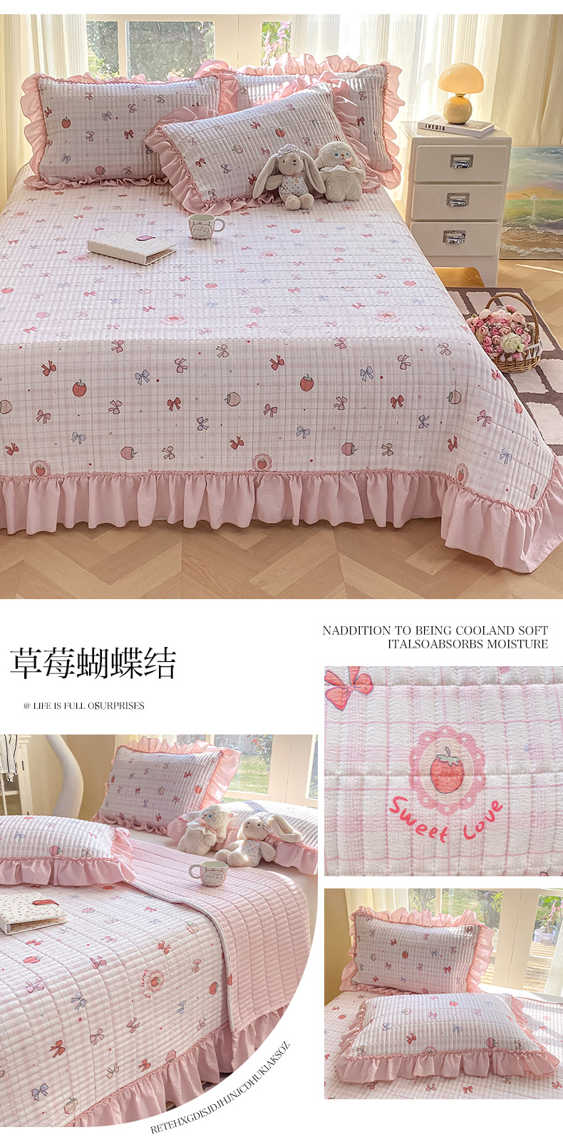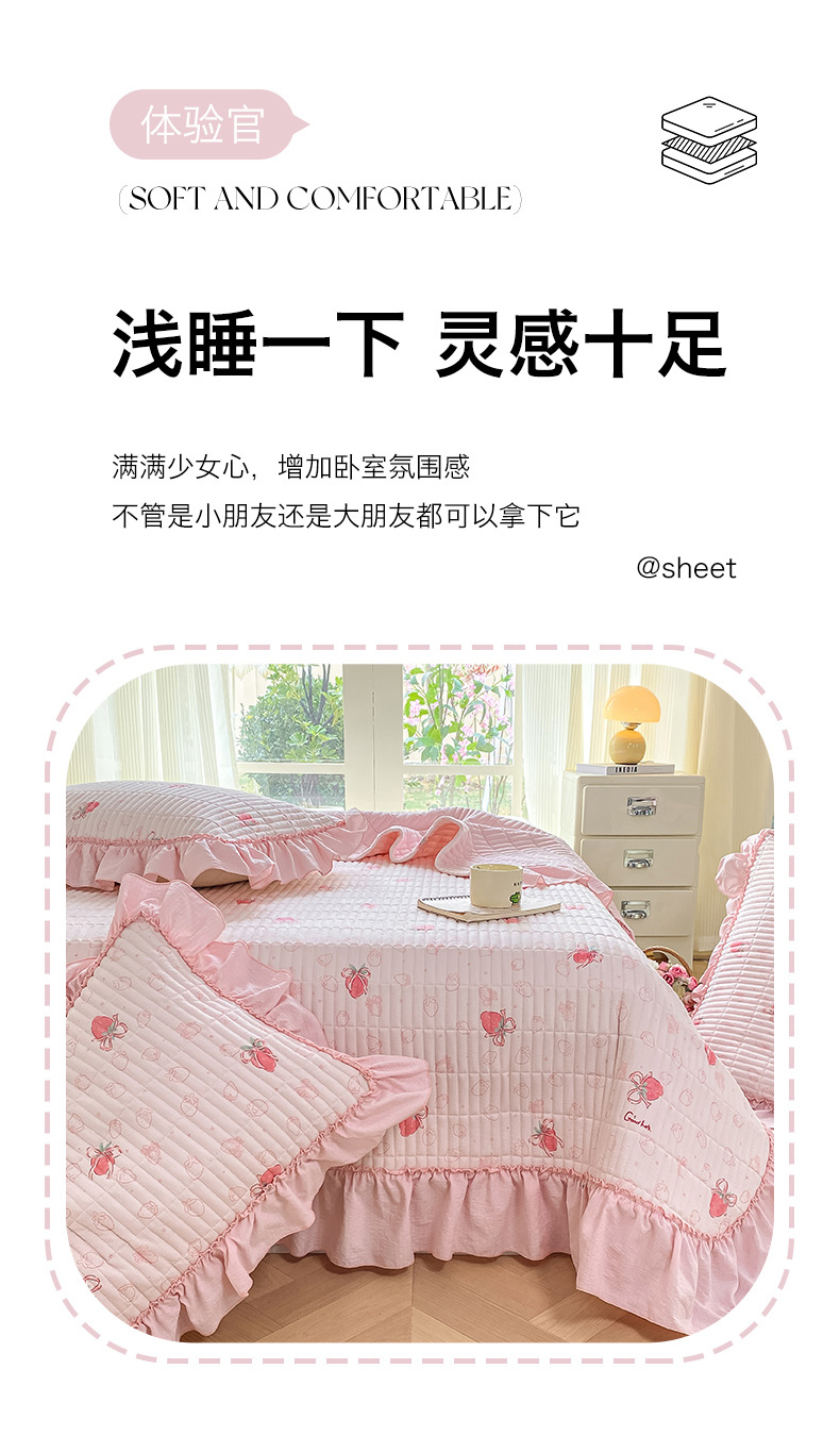 • 91家纺网 家纺一手货源 找家纺 眠势力 2026新款双层纱加厚夹棉云感皱皱纱大花边床单床盖三件套四季通用 花漾草莓【皱皱纱花边床盖】