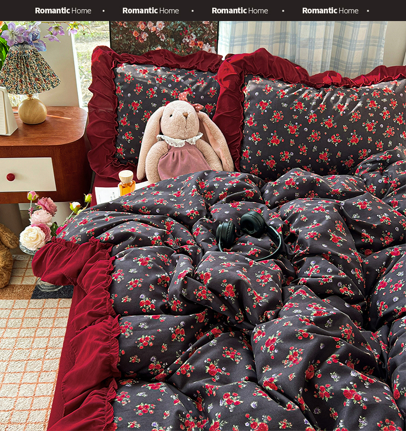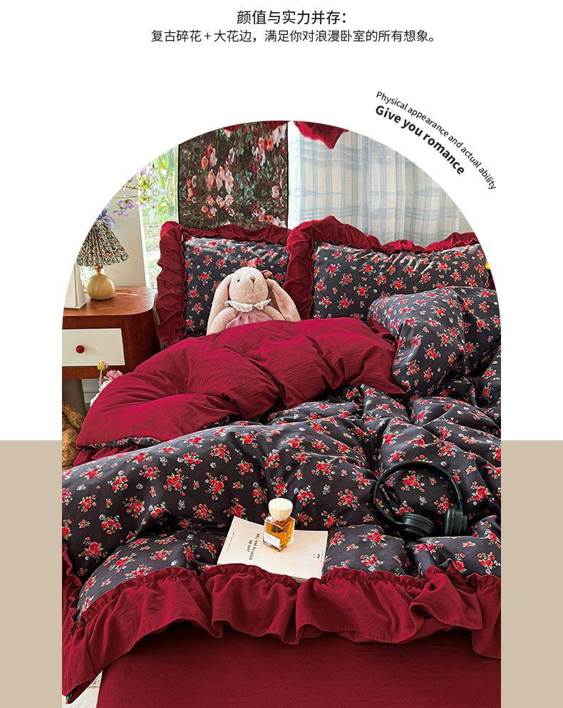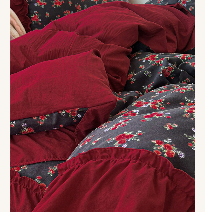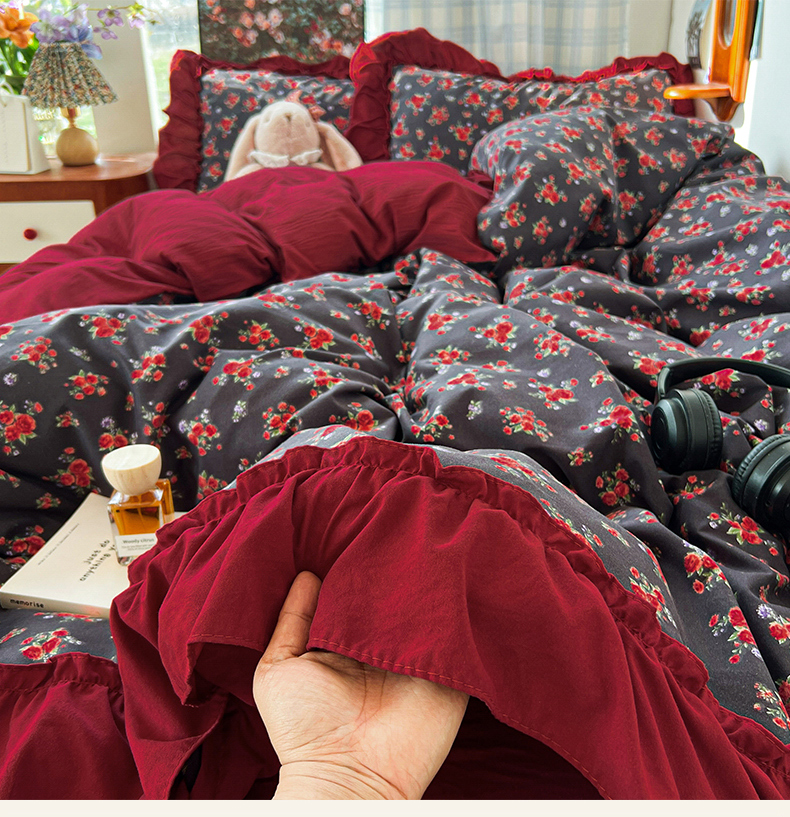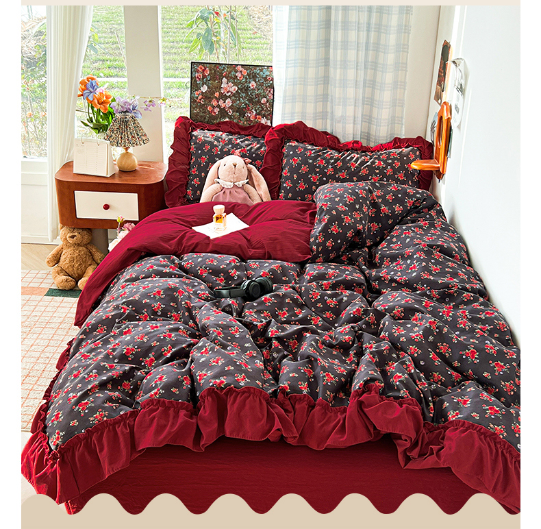 当前位置: 91家纺网 > 商品网购 > 床品套件 > 四件套 > 水洗棉四件套 > 花伞家居 2026新款韩系复古碎花古法水洗棉大花边四件套含买家秀 霓裳-红