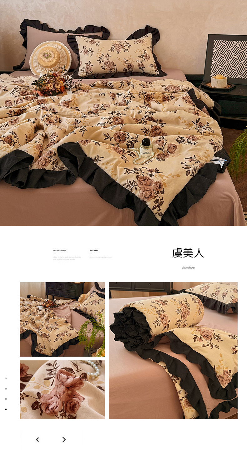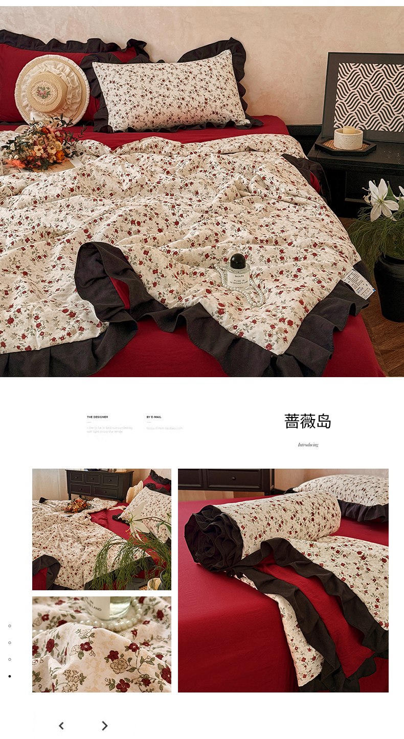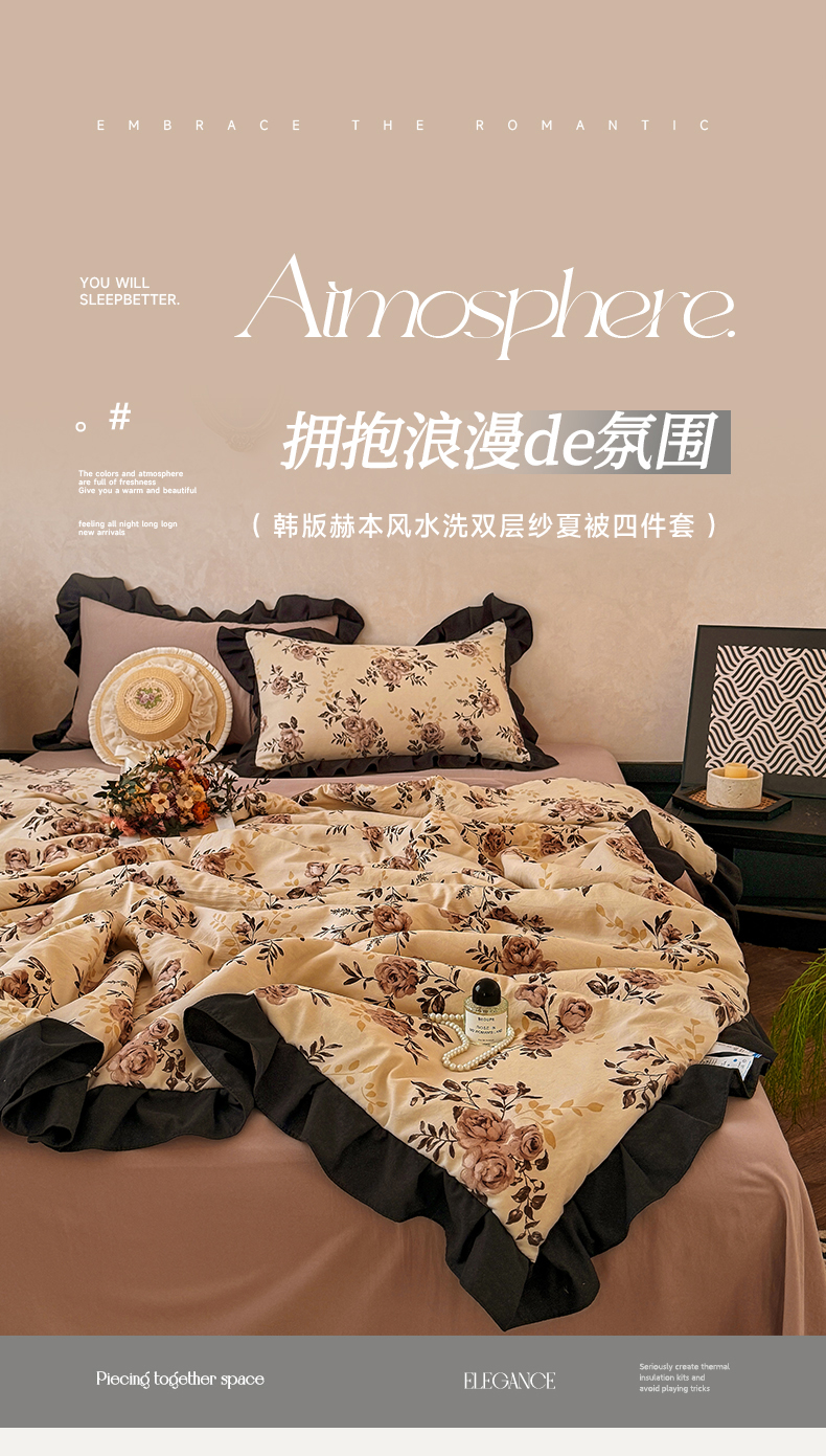 亿品家纺 2026直播爆款韩版赫本风花边款水洗双层纱夏被四件套【有买家秀加V】,茶墨,朵颜,蔷薇岛,山茶左岸,山奈,幸运,虞美人,组合图仅供展示