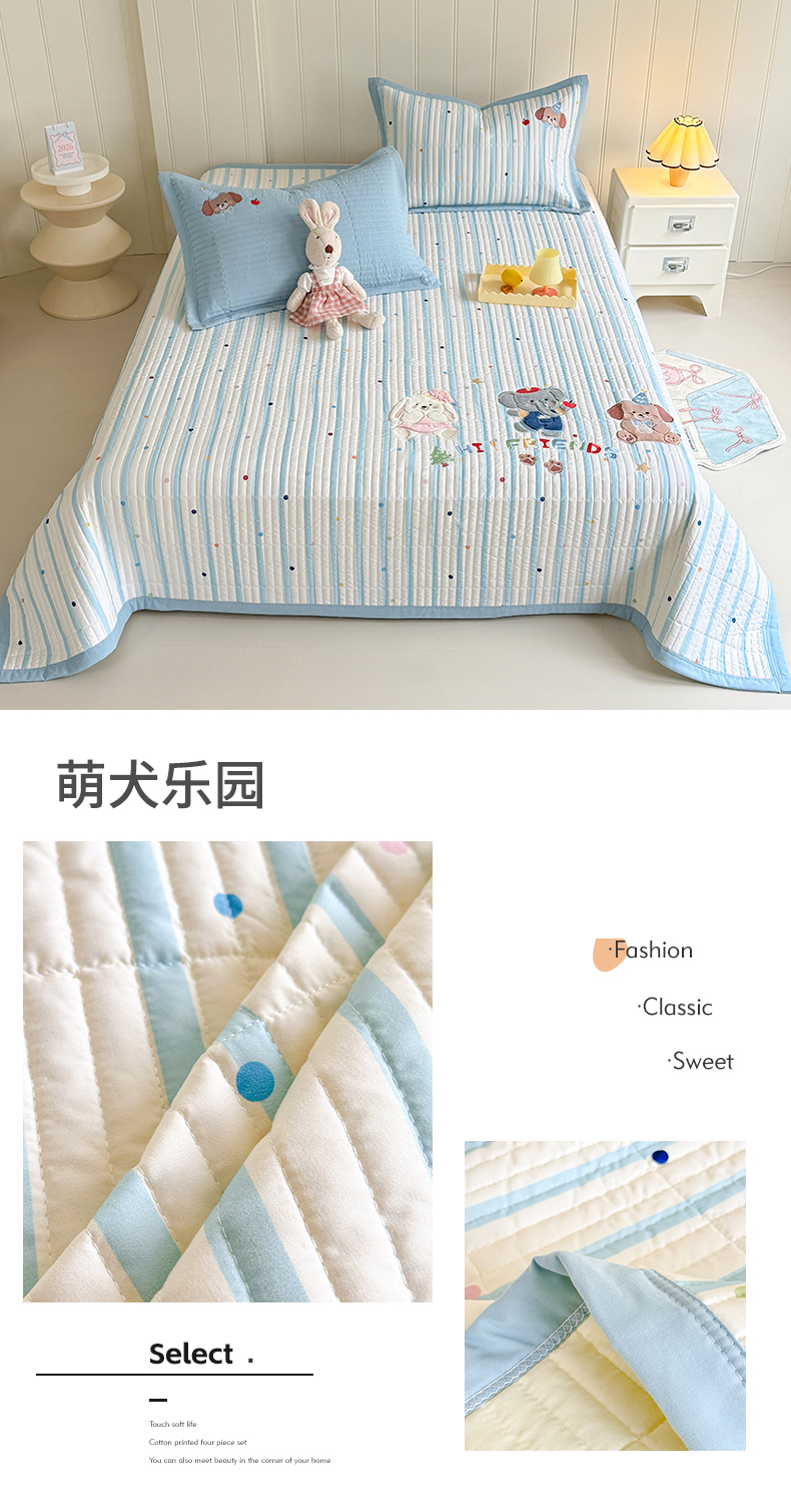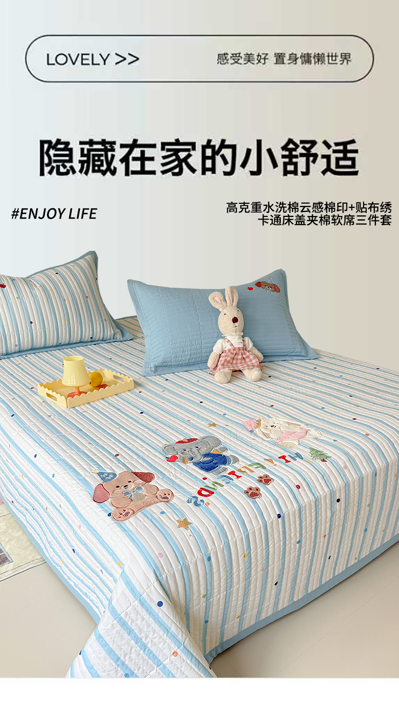 绒棉世家 2026新款高克重水洗棉云感棉印+贴布绣卡通床盖夹棉软席三件套 组合图仅供展示