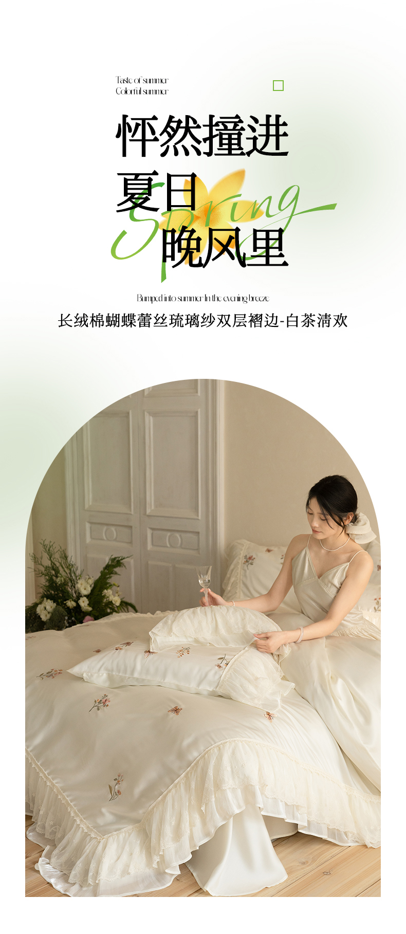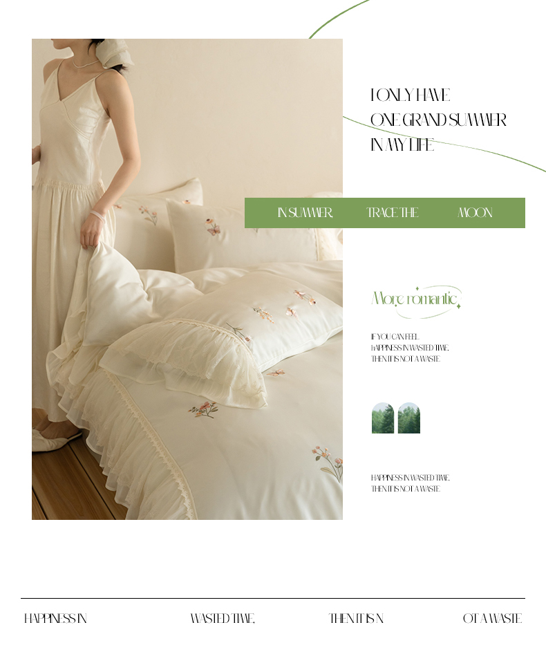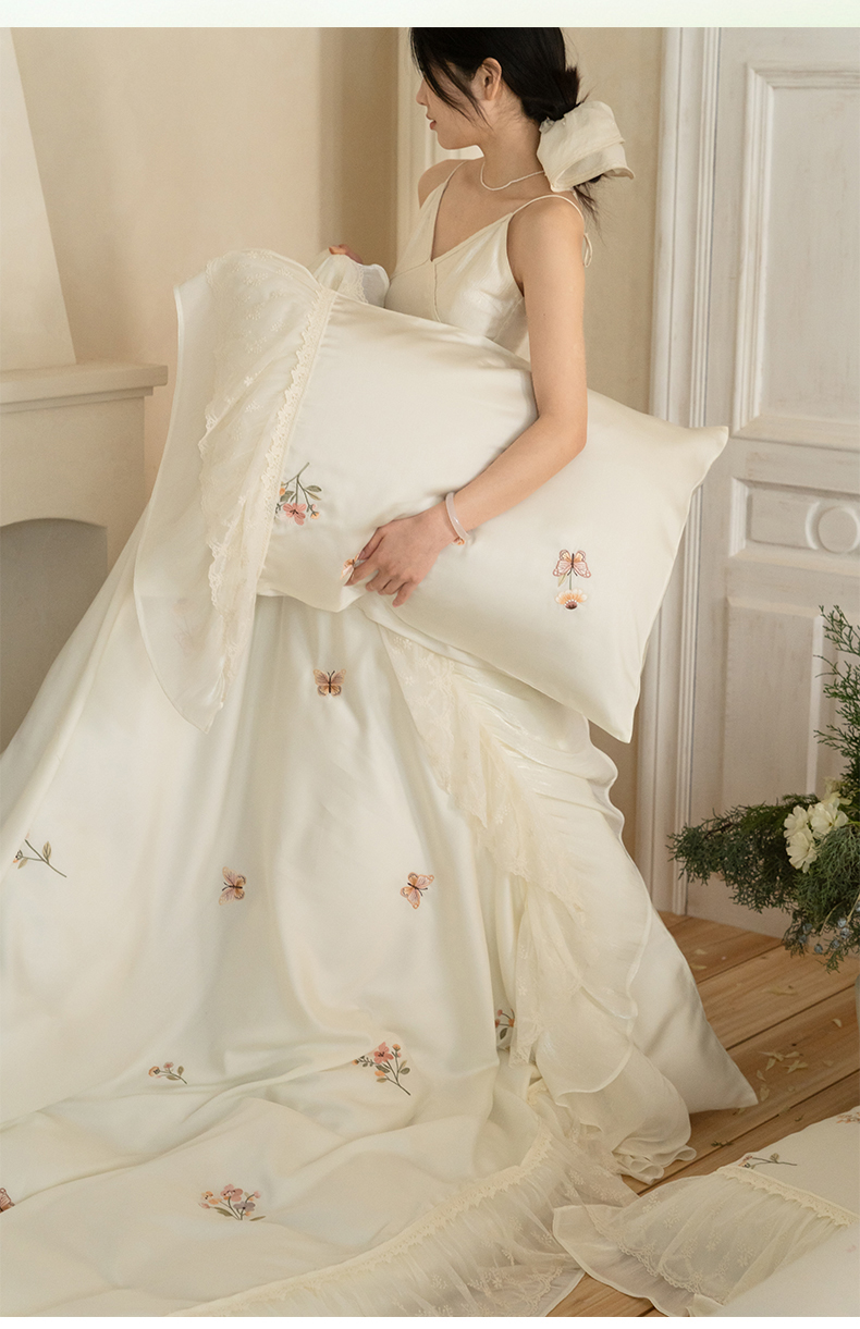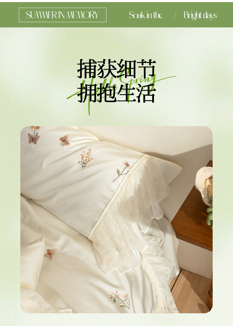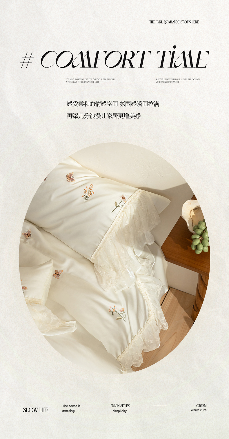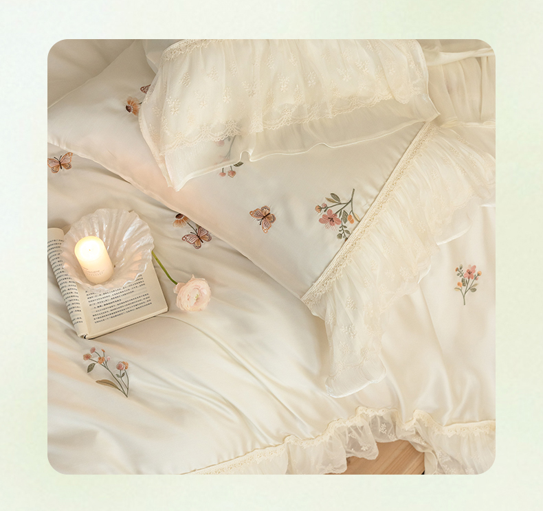 商品名称:(总)满座家居 2026新款100s全棉长绒棉四件套法式纯棉花边款四件套-白茶清欢(会员➖20 控价369)