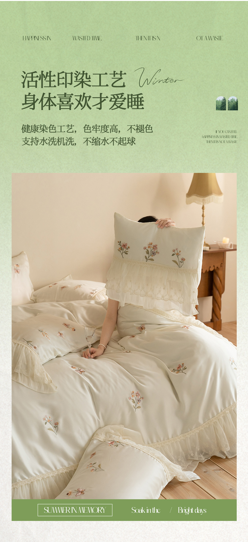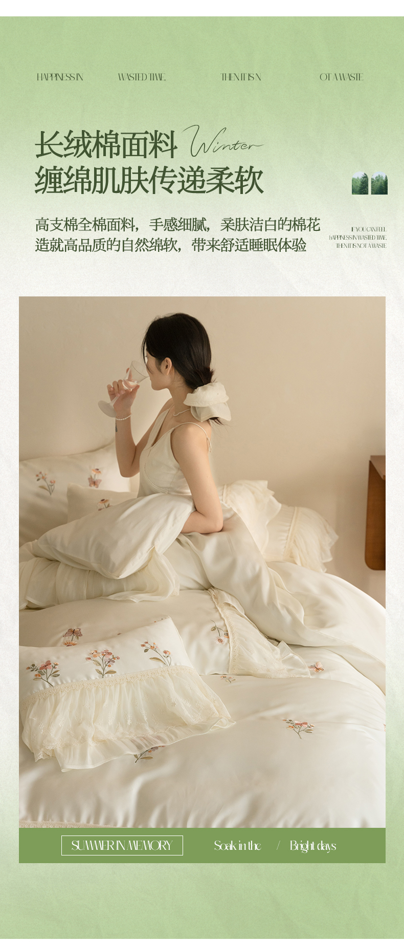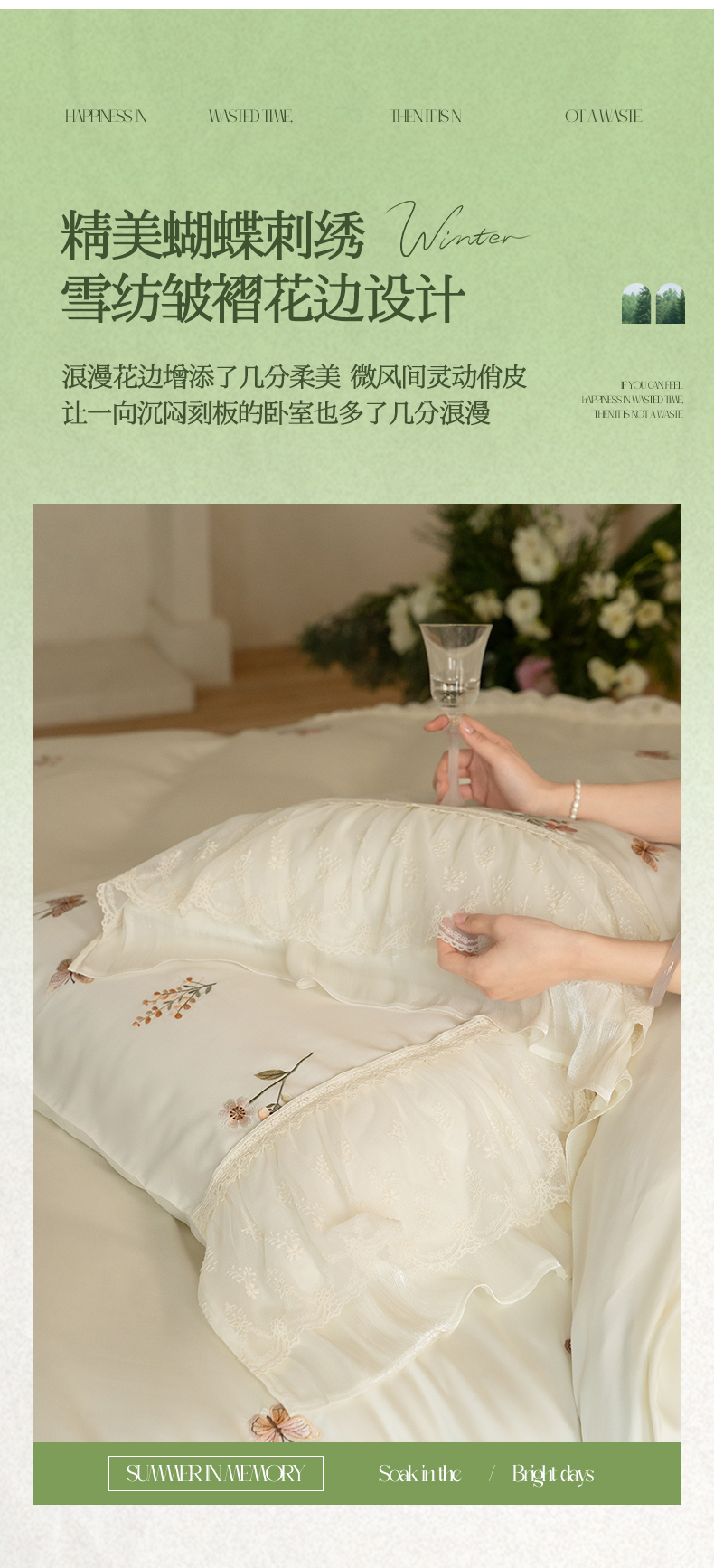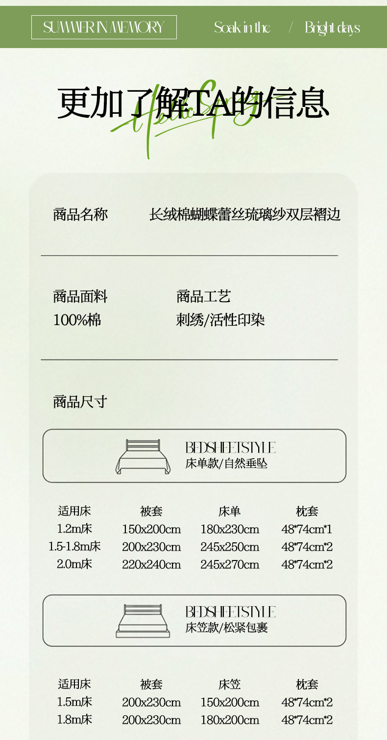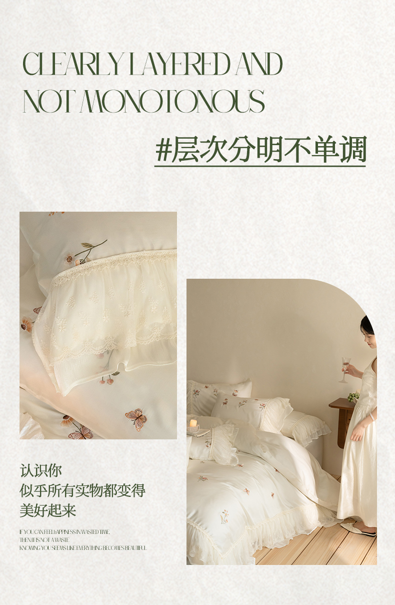 商品名称:(总)满座家居 2026新款100s全棉长绒棉四件套法式纯棉花边款四件套-白茶清欢(会员➖20 控价369)